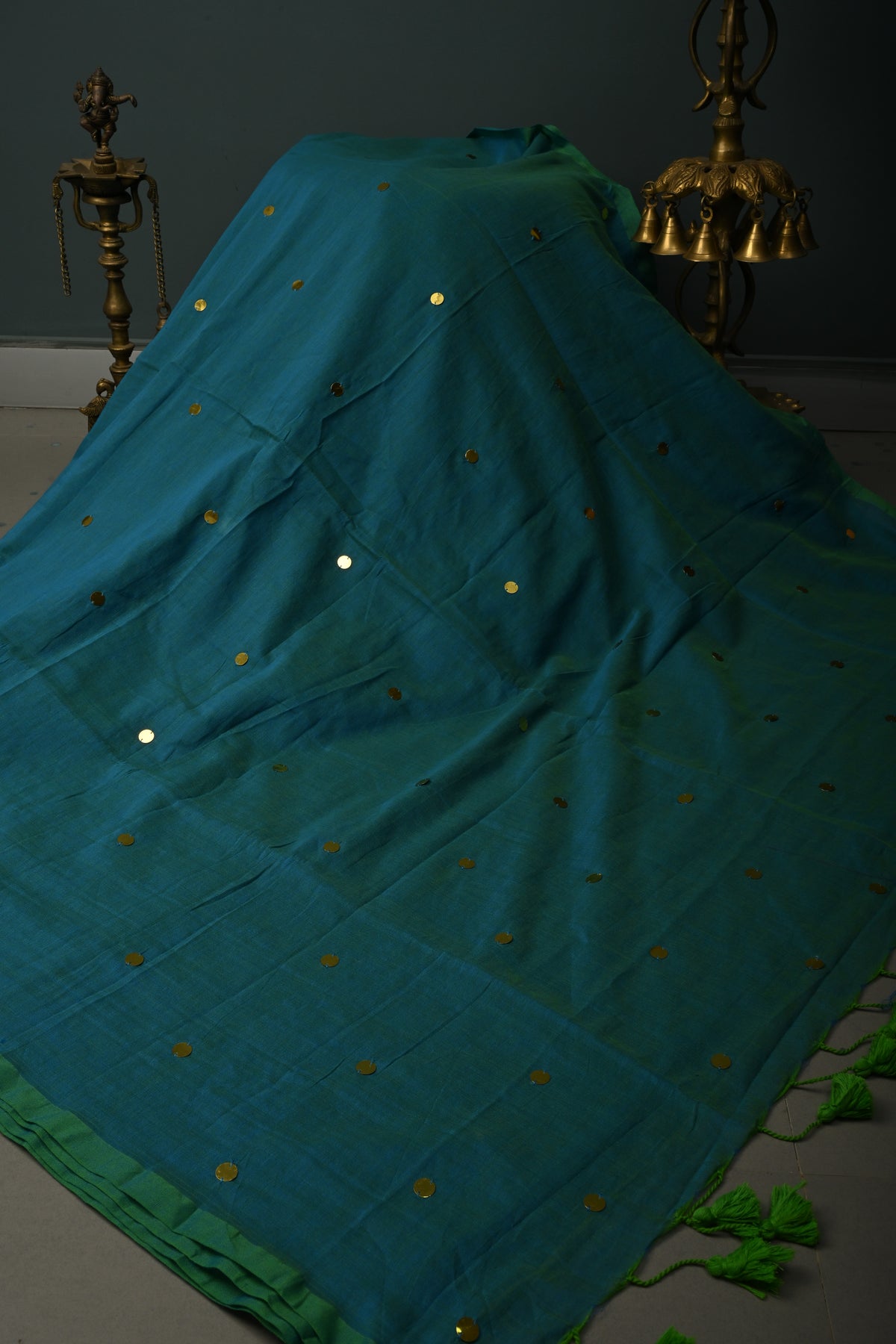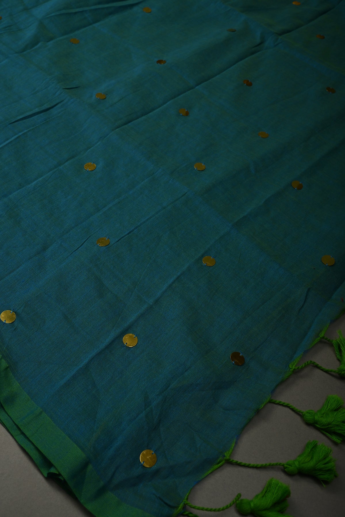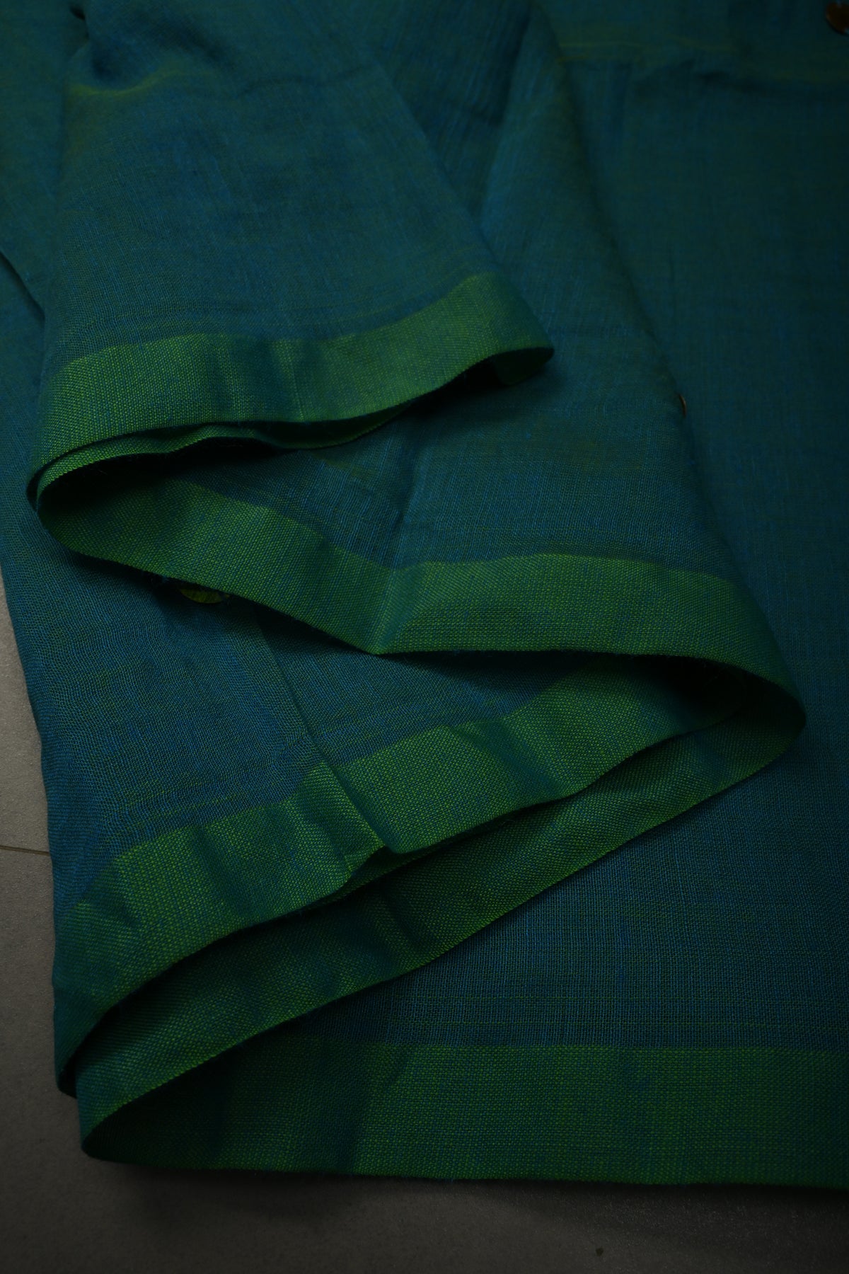 The Peacock Blue-Green Mercerized Mul Cotton Saree is a stunning fusion of vibrant hues and timeless elegance. Crafted from mul cotton, this saree offers a soft, breathable feel that drapes beautifully, ensuring comfort throughout the day. The Peacock Blue-green color combination adds a refreshing, lively touch, while the intricate Tikki work along the borders enhances the traditional appeal with exquisite detailing. Long, delicate tassels at the pallu create a graceful and flowing finish. Please note, this saree does not come with a blouse piece, allowing you to pair it with your preferred design for a personalized look. Ideal for weddings, festive occasions, and special celebrations, this saree is the perfect blend of style and comfort.