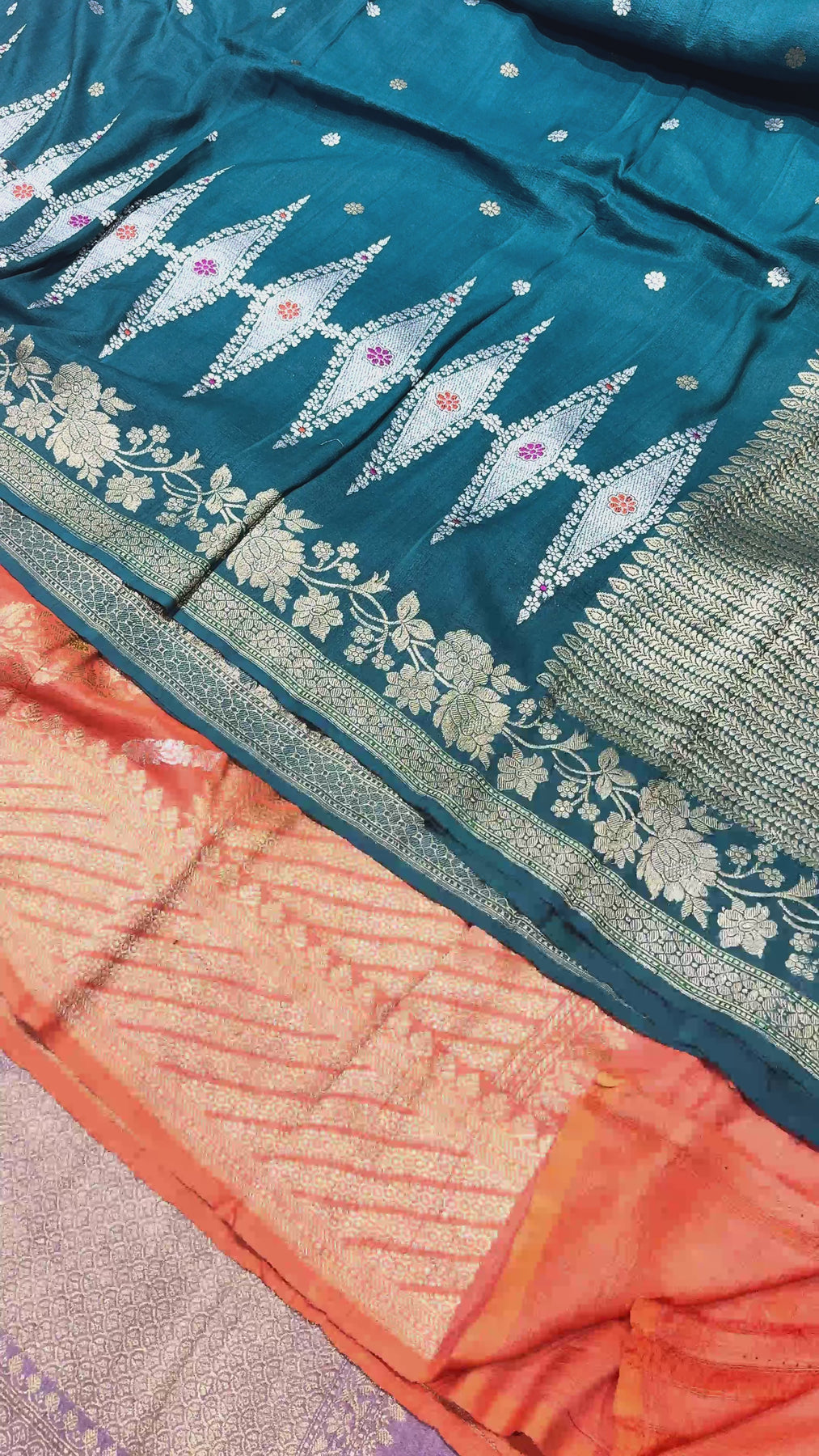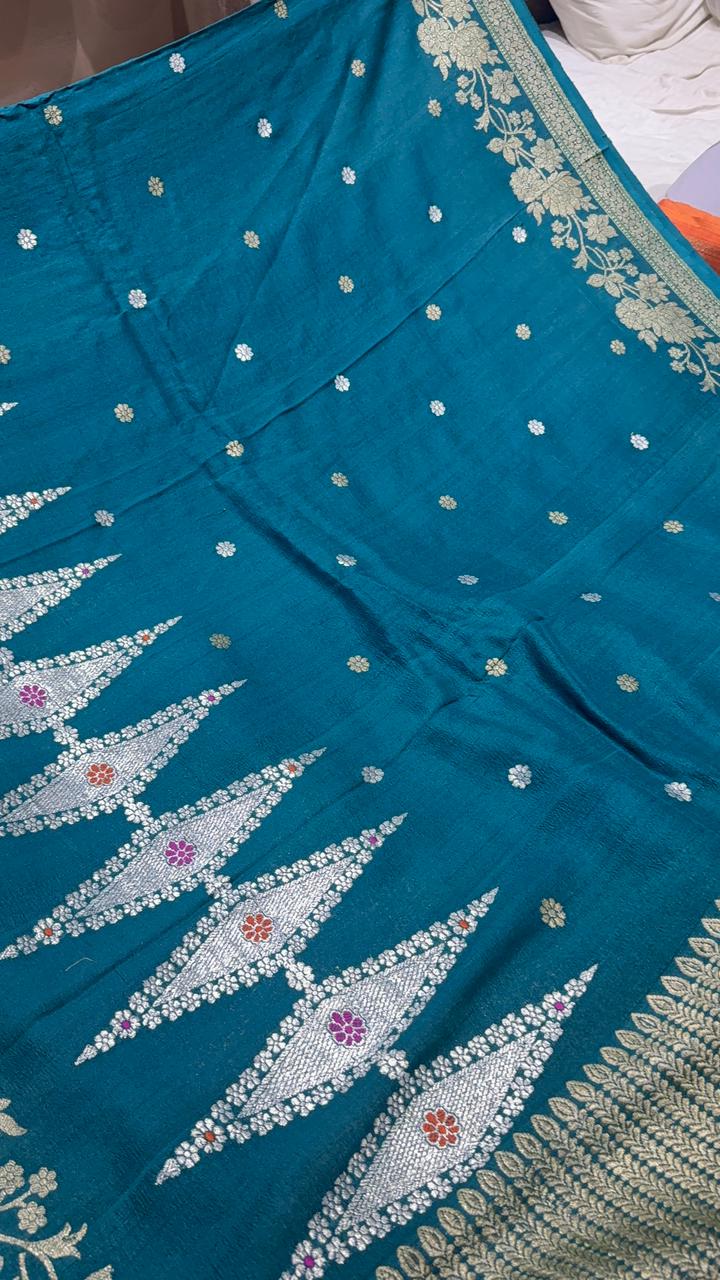 Celebrate timeless elegance with this Peacock Green Banarasi Tussar Georgette Saree, featuring a captivating floral design that beautifully complements its rich hue. Crafted from lightweight tussar georgette, this saree offers a graceful drape with a soft texture that enhances your silhouette effortlessly.