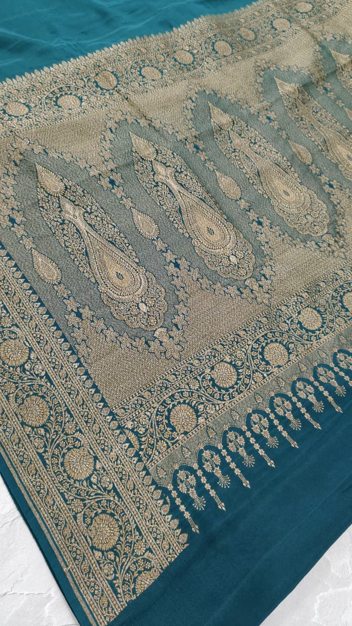 This Peacock Green Pure Mysore Crepe Silk Saree is a stunning embodiment of elegance and tradition. Crafted from Mysore crepe silk, the saree features a peacock green hue that radiates vibrancy and sophistication. Complemented by a beautifully woven zari border, it highlights exquisite craftsmanship and adds a regal touch to the smooth, flowing fabric. Perfect for weddings, festive occasions, and special celebrations, this saree promises a graceful and timeless appeal.