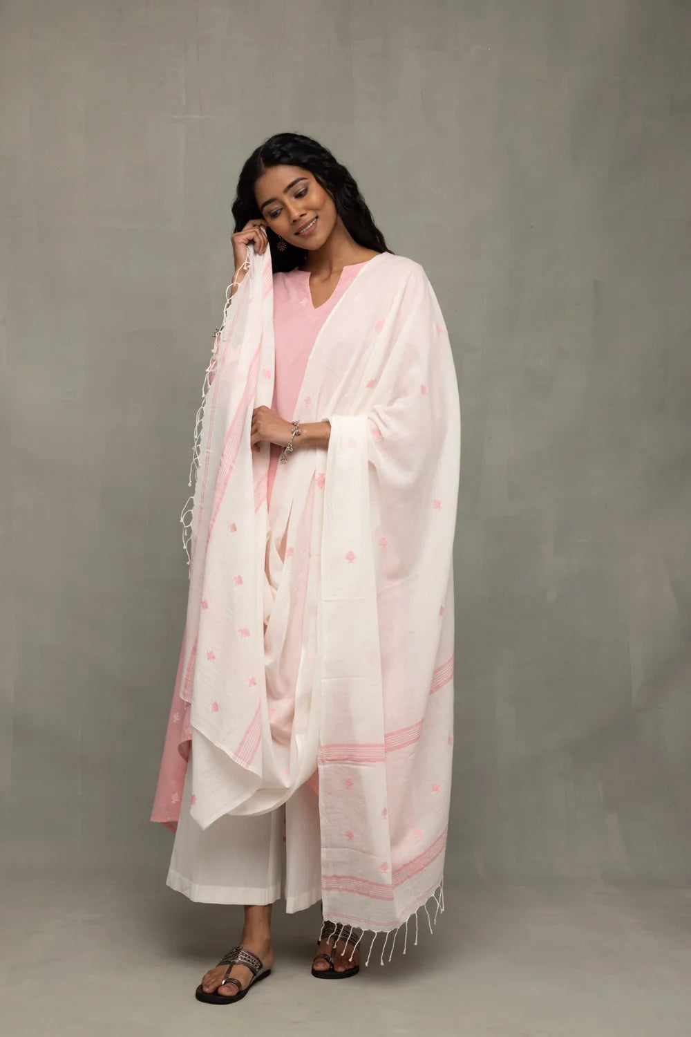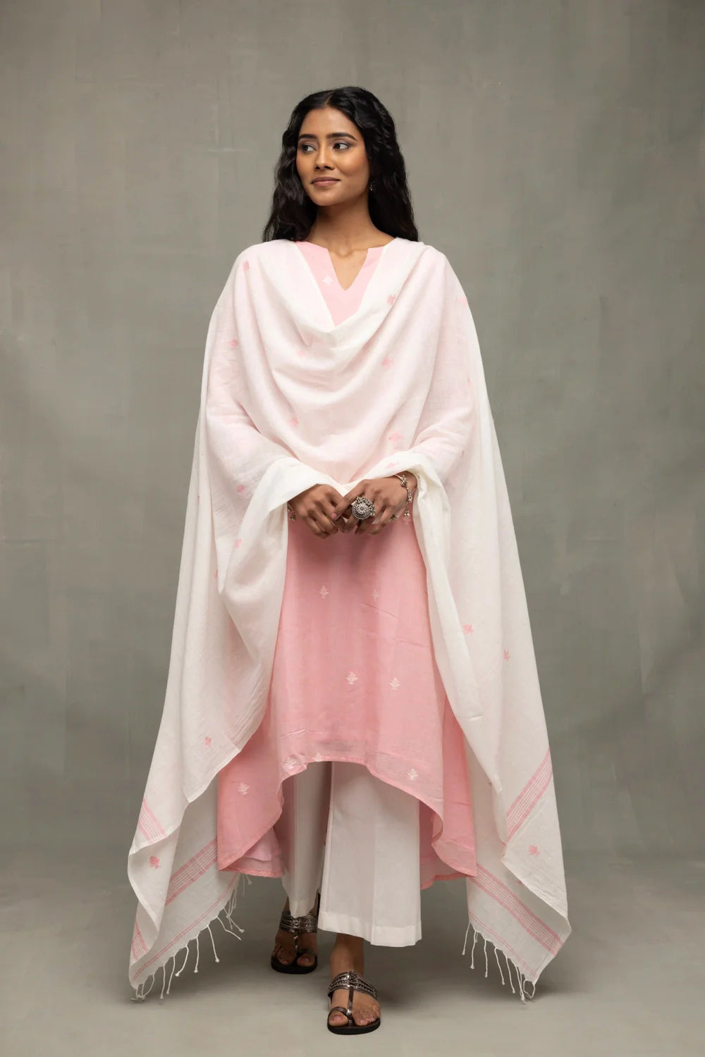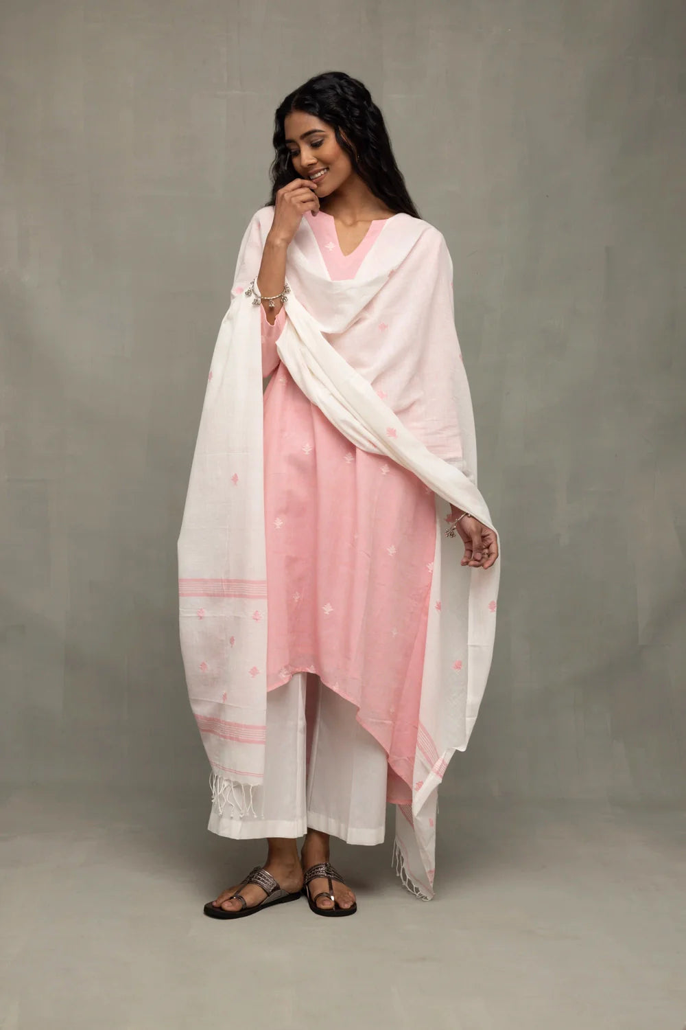 A Petal Pink kurta paired with a crisp White dupatta and trousers. The ensemble features contrasting white and pink Buti (floral leaf) hand-woven motifs throughout. Experience the sheer artistry of traditional weaving with this exquisite Jamdani ensemble. Celebrated for its feather-light feel and intricate patterns paired with comfortable, wide-leg white palazzos for a relaxed yet tailored look and stunning, lightweight white dupatta adorned with matching pink Jamdani weaves.