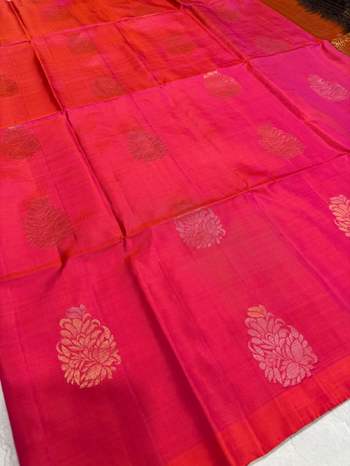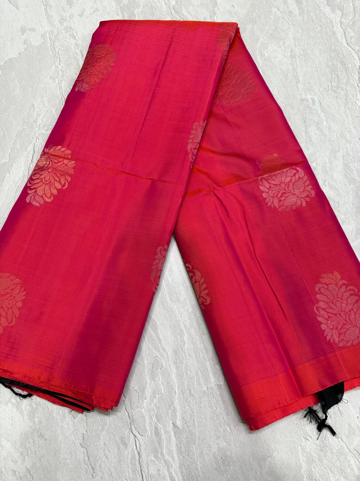 This Pink Dual Tone Borderless Kanjivaram Soft Silk Saree is a beautiful fusion of traditional artistry and modern grace. Woven in a mesmerizing dual-tone of pink that shifts with light, the saree features delicate gold and silver buttas scattered elegantly across the body, adding a touch of shimmer and sophistication. Its borderless design offers a sleek, contemporary appeal, while the contrast pallu enhances the saree with intricate traditional motifs, lending it a regal finish. Crafted from soft silk for a graceful drape, this saree is perfect for weddings, festive gatherings, and grand celebrations.