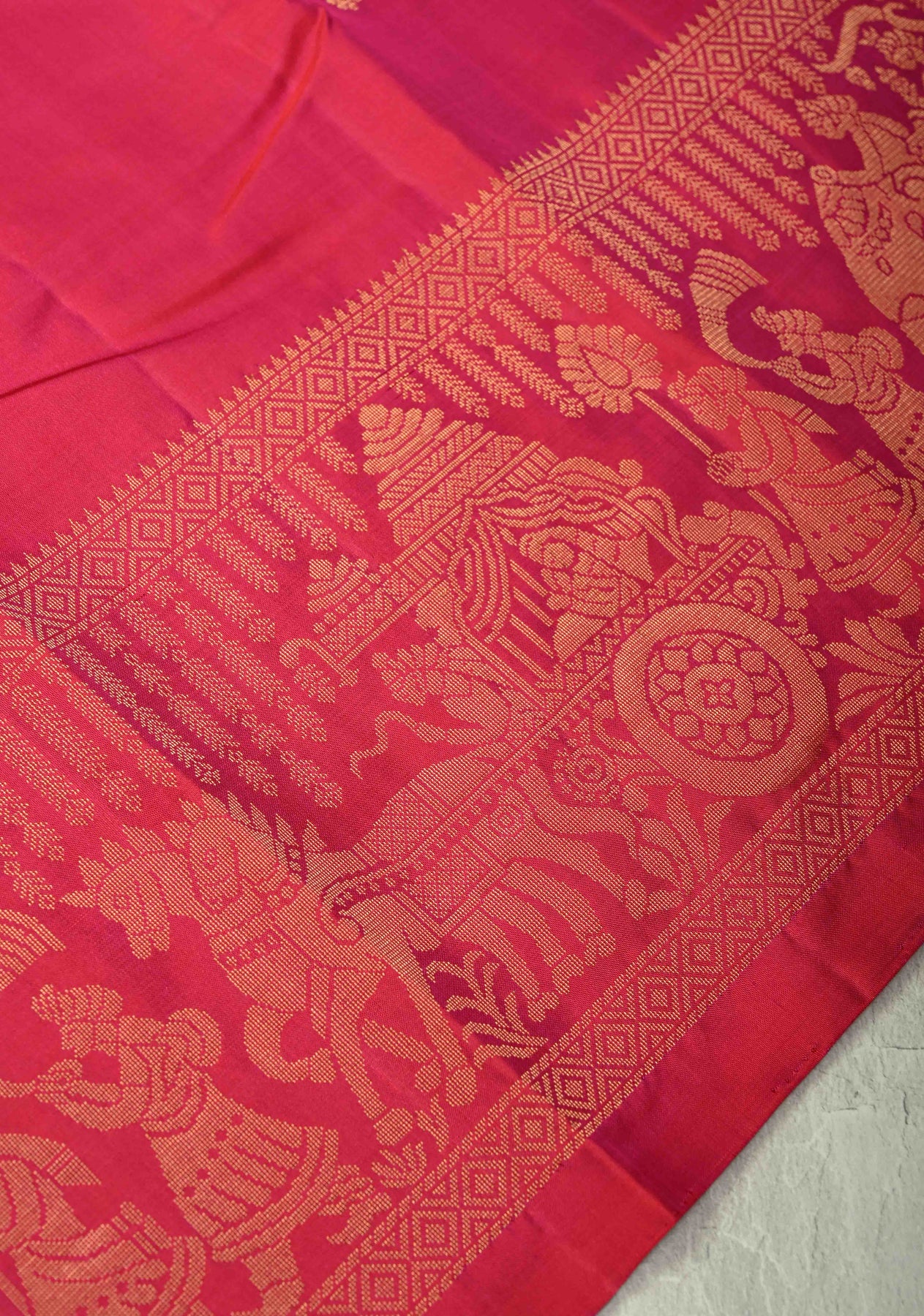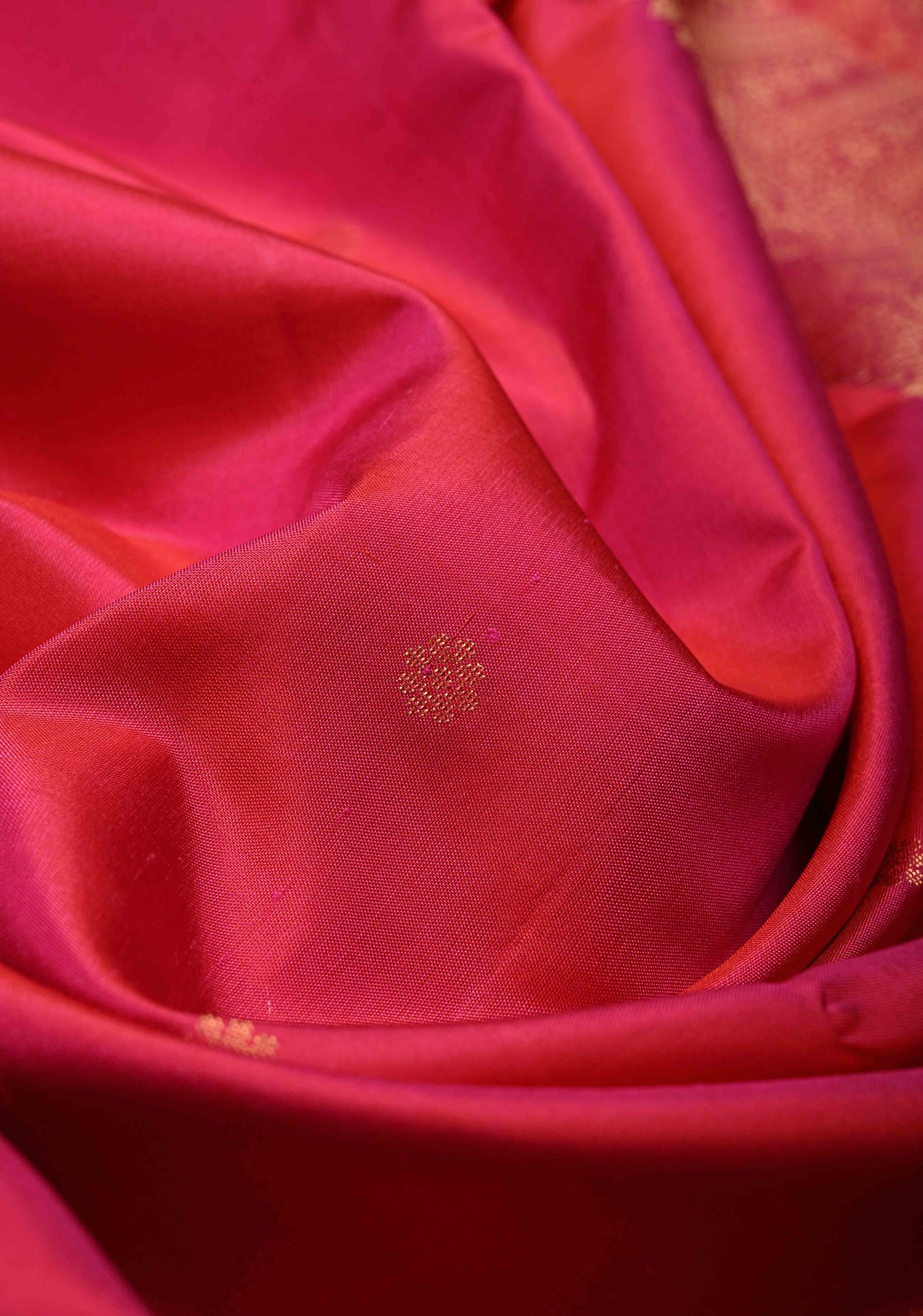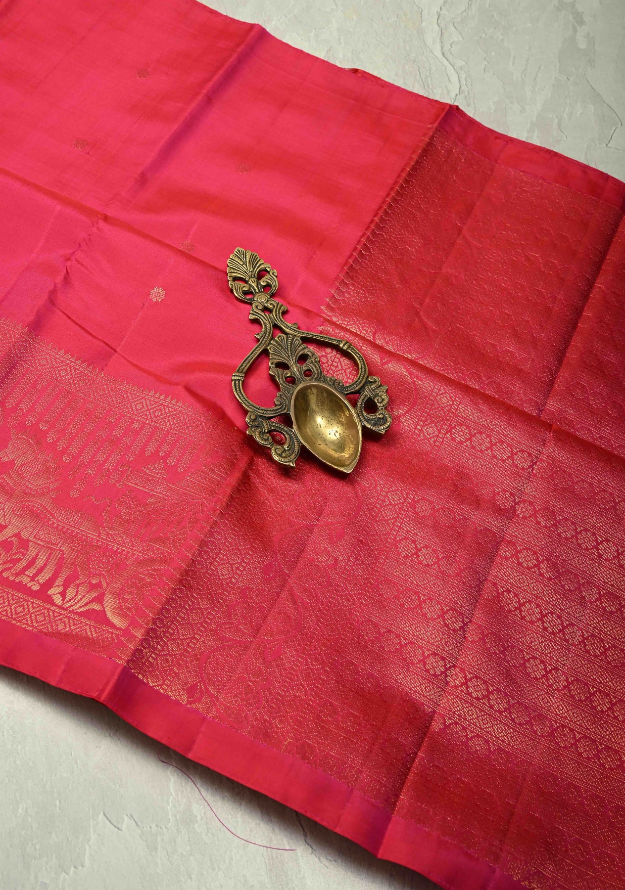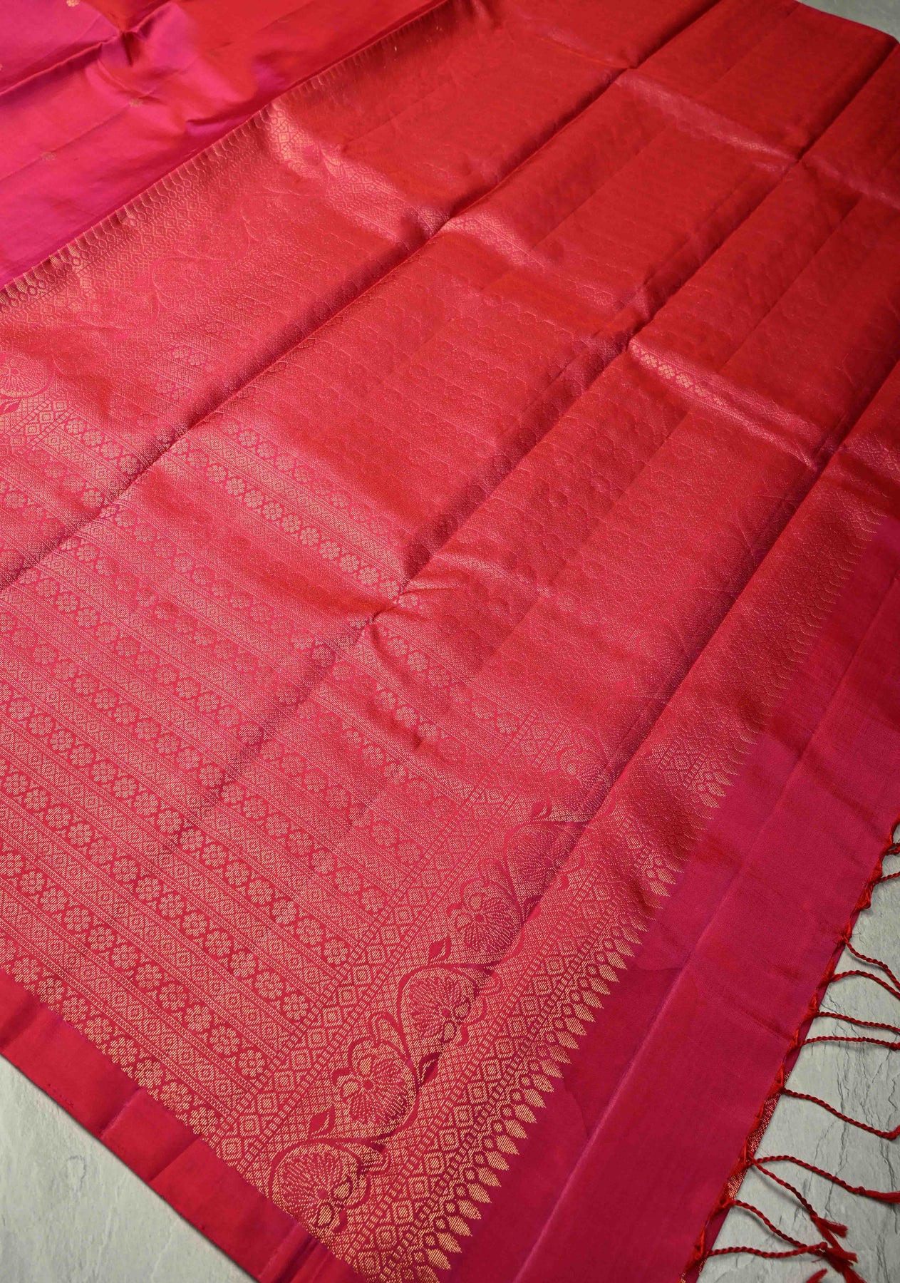 The Pink Dual Tone Kanjivaram Soft Silk Saree with Chunri Buttis and Procession Zari Border is a masterpiece of traditional artistry and modern elegance. Woven from soft Kanjivaram silk, it offers a luxurious, smooth drape that flatters every silhouette. The enchanting dual-tone pink shade adds vibrancy and depth, while the delicate Chunri buttis enhance the saree with intricate, ethnic detailing. The ornate Procession zari border provides a regal golden accent, making it ideal for weddings, festive occasions, and grand celebrations. Pair it with a matching or contrasting blouse and statement jewelry for a timeless, majestic ethnic look.