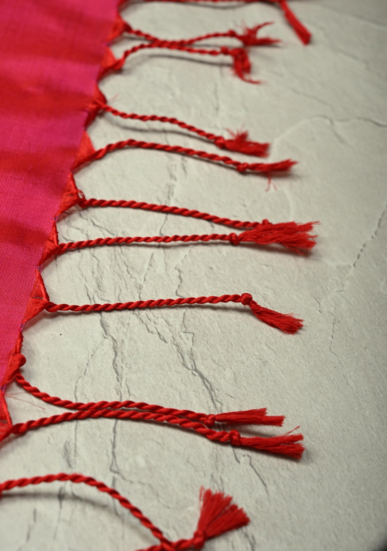 This saree is ready to wear with fall and pico done. Handmade silk tassels as seen in the pic adorn the pallu and add more grace to it. An unstitched blouse fabric is included.