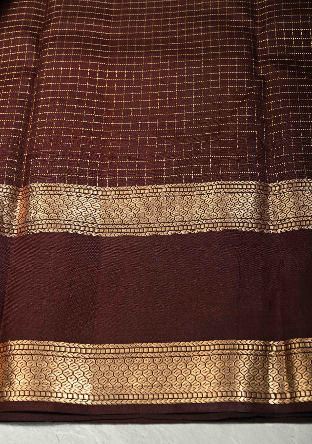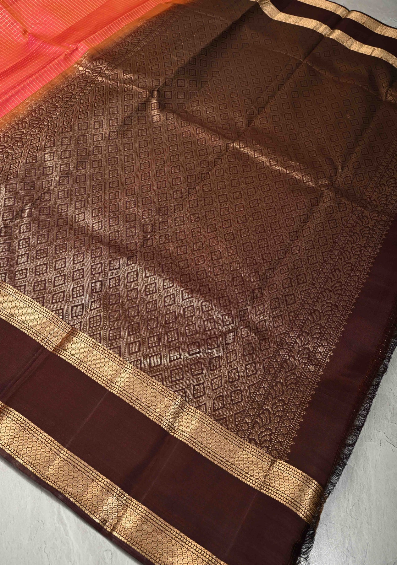 The lively pink-orange dual-tone body is enhanced with shimmering podi-kattam zari checks, creating a sophisticated pattern that captures attention. A contrasting Coffee Brown Rettiapet zari border adds depth and a regal finish, making this saree a perfect blend of traditional artistry and contemporary vibrance. Ideal for weddings, temple ceremonies, and festive gatherings.