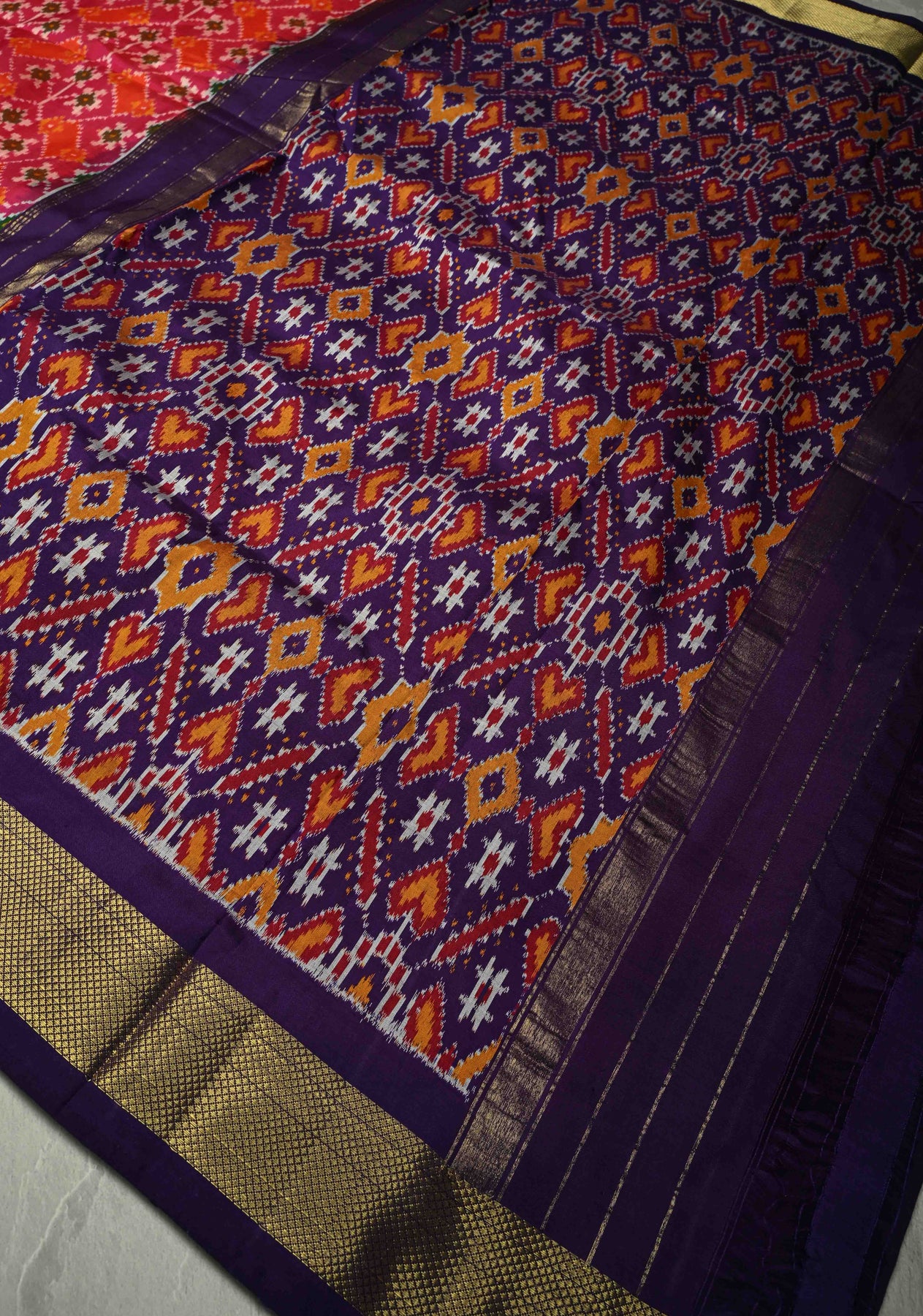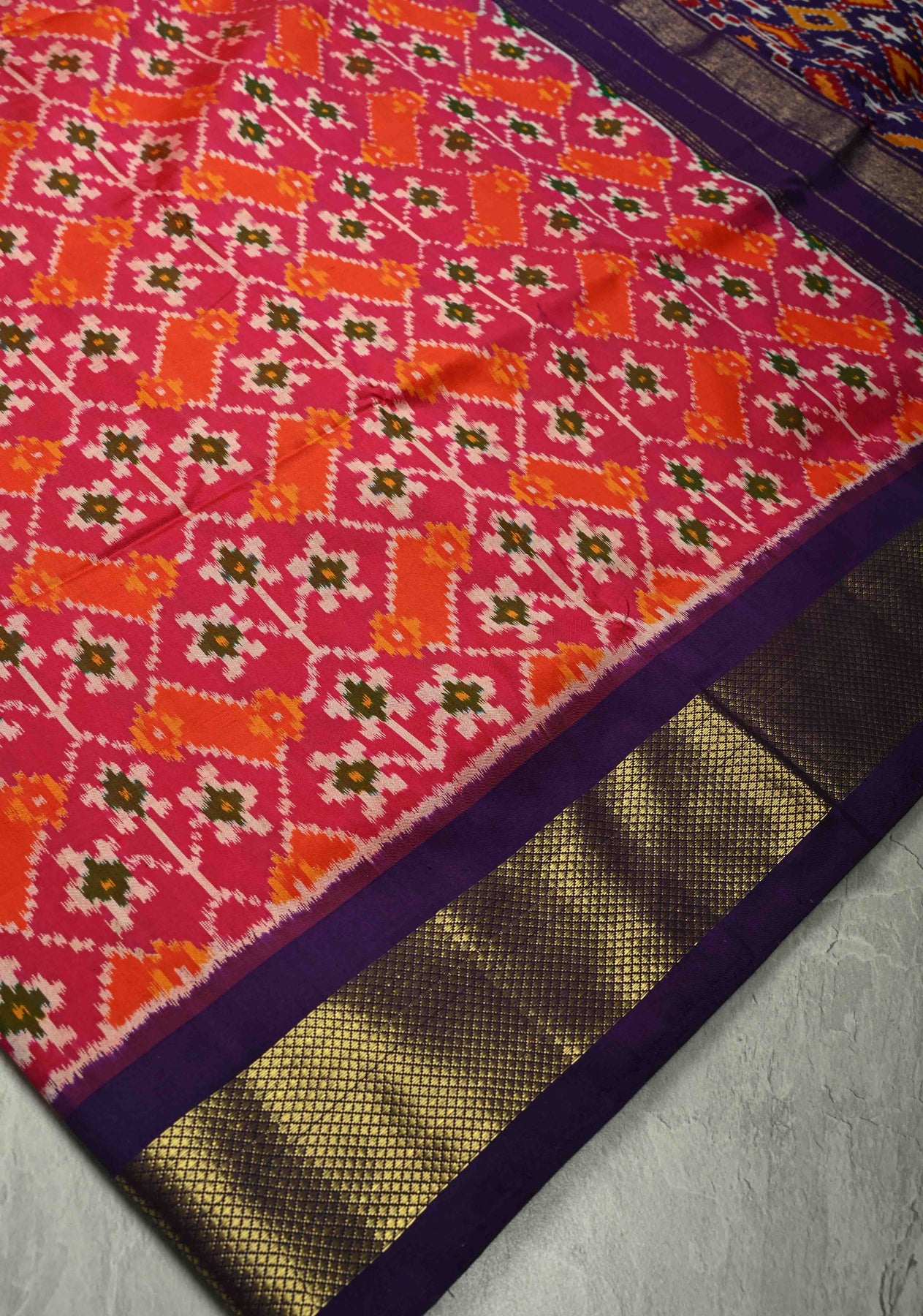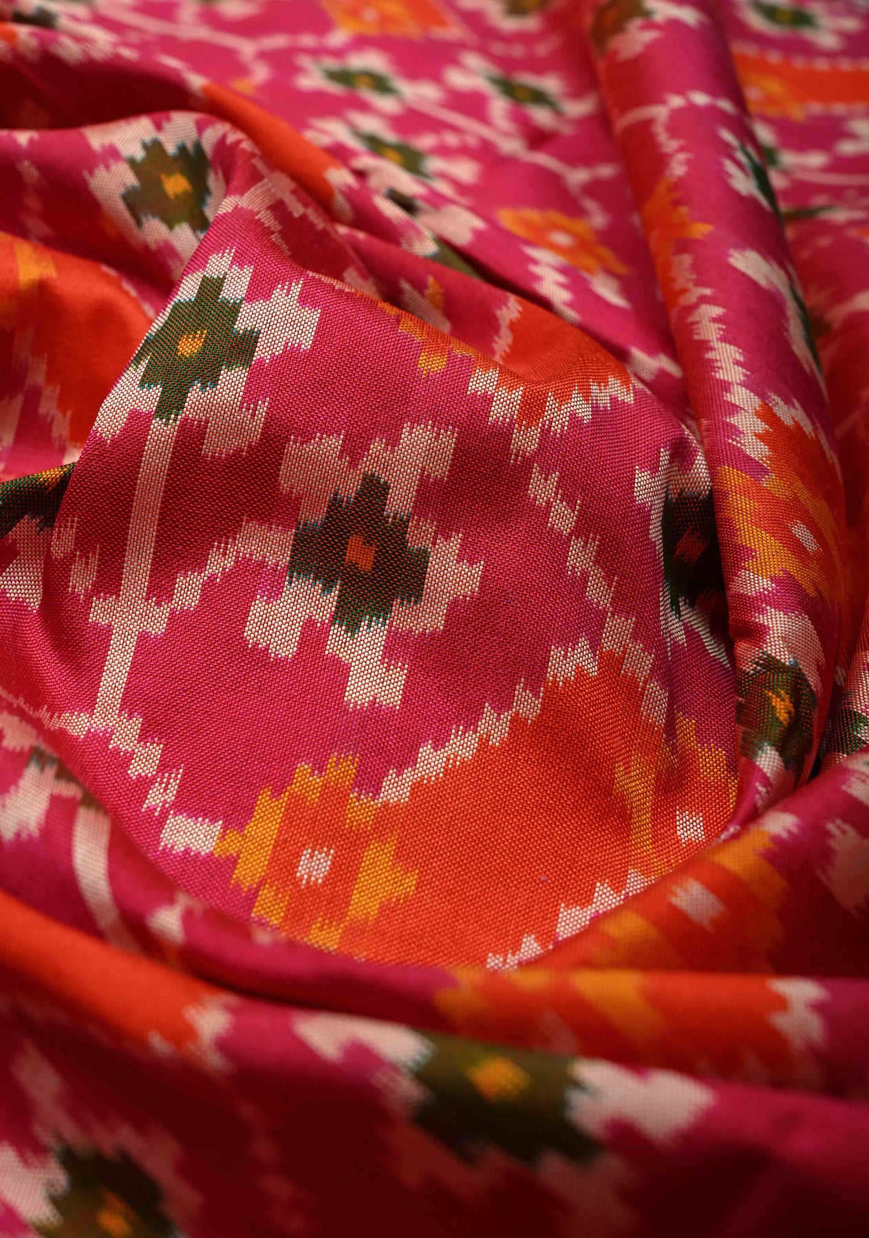 The Hot Pink Pochampally Ikkat Pure Silk Saree is a vibrant celebration of traditional Indian weaving and contemporary style. Crafted from pure silk, this saree features the signature Pochampally Ikkat geometric patterns, adding a dynamic and artistic charm. The body is adorned with intricate brocade work that enhances its luxurious appeal, while the contrast zari border adds a regal touch, elevating the saree’s overall elegance. Lightweight yet opulent, it drapes beautifully, making it perfect for weddings, festive occasions, and special celebrations. This saree seamlessly combines heritage craftsmanship with modern vibrancy, making it a standout piece in any wardrobe.