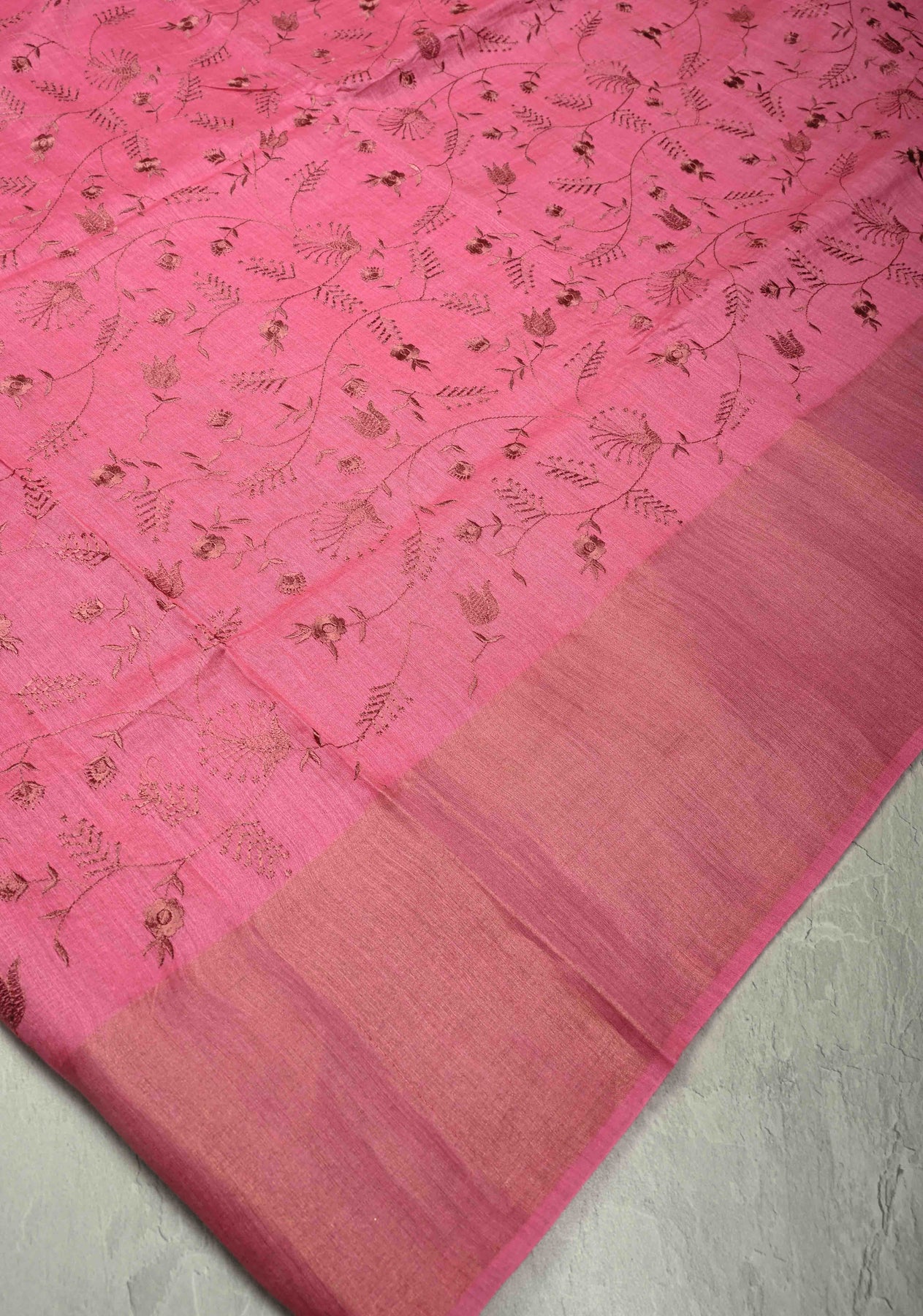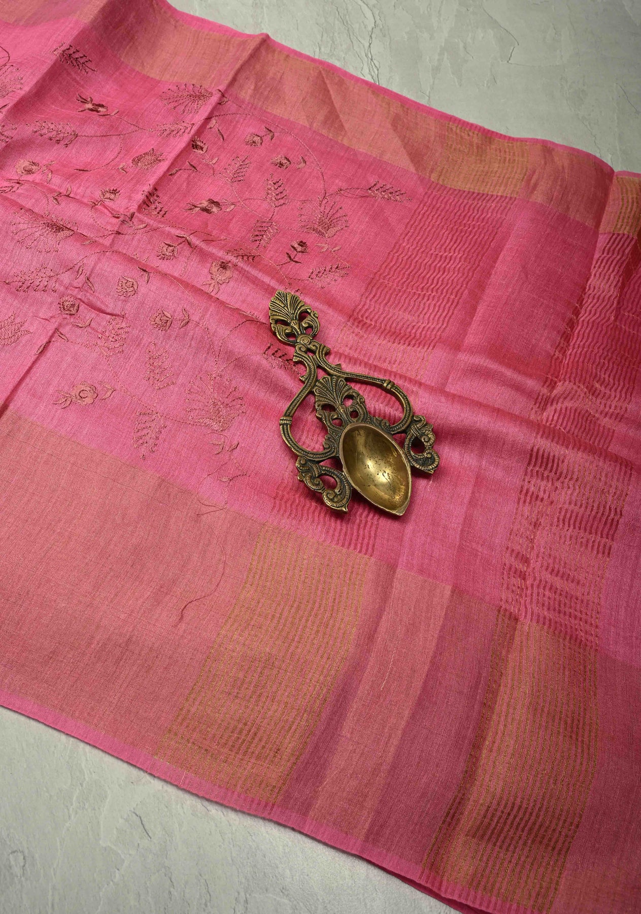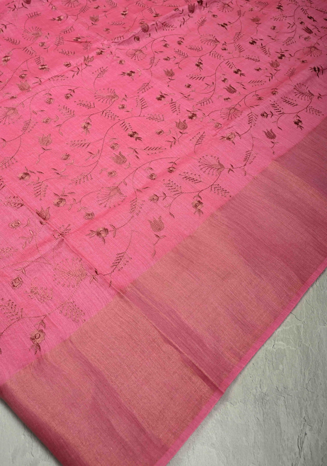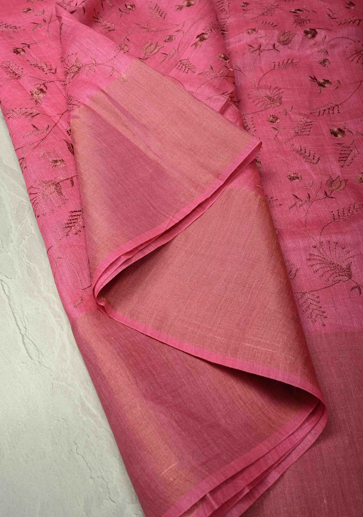 Experience the delicate elegance of this Pink Tussar Silk Saree. The raw, earthy texture of the Tussar is softened by a beautiful pink hue, serving as a canvas for intricate Floral Embroidery. The look is completed by a Muted Zari Border, which offers a subtle, antique shimmer rather than a bold gleam. This saree is a perfect blend of feminine charm and artisanal texture.
