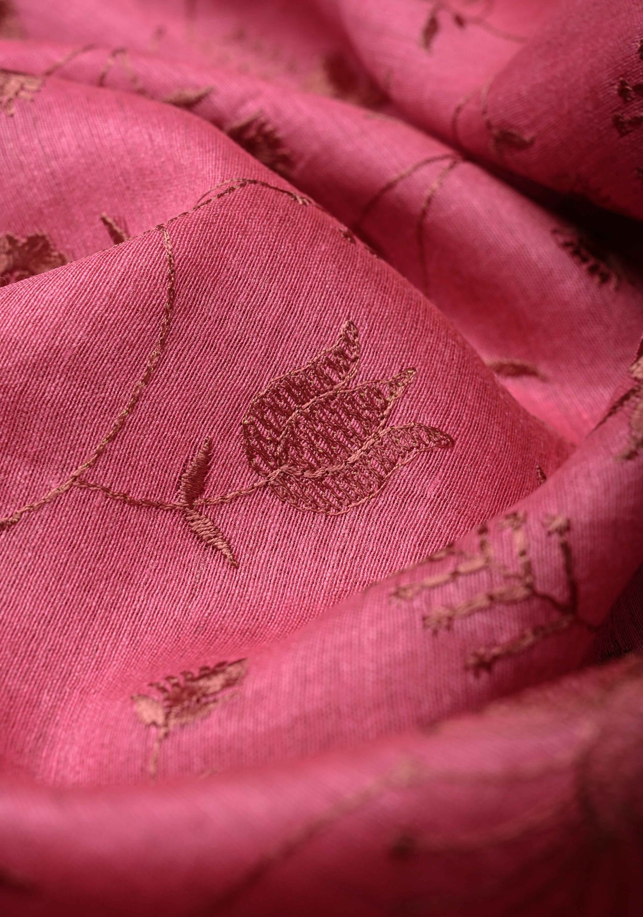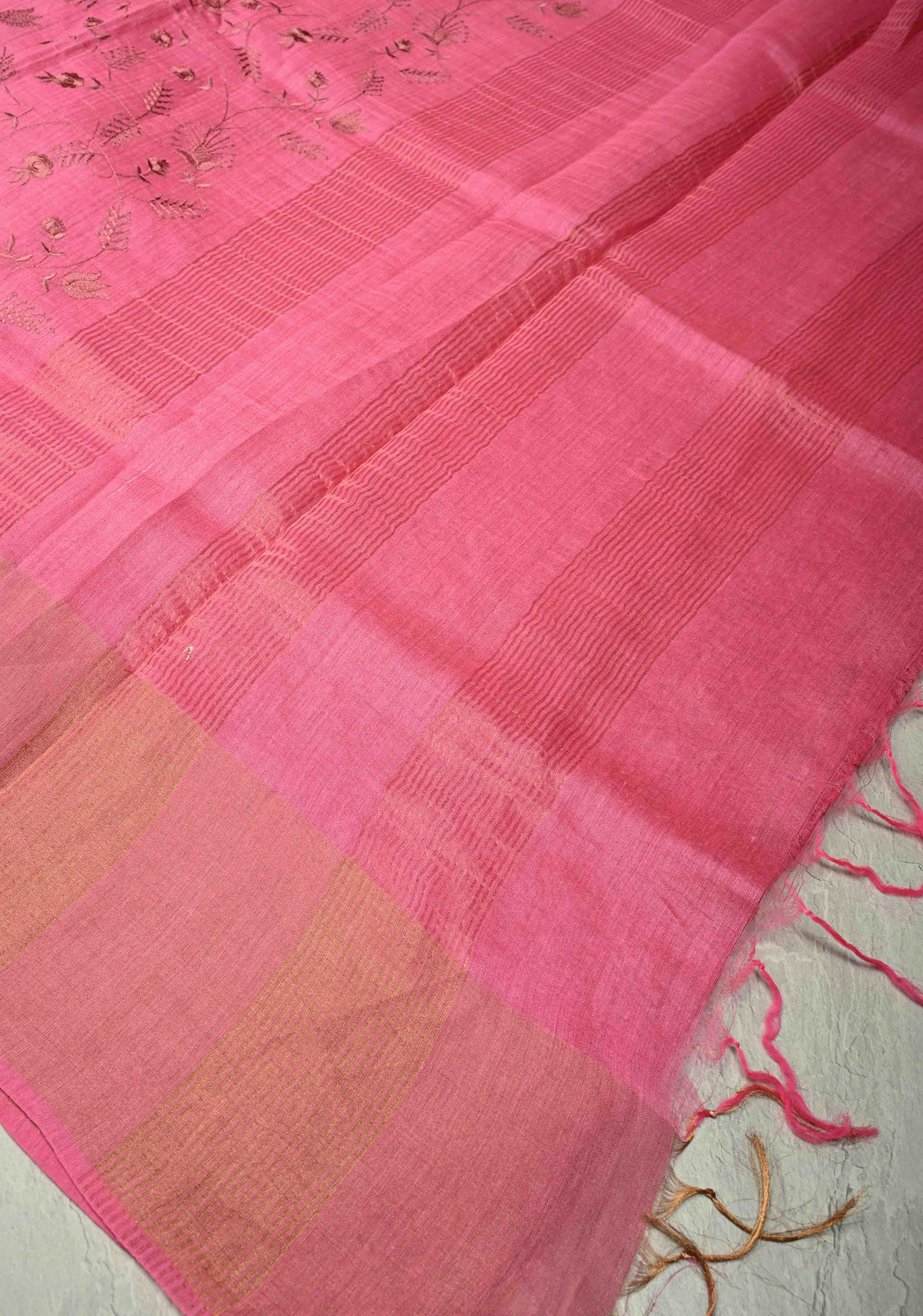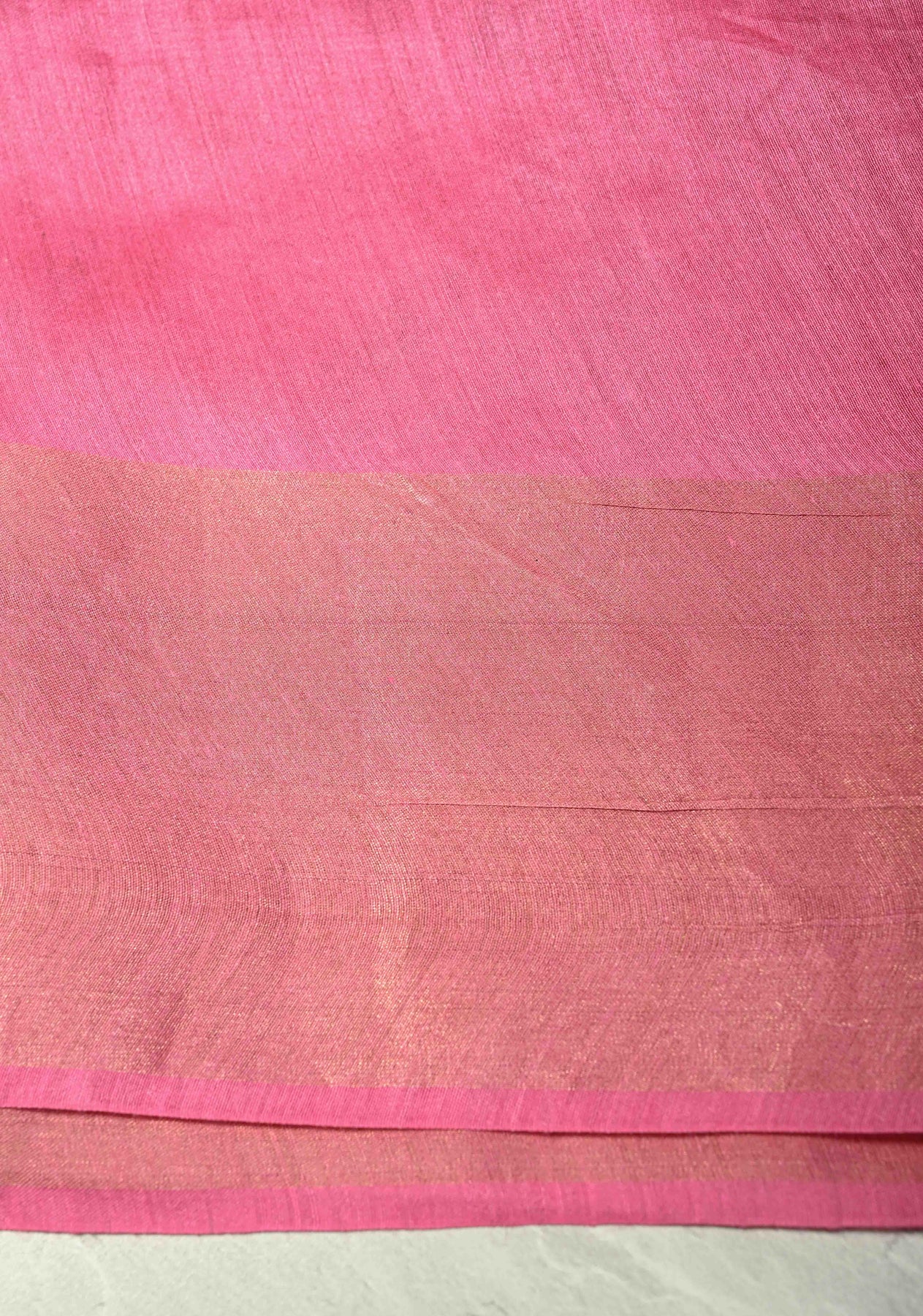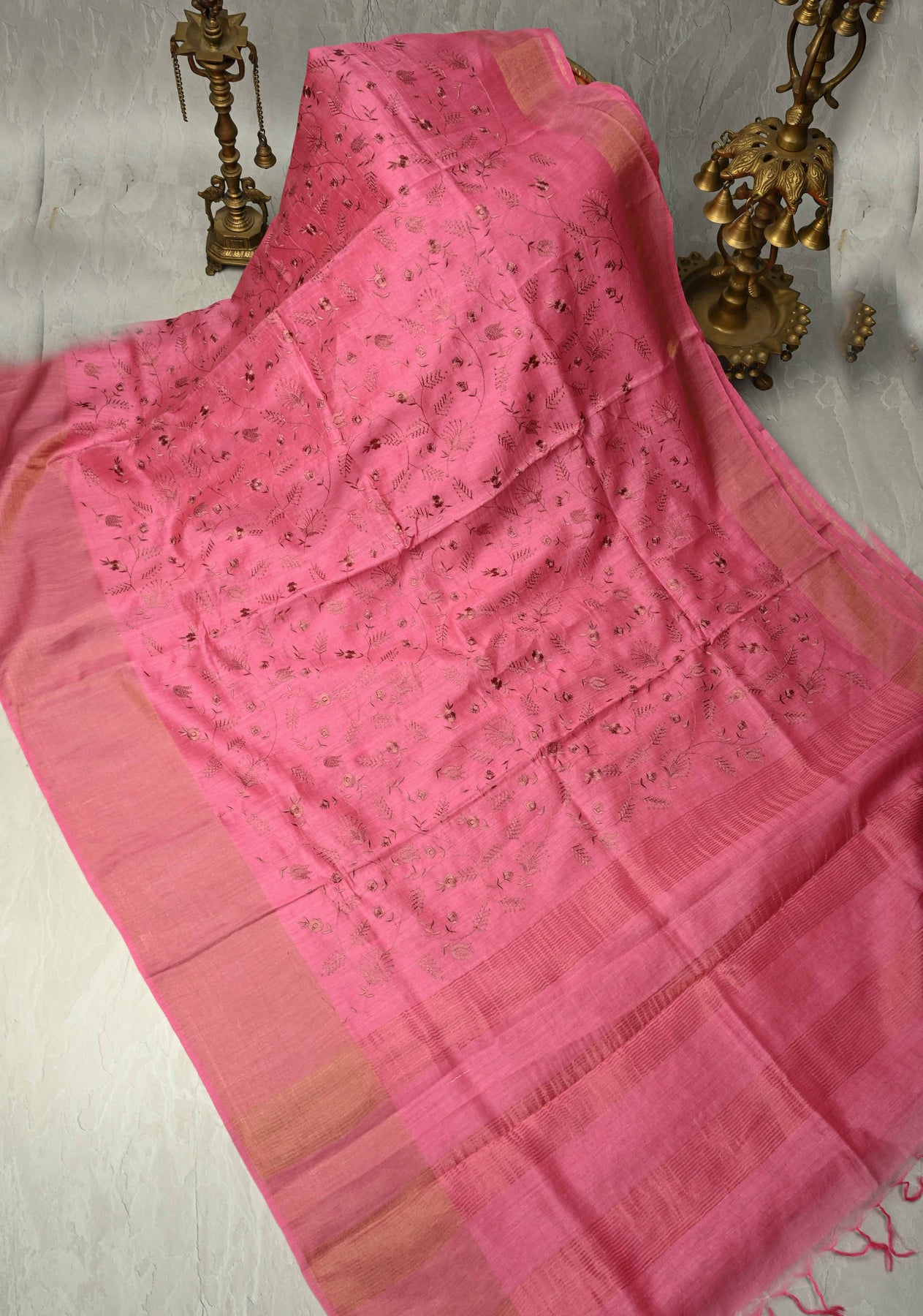 Experience the delicate elegance of this Pink Tussar Silk Saree. The raw, earthy texture of the Tussar is softened by a beautiful pink hue, serving as a canvas for intricate Floral Embroidery. The look is completed by a Muted Zari Border, which offers a subtle, antique shimmer rather than a bold gleam. This saree is a perfect blend of feminine charm and artisanal texture.