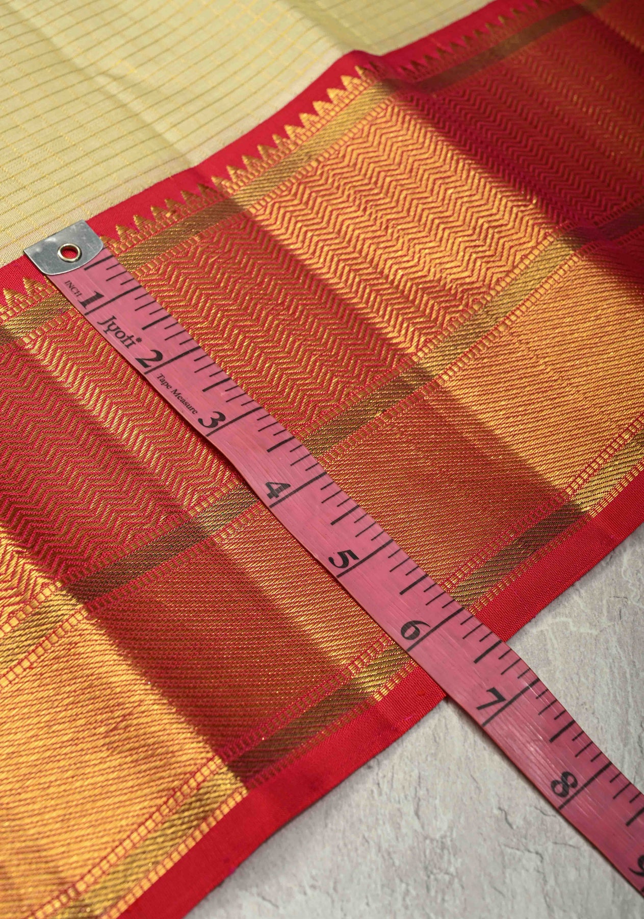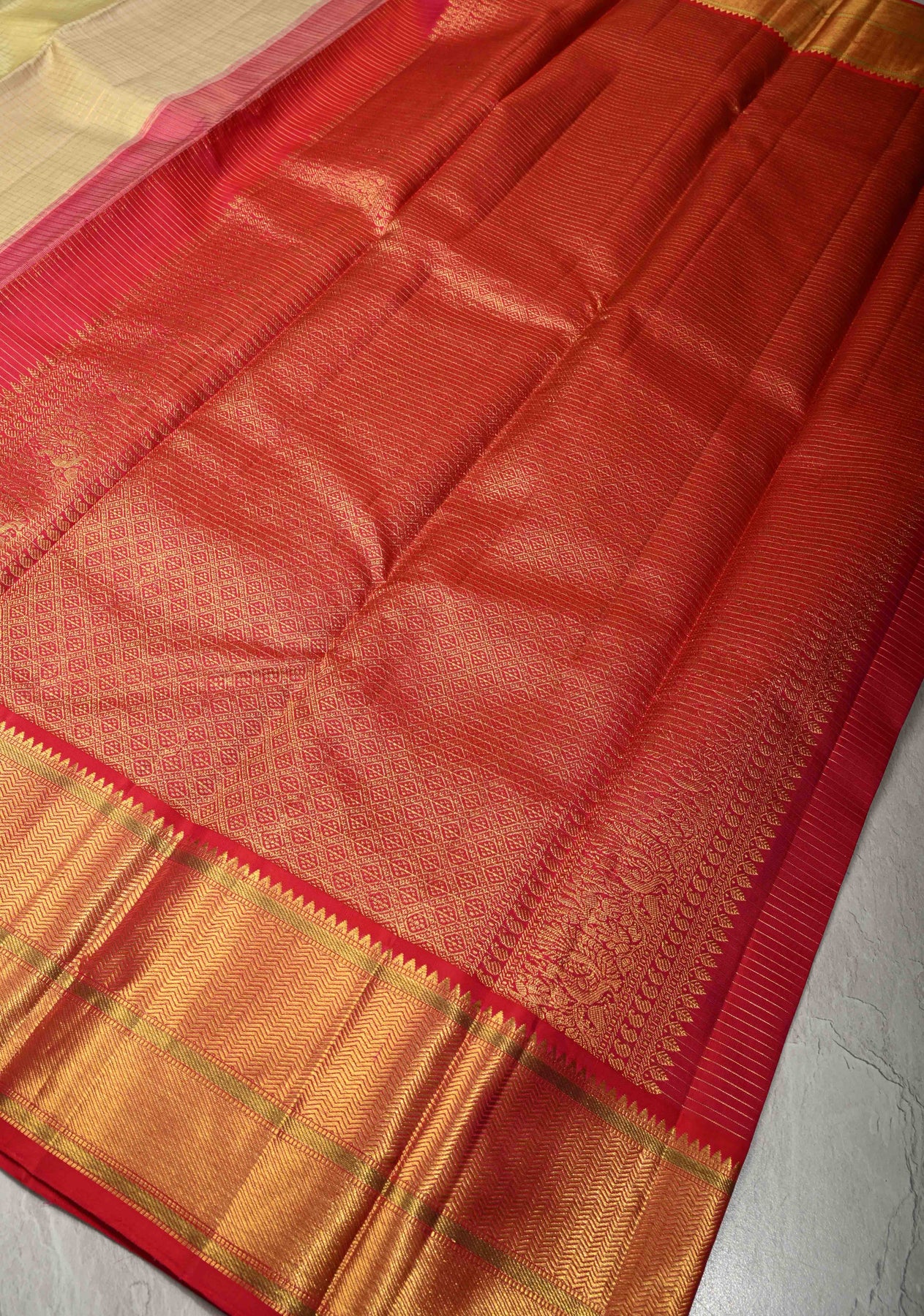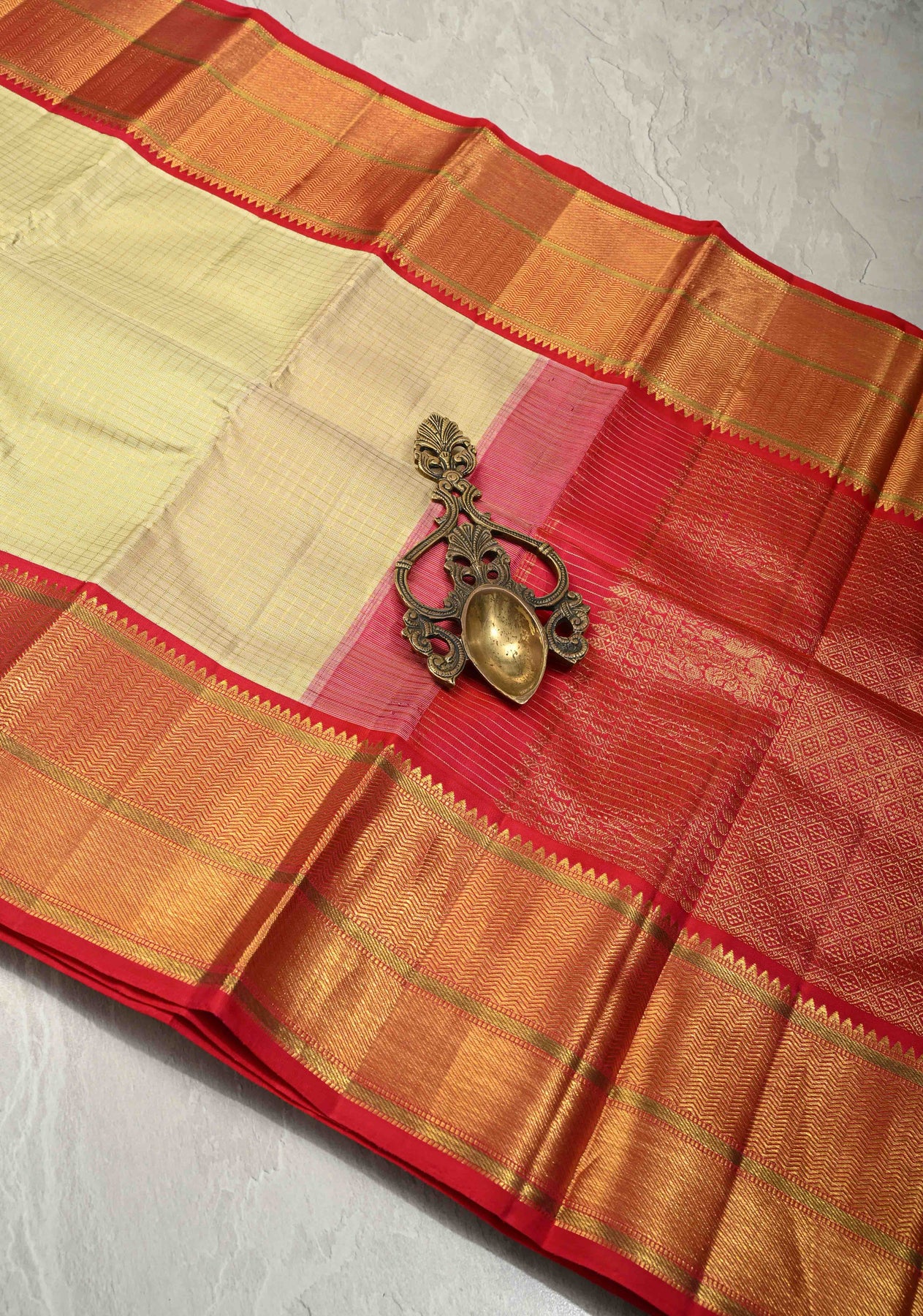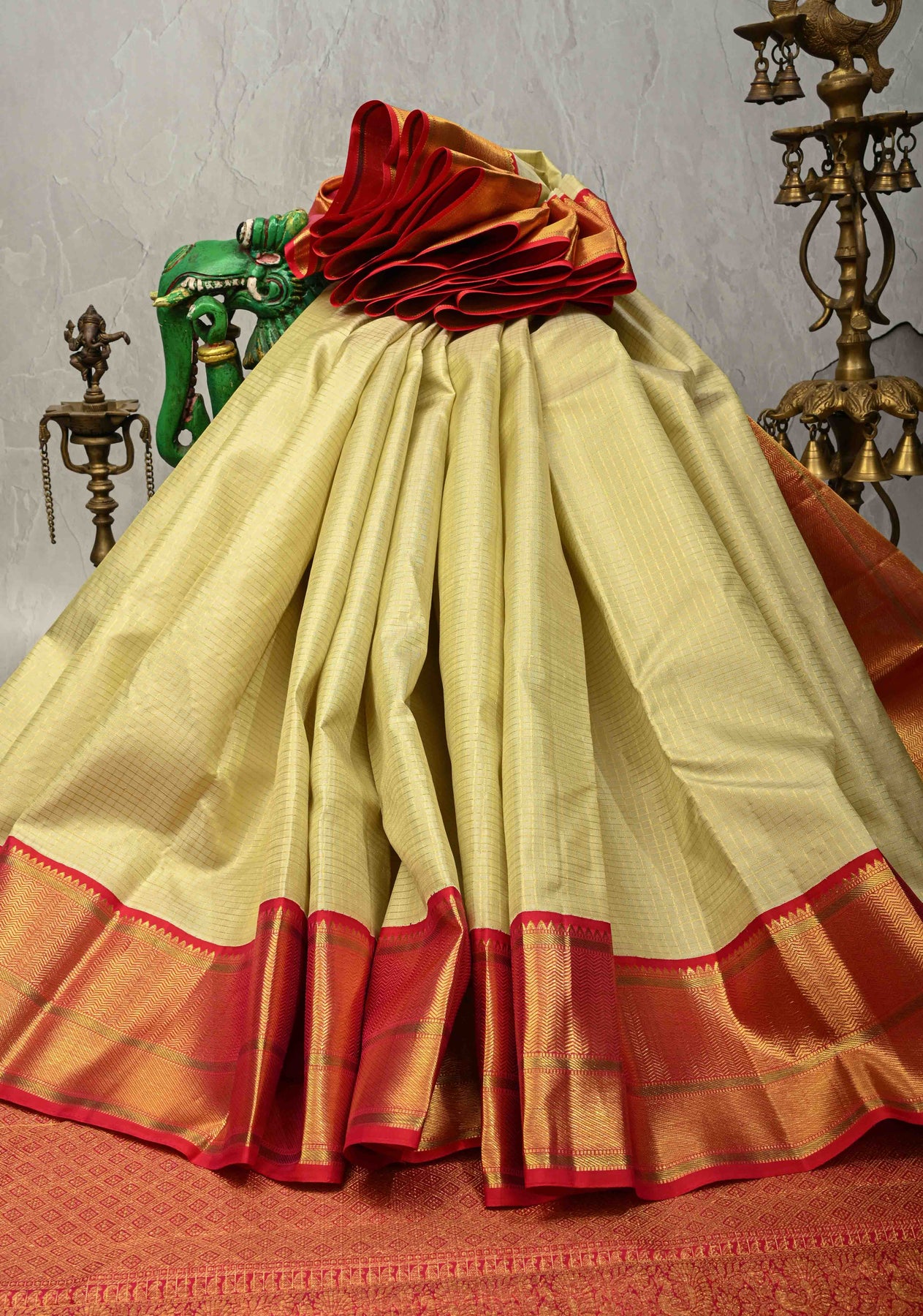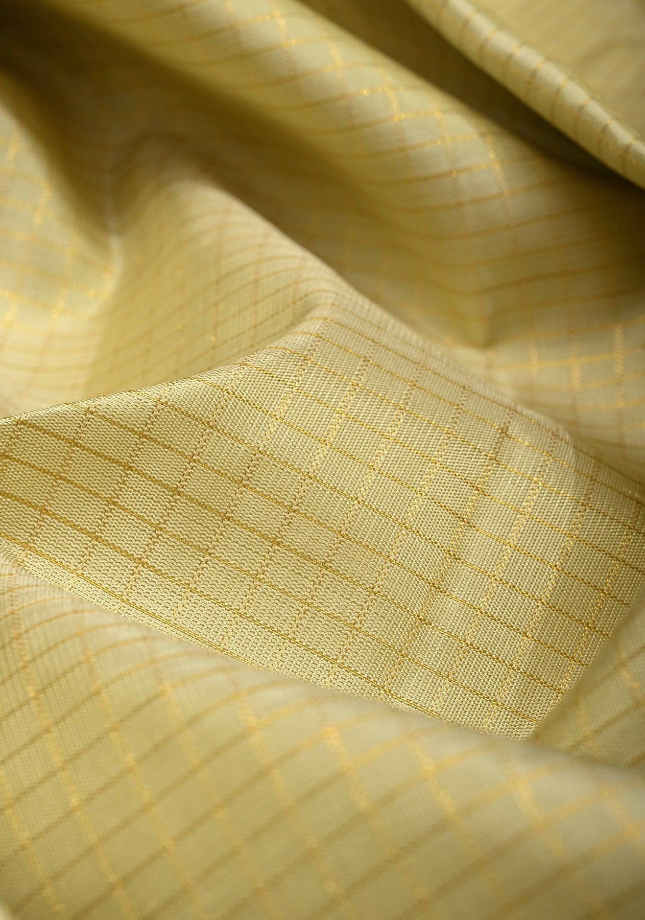 The soothing pista green dual tone body features intricate zari checks, adding structured elegance and subtle shimmer. Enhancing its regal appeal is a contrast wide zari border, expertly attached using the korvai method, which lends durability, grandeur, and authentic Kanchipuram character. A perfect heirloom-worthy saree for lovers of heritage artistry.