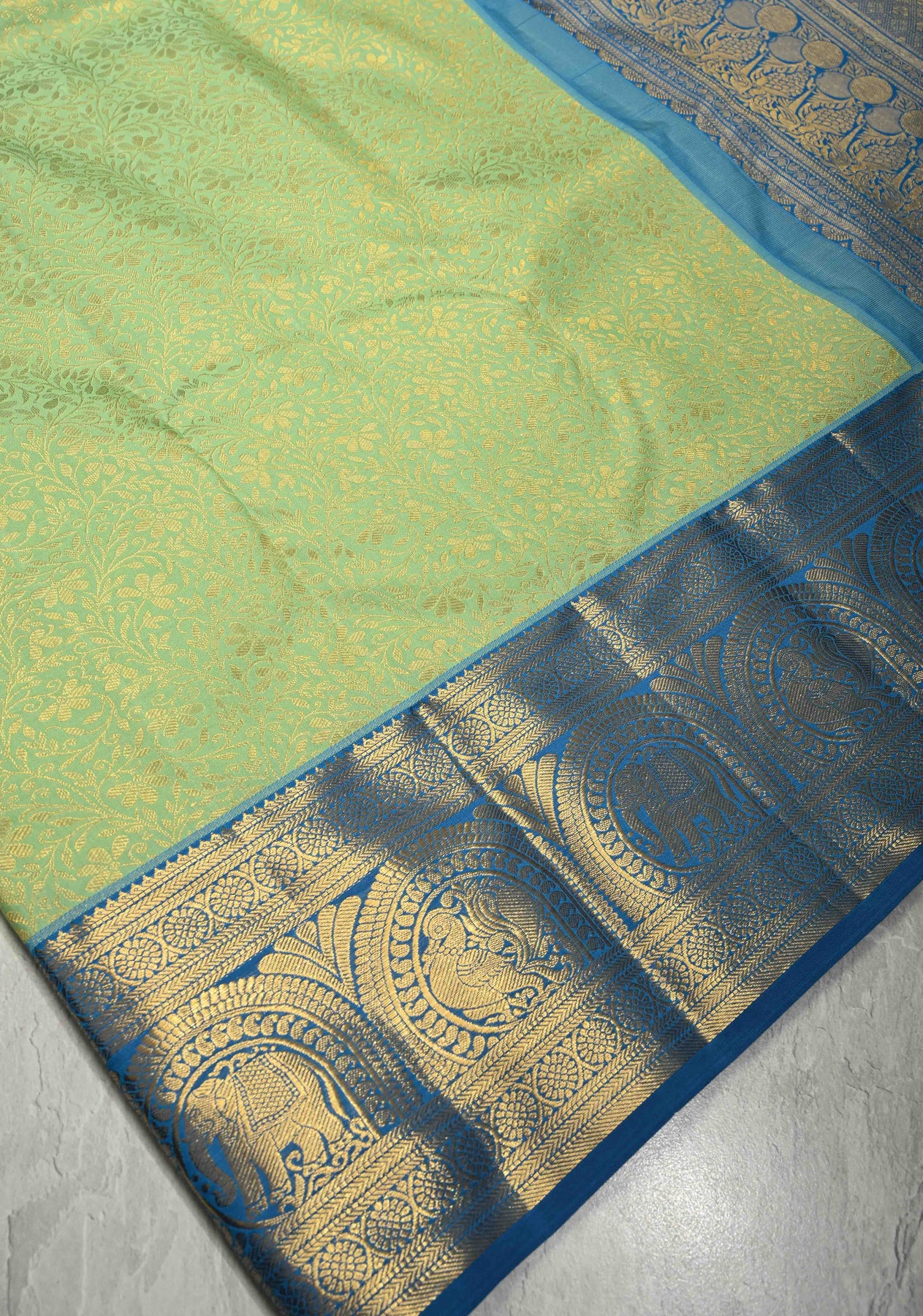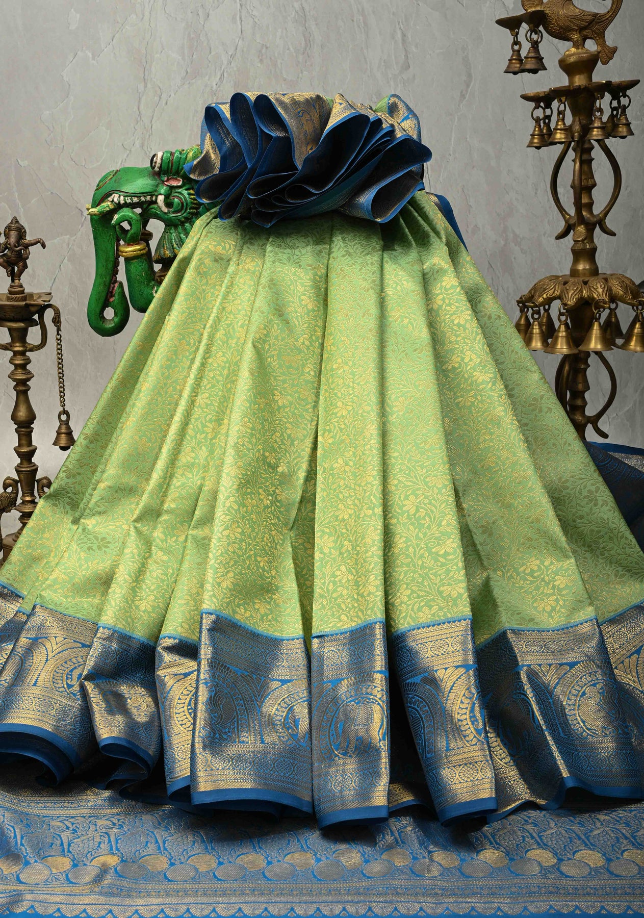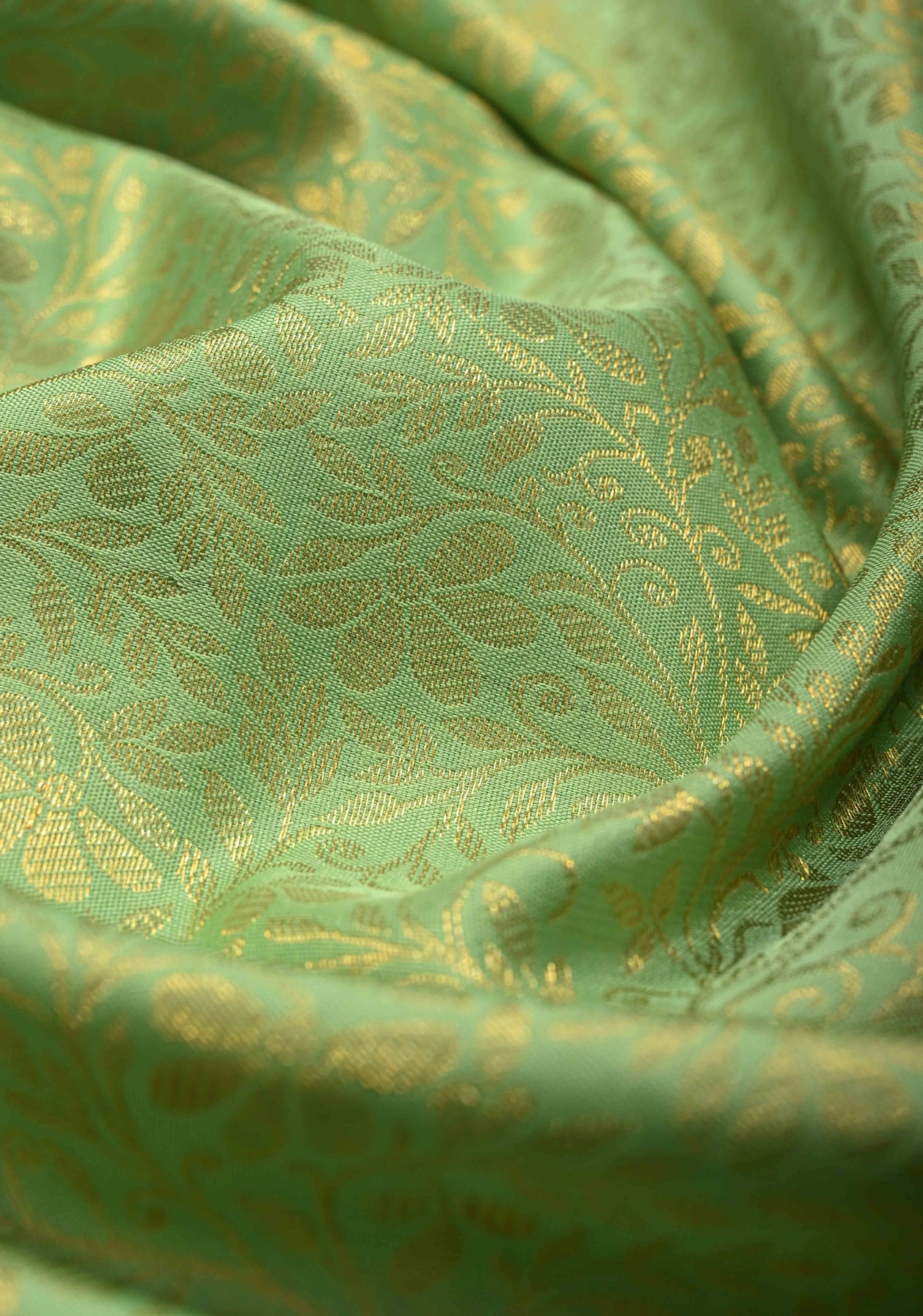 The soft pista green shade lends a fresh and sophisticated charm, making this saree perfect for weddings, festive celebrations, religious ceremonies, and special occasions. With its lustrous sheen, structured drape, and luxurious texture, it ensures both comfort and elegance. Pair it with gold or antique jewelry for a classic and royal look.