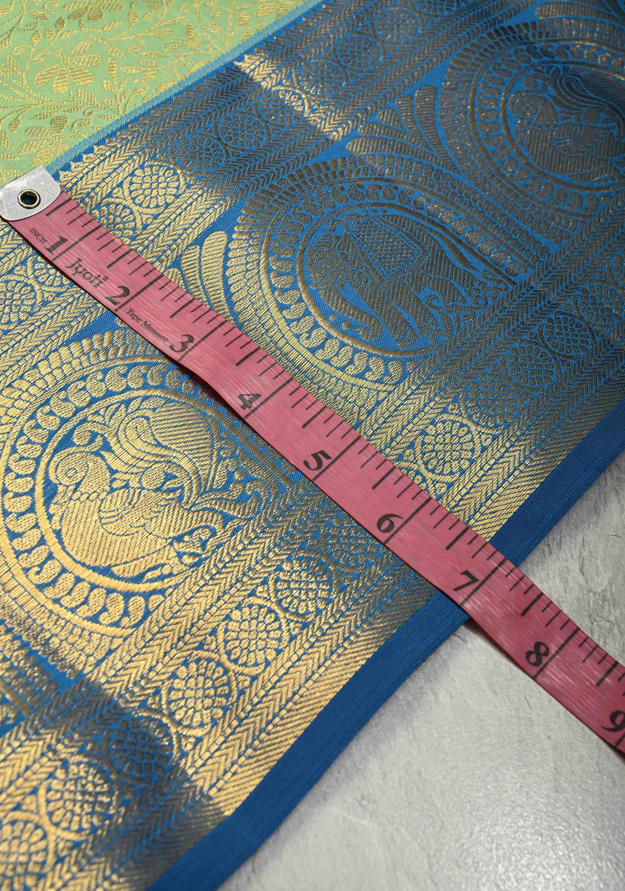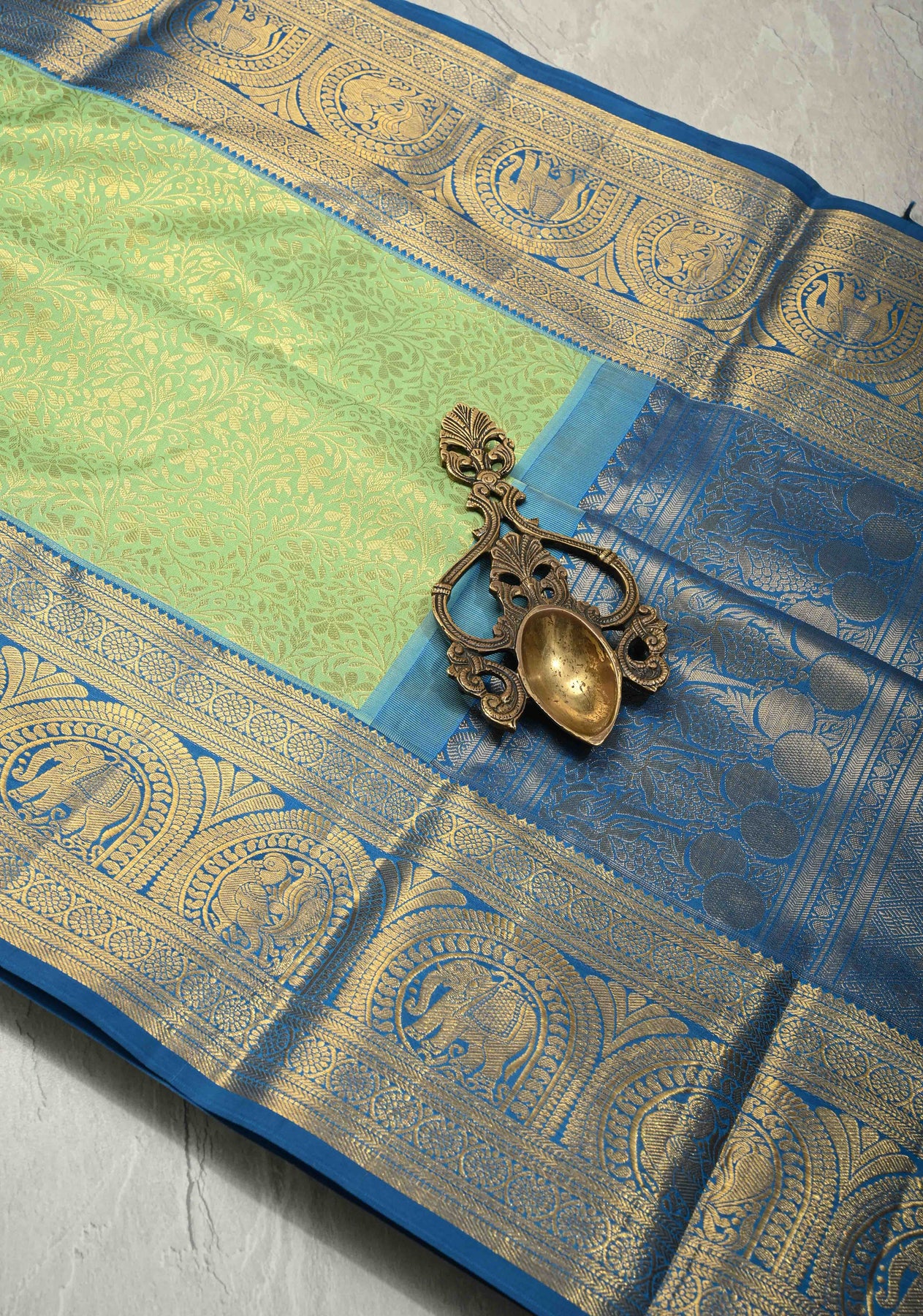 The Pista Green Kanjivaram Pure Silk Saree with Floral Jaal and Contrast Korvai Zari Border is a splendid example of traditional South Indian weaving artistry. Crafted from authentic Kanjivaram pure silk, this saree features an intricate floral jaal pattern, adding richness and timeless elegance. The contrast Korvai zari border enhances its regal appeal, showcasing the heritage craftsmanship of Kanjivaram sarees.