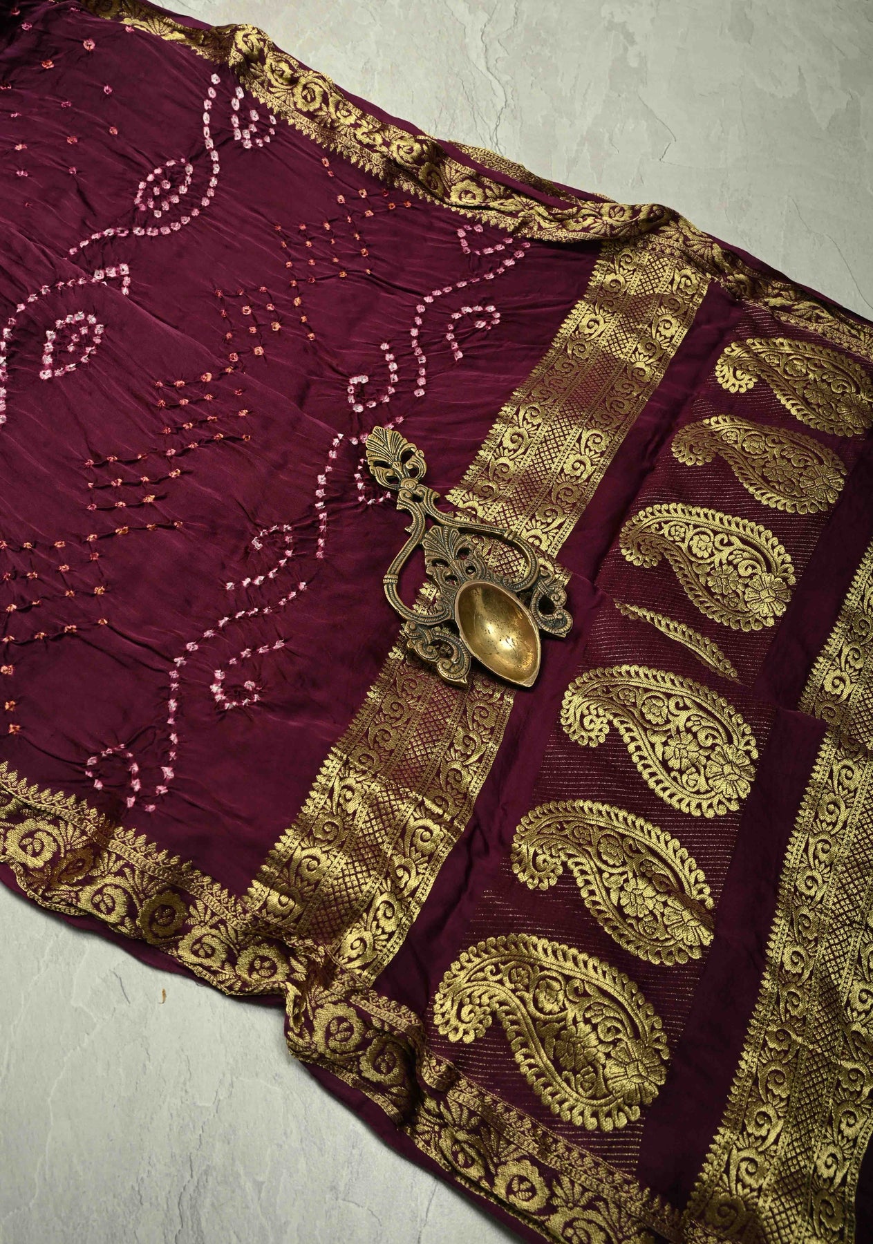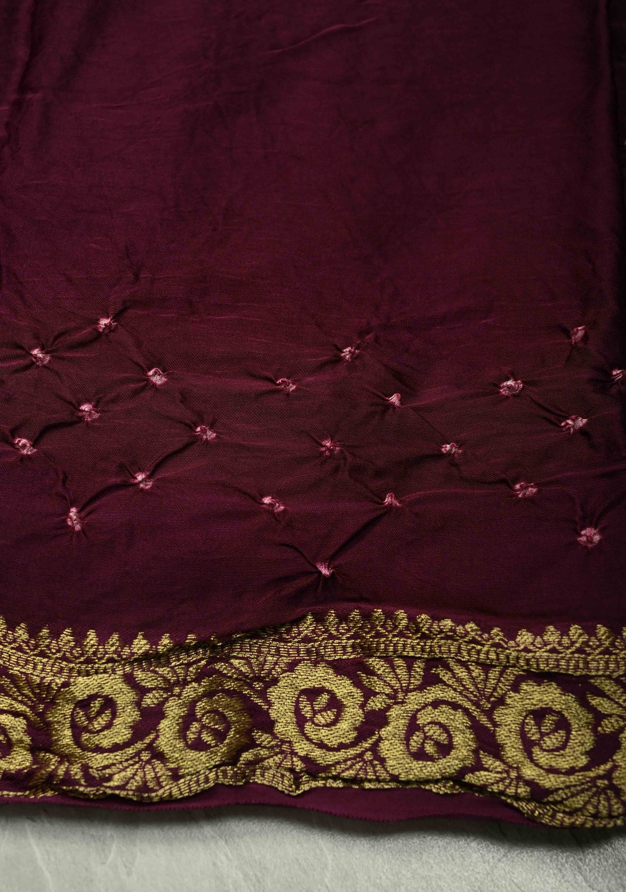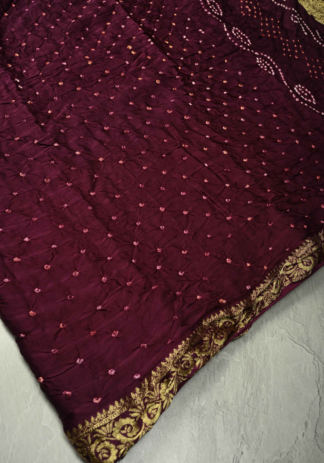Add a touch of royal elegance to your ethnic wardrobe with this Plum Modal Silk Saree. Crafted from modal silk, it offers a soft texture and fluid drape. The saree features exquisite Sarkam Bandhej work, showcasing intricate tie-dye artistry, and is finished with a minimal zari border that enhances its refined look. Perfect for festive occasions, weddings, and formal gatherings, this saree blends traditional craftsmanship with modern grace.