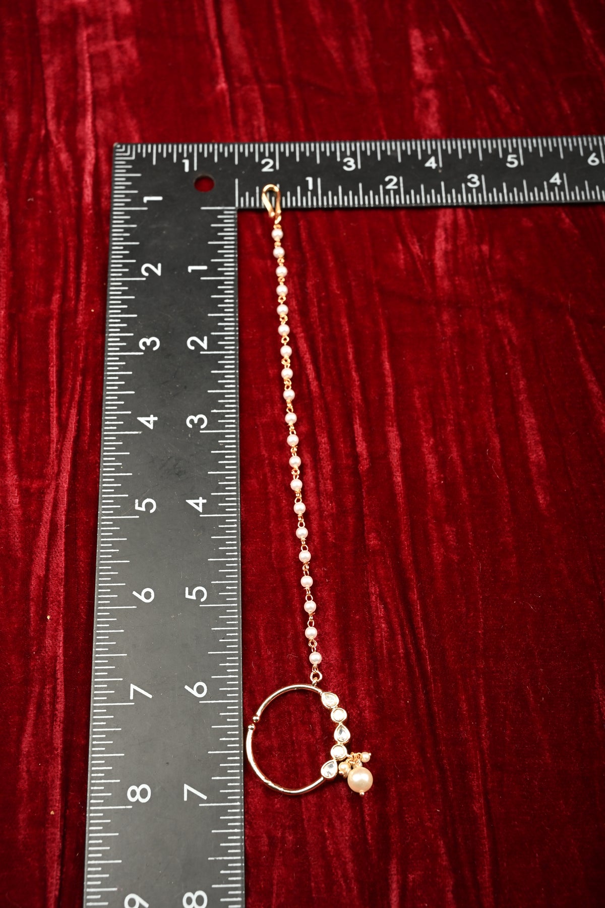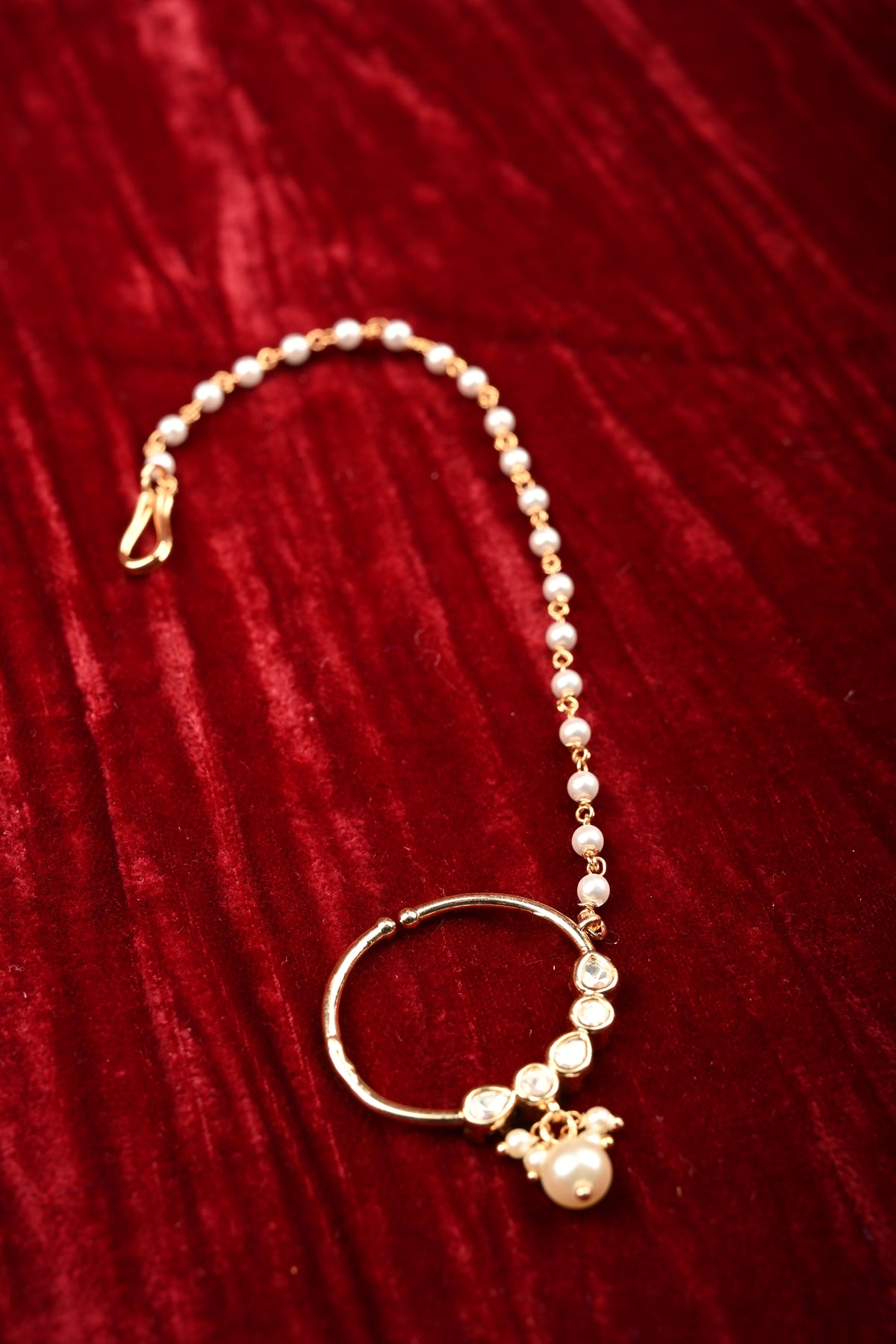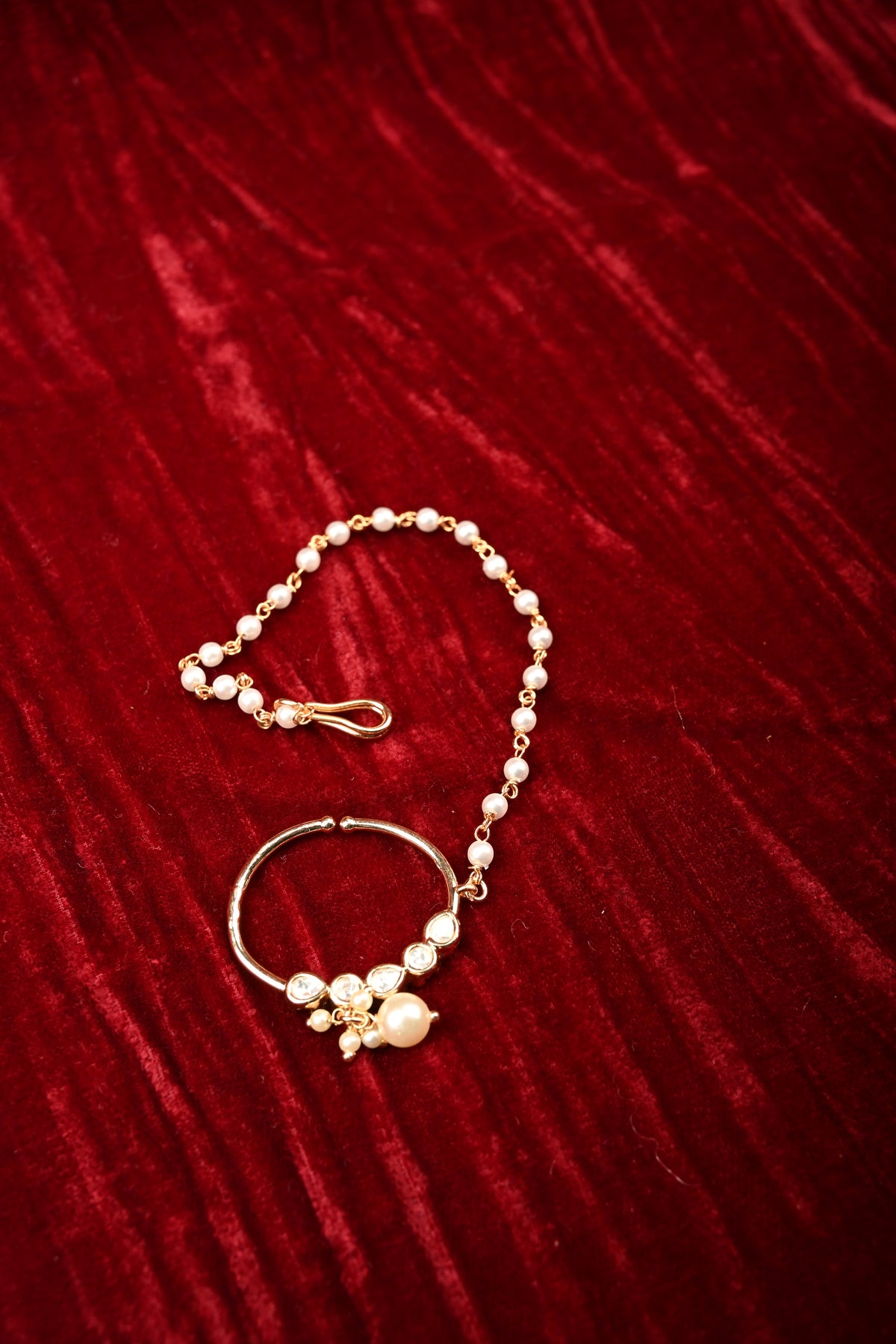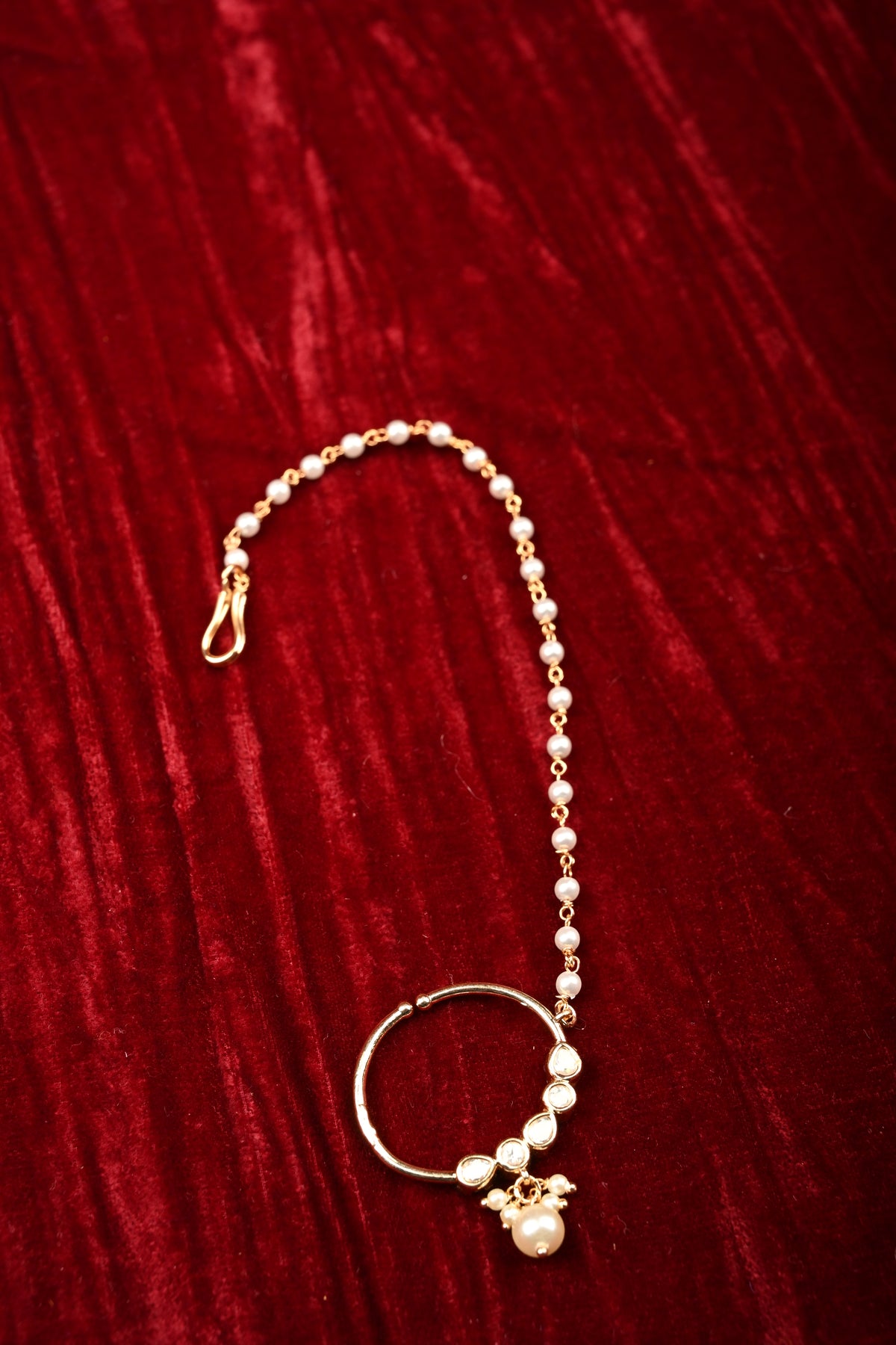 Polki/Kundan Nath (Nose Ring) with Pearl Drop and Chain