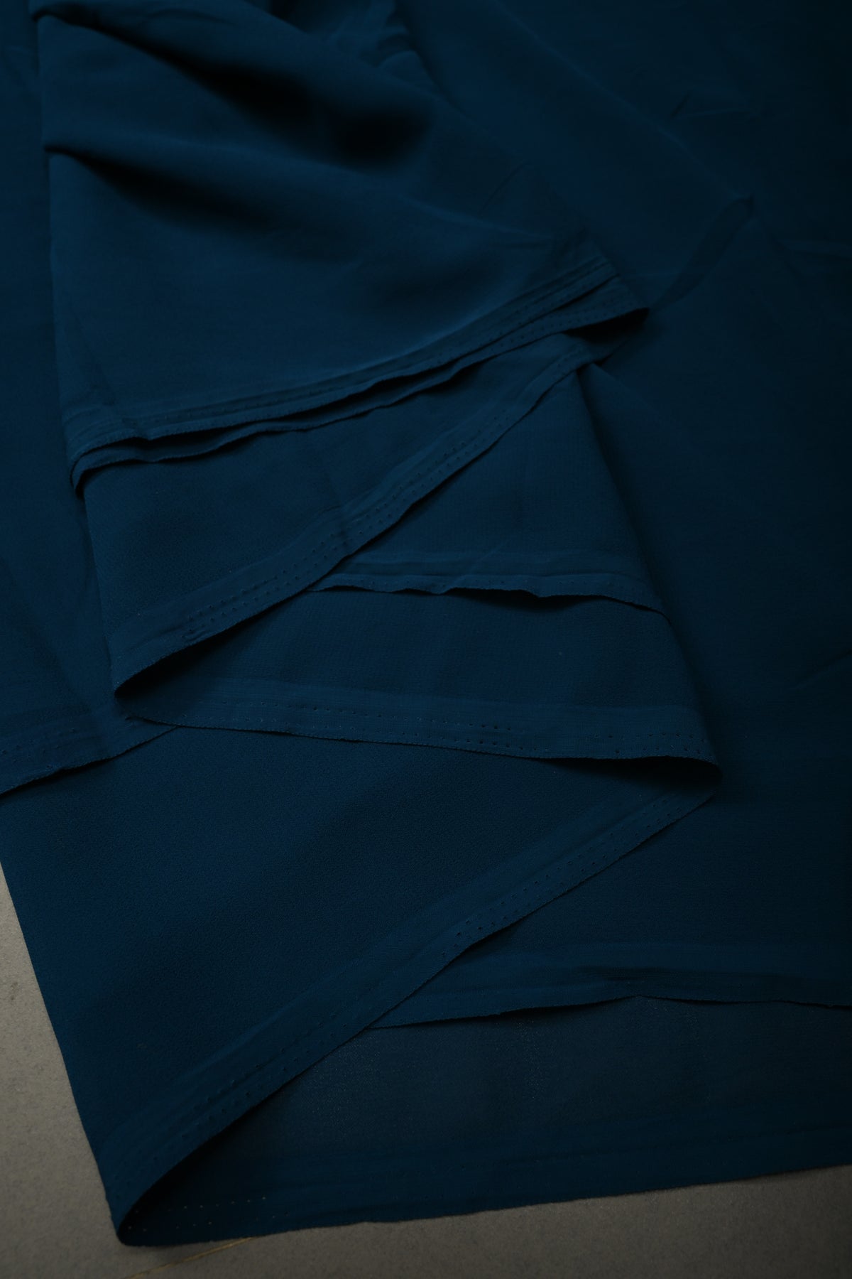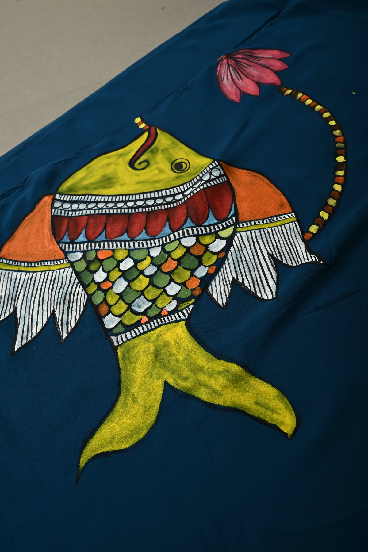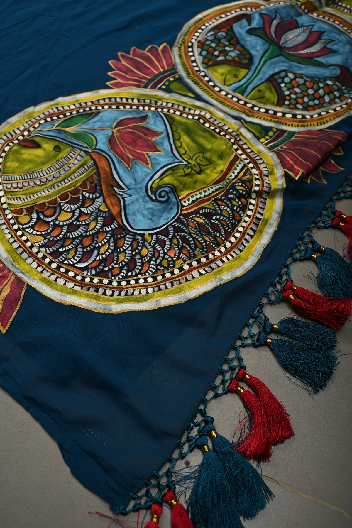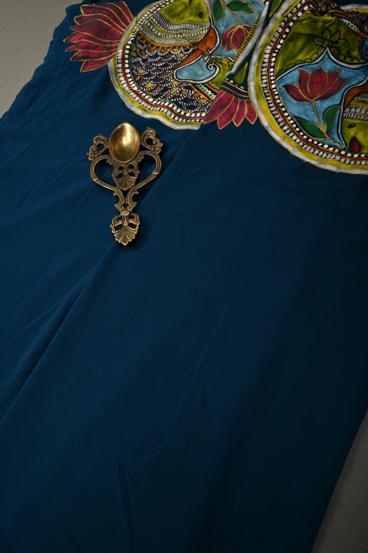 The Prussian Blue Shimmer Georgette Saree is a striking combination of rich color and artistic craftsmanship. The blue hue is complemented by the fluid, lightweight georgette fabric that drapes effortlessly, creating a flattering silhouette. The highlight of the saree is the intricate Madhubani-inspired hand painting on the pallu, showcasing beautifully detailed fish and lotus motifs that bring a vibrant, traditional touch to the design. This saree is ideal for festive occasions, cultural events, or any celebration where you want to make a bold yet elegant statement.