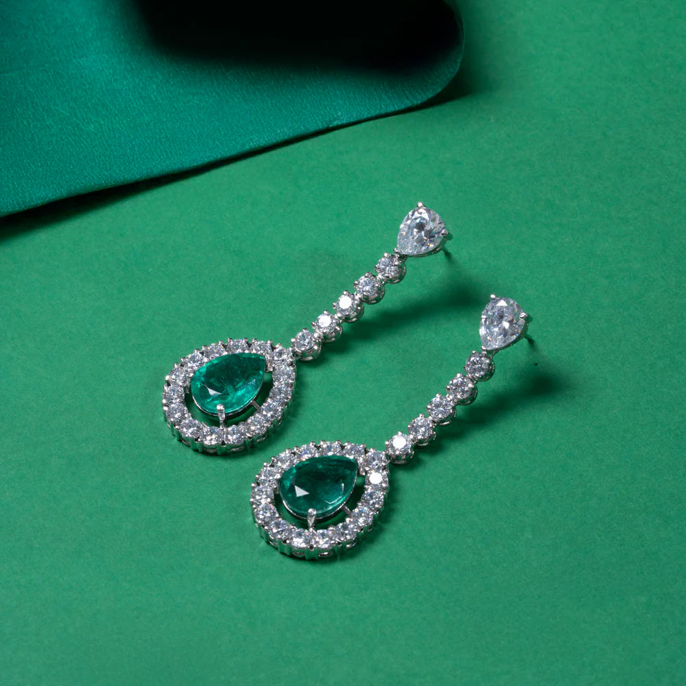 Meticulously crafted with a striking Pear-shaped Emerald centrepiece, the Eden's Eclipse Necklace Set features precision-set Cubic Zirconia stones that enhance the Emerald's natural brilliance. The strategic arrangement of CZ accents creates exceptional light dispersion, elevating this sophisticated piece from ordinary to extraordinary.