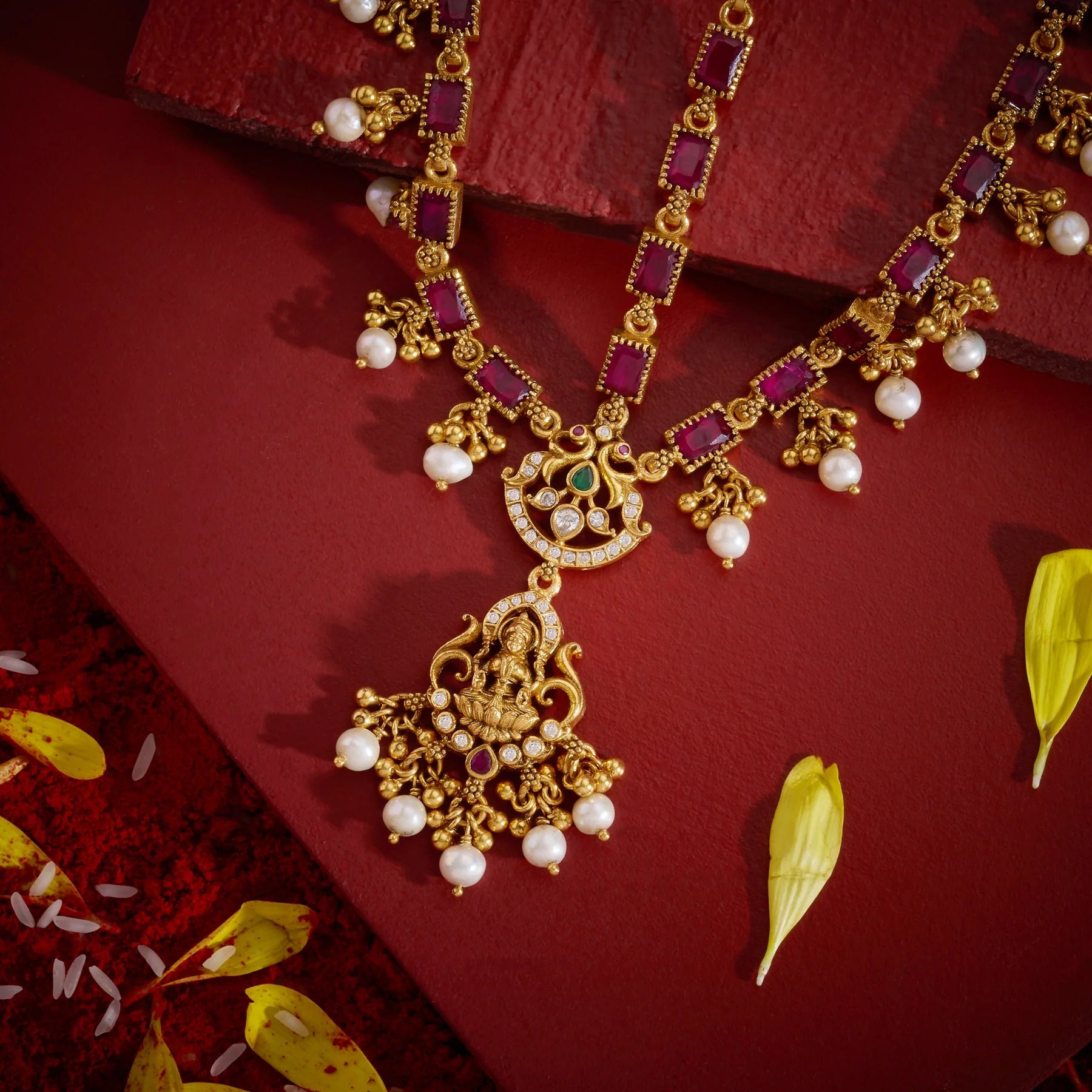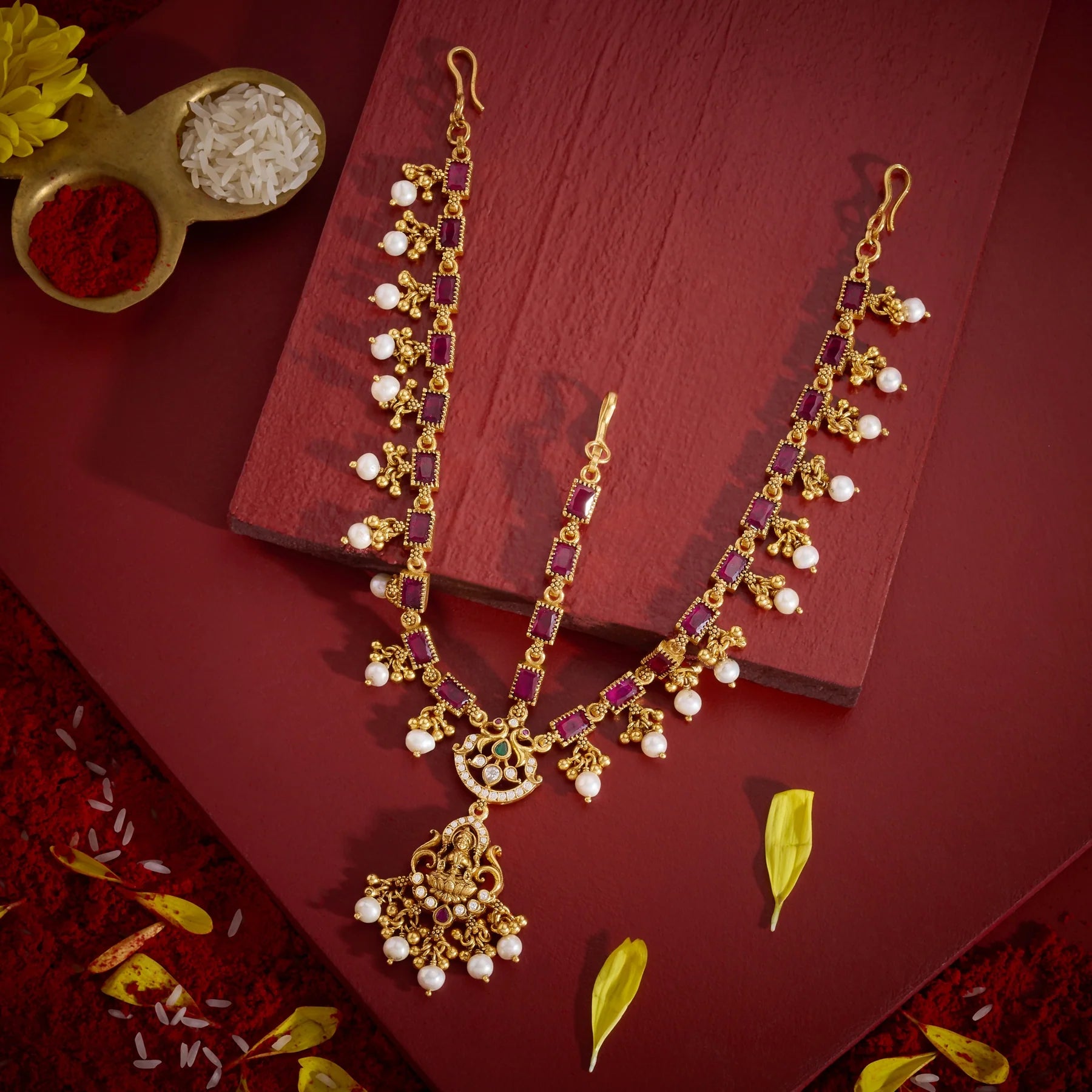 Ashta Temple Sheeshphool combines traditional craftsmanship with divine symbolism. This ornament features the revered goddess Lakshmi design, adorned with lustrous Red stones and sparkling Cubic Zirconia that catch light beautifully. Delicate Pearl hangings and Golden bead accents create an elegant cascade effect, adding movement and sophistication. Perfect for festive occasions, weddings, or spiritual celebrations, this piece merges cultural heritage with contemporary jewellery aesthetics. The combination of semi precious-look stones and Pearl embellishments makes it a versatile accessory that complements both traditional and modern attire.