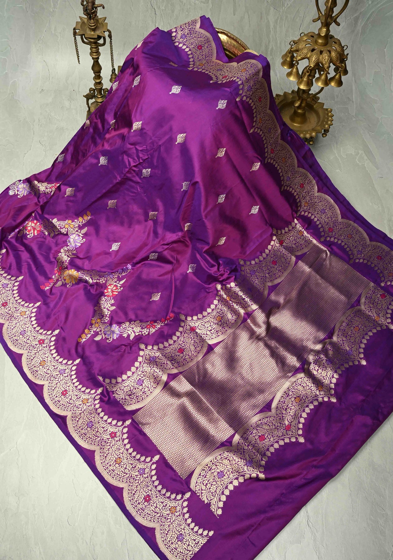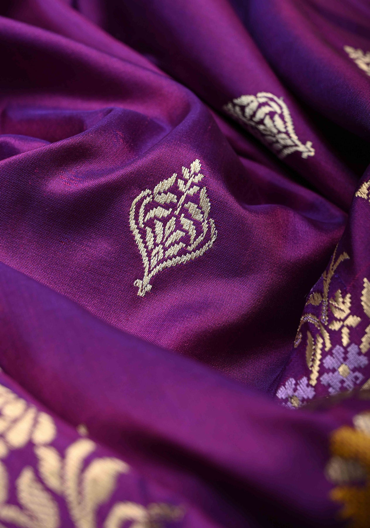 This stunning Purple Dual Tone Pure Banarasi Katan Silk Saree is a masterpiece of traditional artistry and luxurious fabric. Crafted from the finest Katan silk, the saree boasts a beautiful dual-tone effect that adds depth and richness to its vibrant purple hues. Adorned with intricate Kadhuwa Jungla Meenakari Sona Rupa buttas, each motif reflects exquisite craftsmanship, blending gold and silver tones to create a regal and opulent look. The saree is further enhanced by a delicate scallop border, which adds a graceful finishing touch, balancing elegance with detailed artistry. Perfect for weddings, festive celebrations, or grand occasions, this saree is a celebration of heritage and sophistication, designed to make a lasting impression.