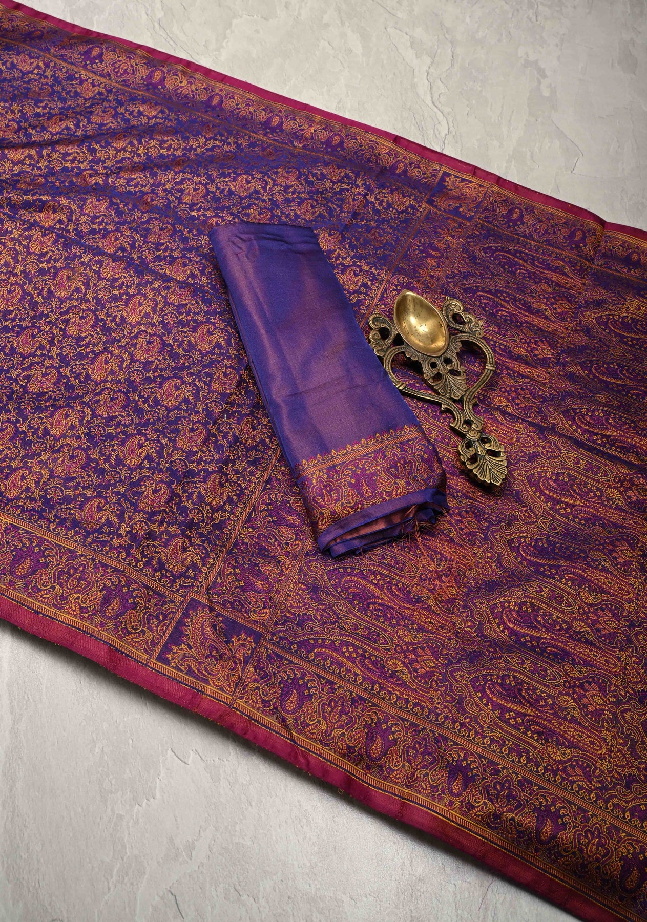 This exquisite purple dual-tone Banarasi satin silk saree is a testament to the timeless art of Banarasi weaving. It features the fine and intricate Tanchoi technique, a satin weave that creates a stunning, lightweight fabric with an extra weft thread, giving the patterns a unique, embroidery-like texture. The dual-tone effect in a rich shade of purple adds a dynamic depth and vibrancy, catching the light with every graceful movement. The saree's inherent elegance is a perfect blend of a luxurious drape and a soft, comfortable feel. This piece is a symbol of refined sophistication, ideal for festive celebrations, weddings, and special occasions.