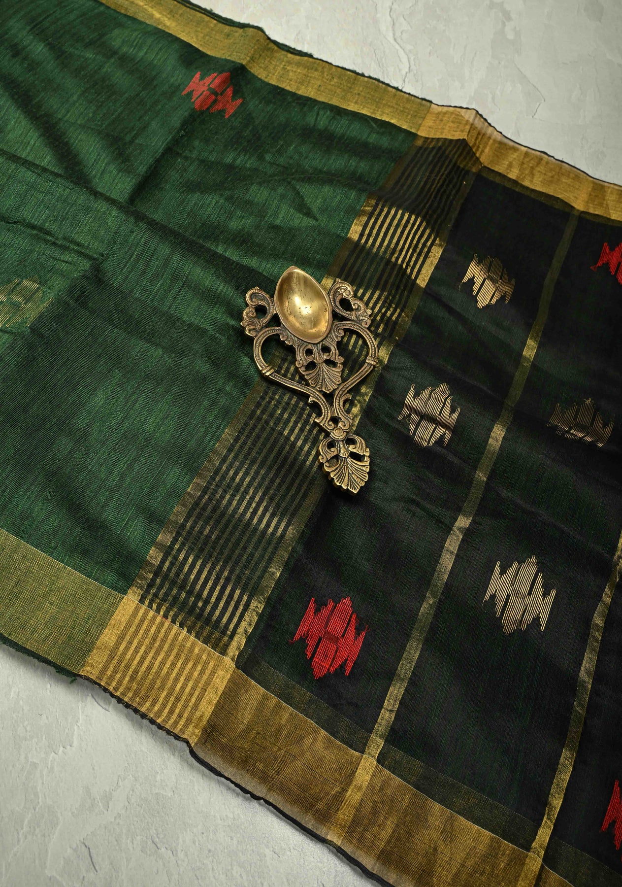 Celebrate timeless elegance with this Green Gold Handloom Matka Silk Jamdani Saree, a perfect blend of traditional craftsmanship and contemporary style. Woven from Matka silk, known for its soft, slightly textured finish, this saree showcases the intricate Jamdani weave, a hallmark of fine handloom artistry.