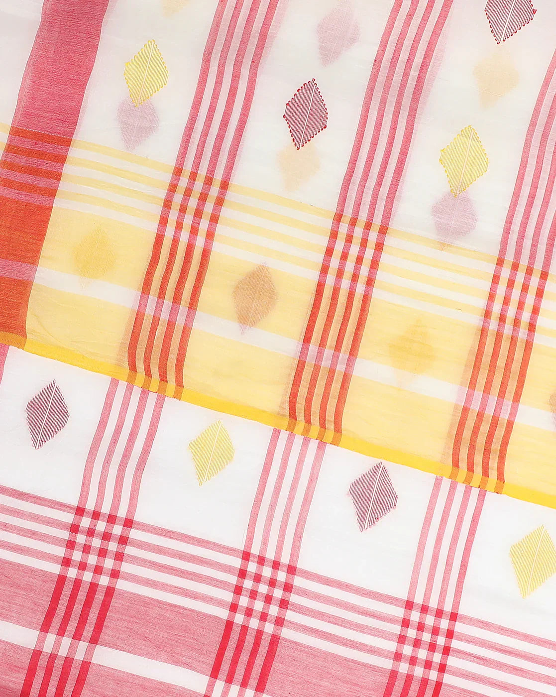 Experience the timeless elegance of Bengal’s weaving heritage with this exquisite White Red Diamond Jamdani Cotton Saree. Handwoven in soft, breathable pure cotton, the saree features a stunning diamond-patterned Jamdani weave that reflects traditional artistry at its finest.