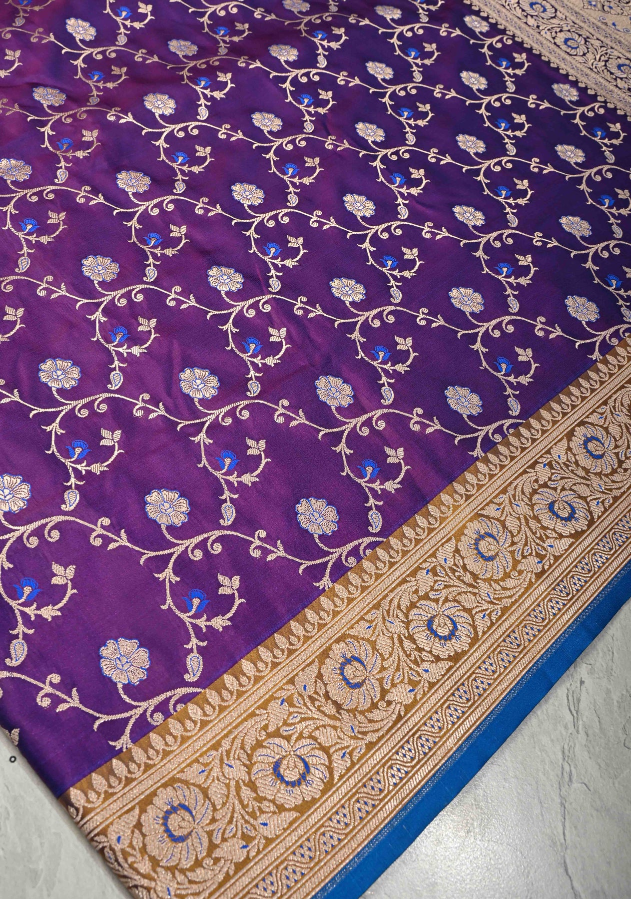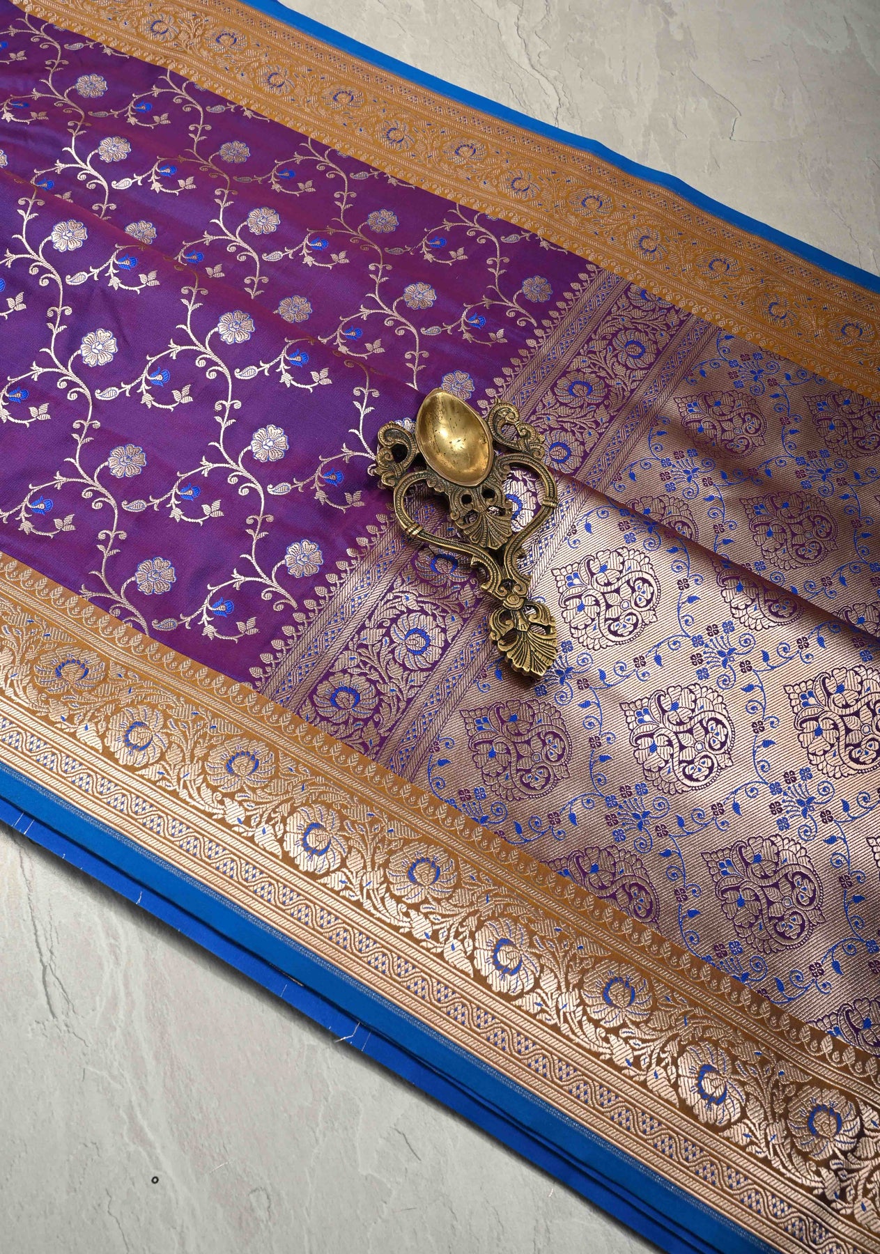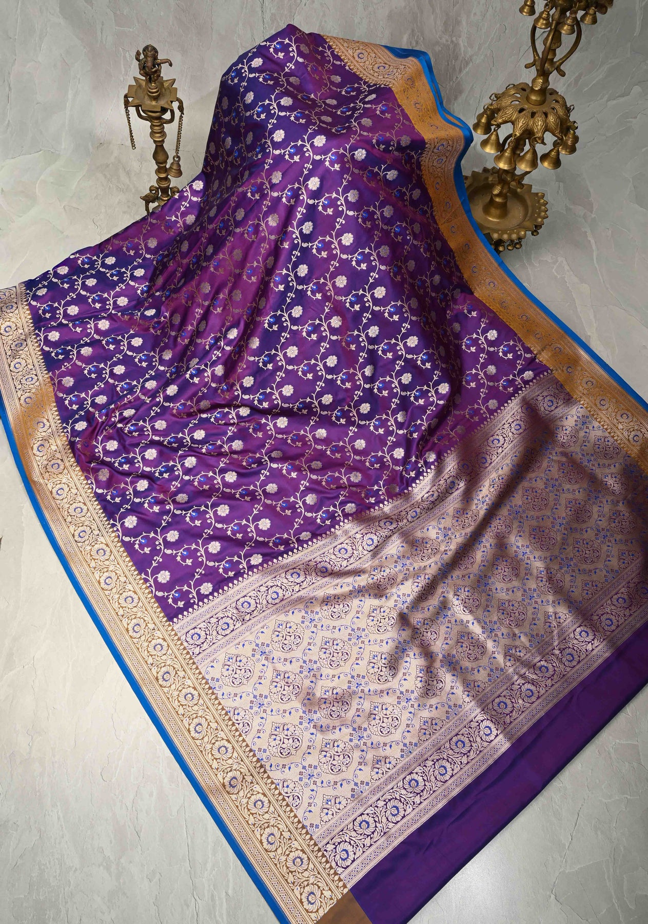 Embrace royal elegance in this Purple Semi Mashru Silk Saree. The deep purple body boasts a luxurious satin-like luster, meticulously adorned with an all-over silver Zari floral jaal and vibrant blue Meenakari accents. A striking contrast mustard gold border with blue piping provides a regal frame, while the opulent silver Zari pallu features an intricate geometric lattice. Perfect for grand weddings, this heritage weave blends traditional artistry with a sophisticated,.