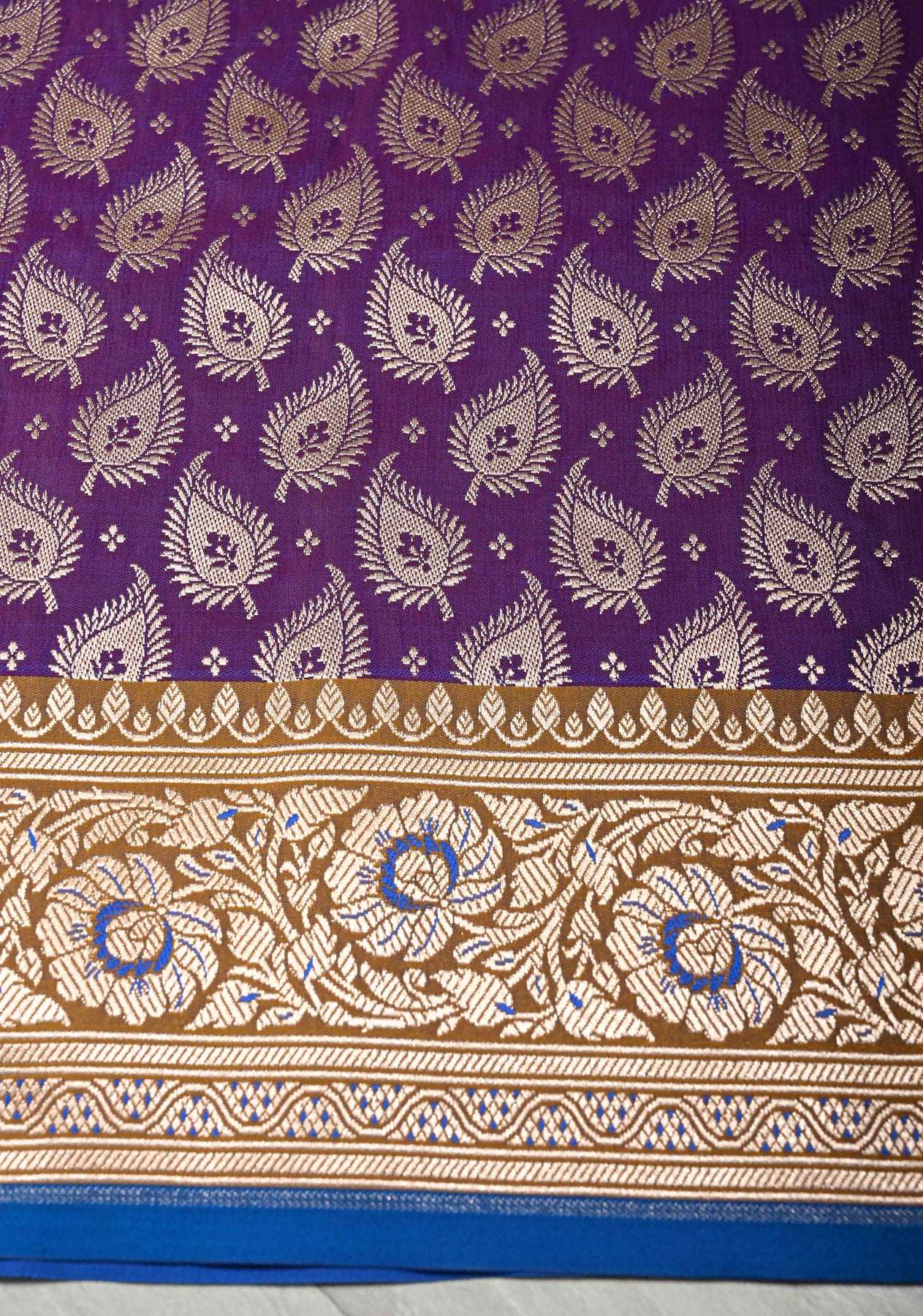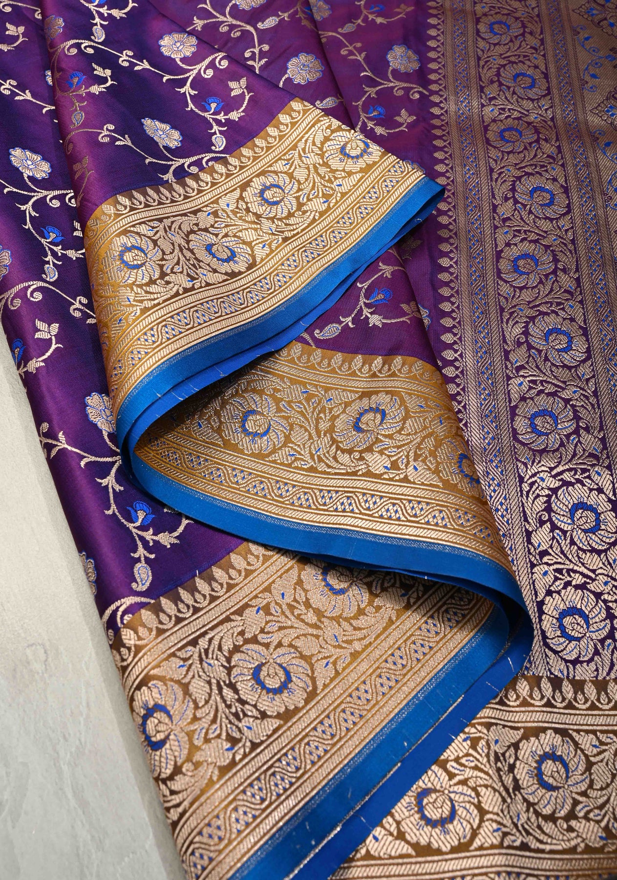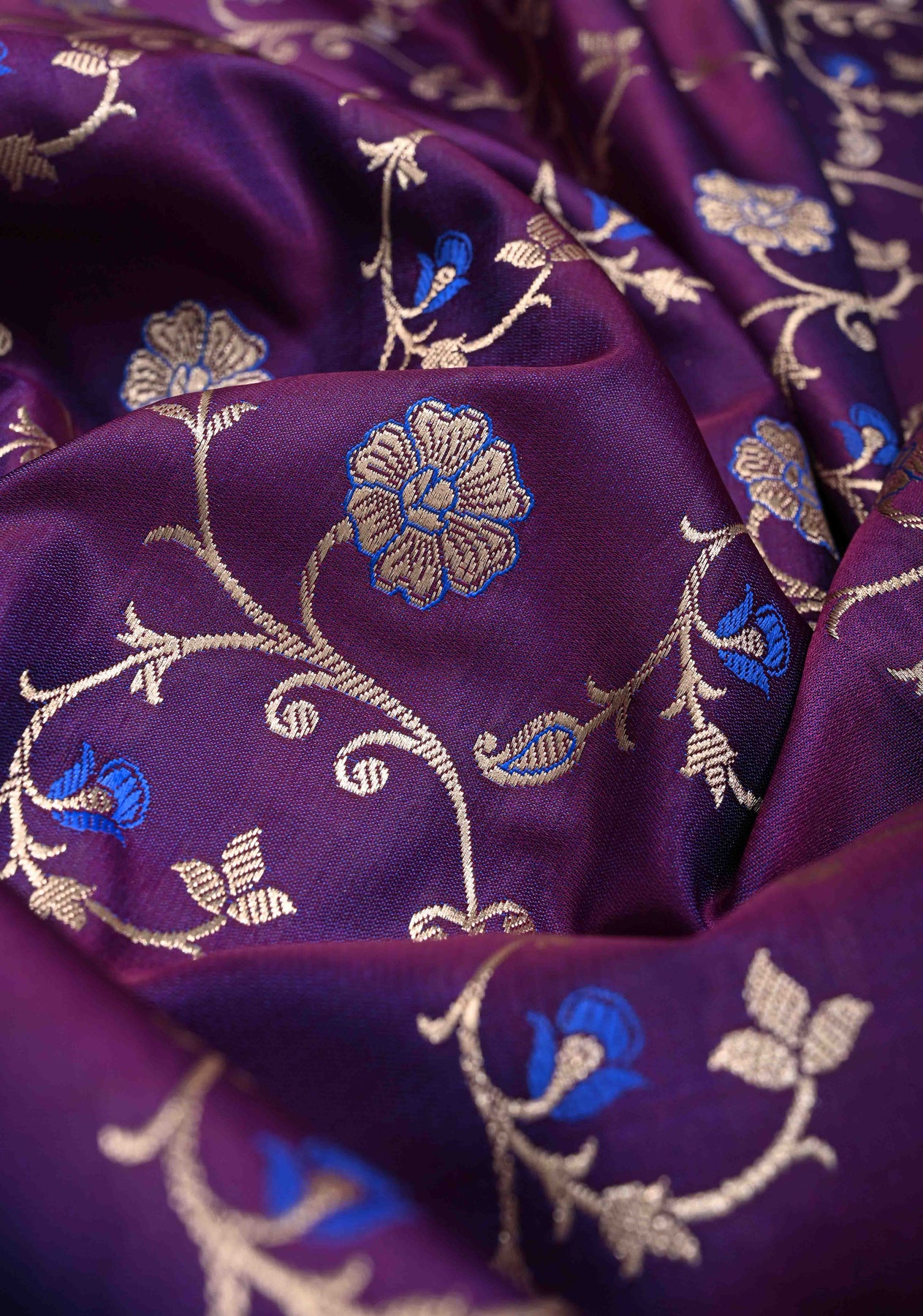 Embrace royal elegance in this Purple Semi Mashru Silk Saree. The deep purple body boasts a luxurious satin-like luster, meticulously adorned with an all-over silver Zari floral jaal and vibrant blue Meenakari accents. A striking contrast mustard gold border with blue piping provides a regal frame, while the opulent silver Zari pallu features an intricate geometric lattice. Perfect for grand weddings, this heritage weave blends traditional artistry with a sophisticated,.