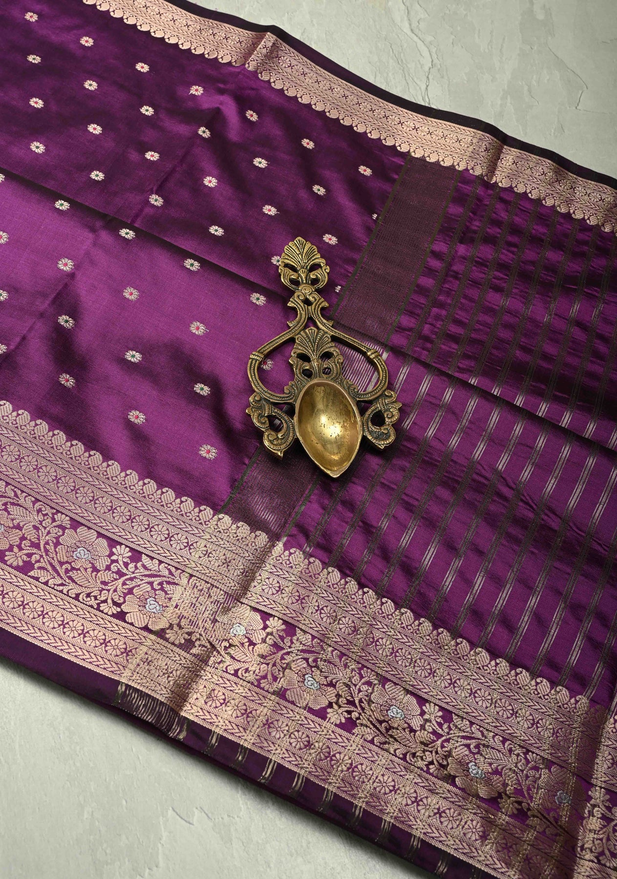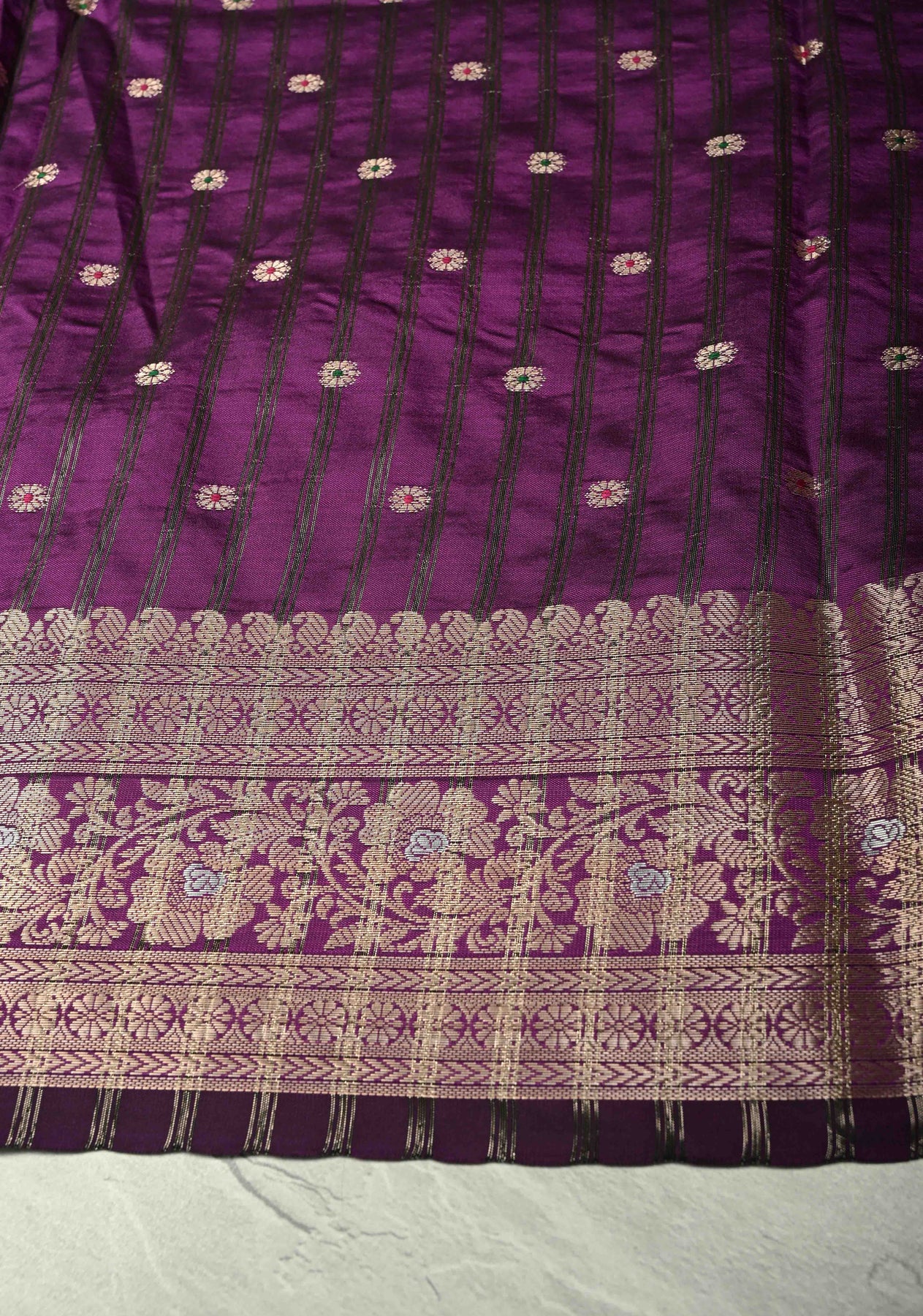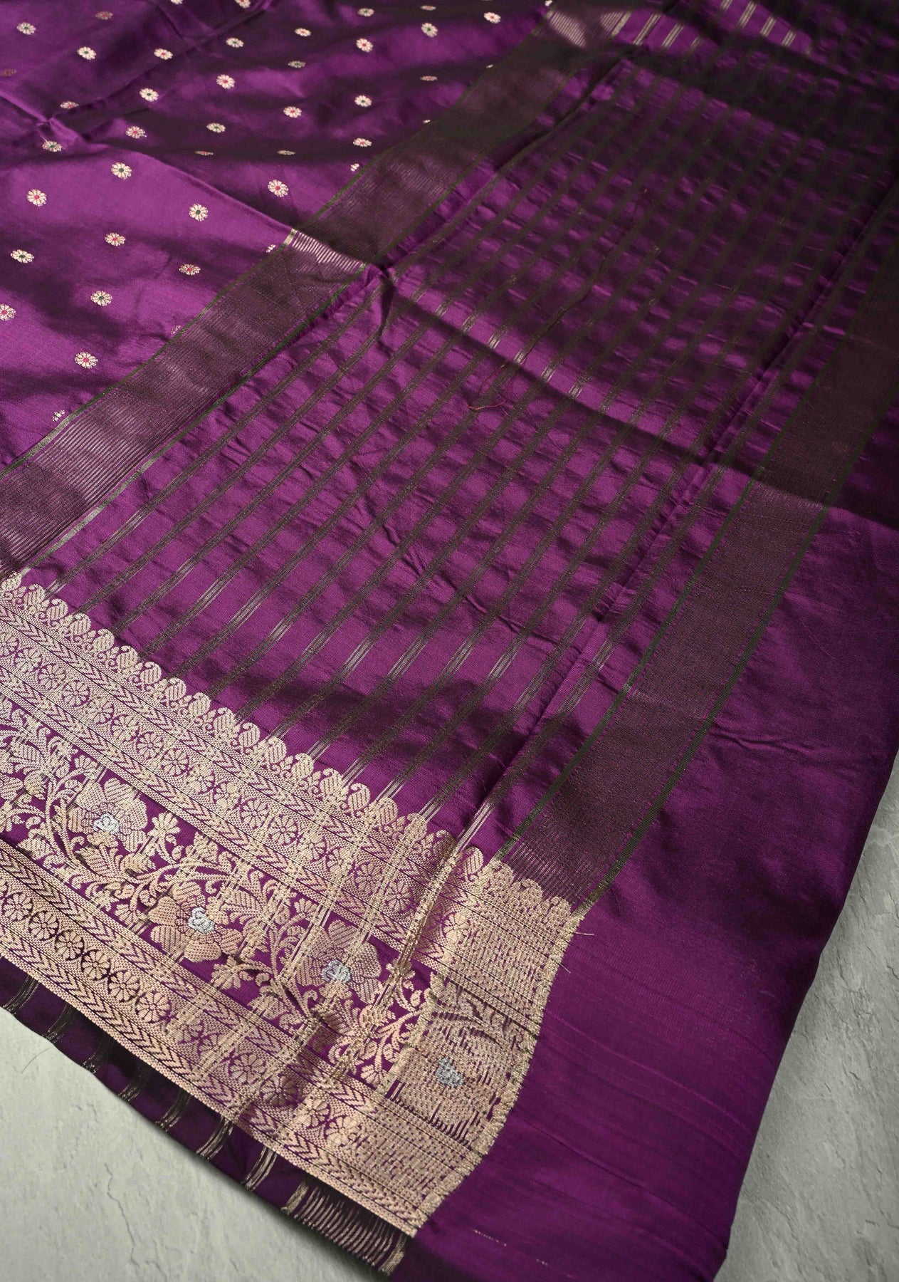 The Purple Semi-Silk Saree with Meenakari Chunri Buttis and Alfi Zari Border is a perfect blend of regal elegance and intricate craftsmanship. Made from semi-silk fabric, it offers a smooth, lustrous drape that enhances every silhouette. The purple hue exudes sophistication, while the delicate Meenakari chunri buttis add colorful, traditional detailing. The luxurious Alfi zari border provides a golden, ornate accent, making this saree ideal for weddings, festive occasions, and special celebrations. Pair it with a matching or contrasting blouse and statement jewelry for a truly majestic ethnic look.