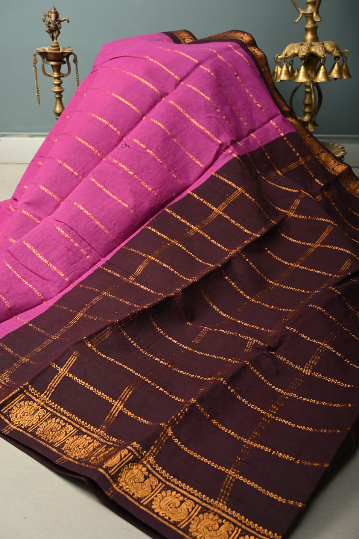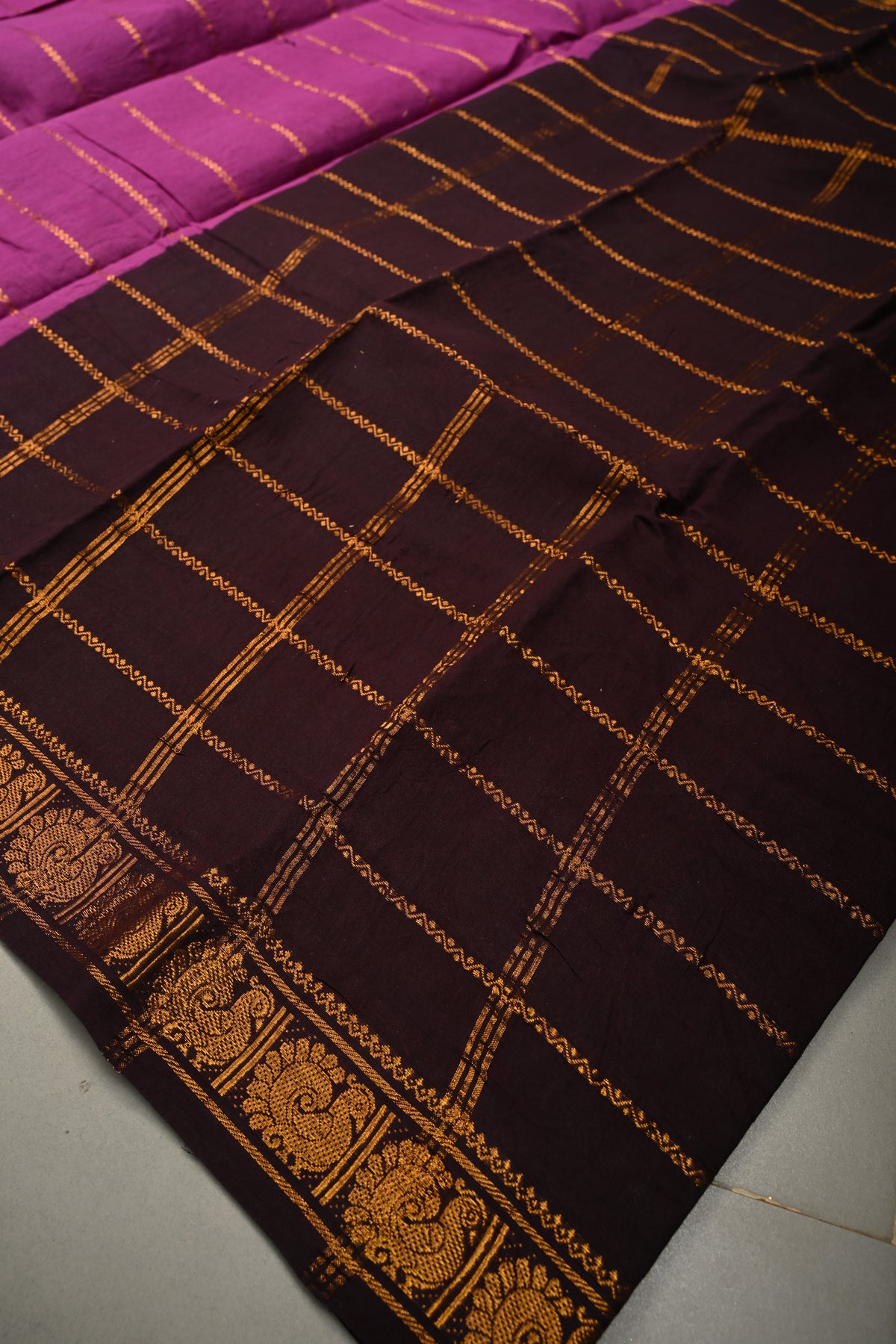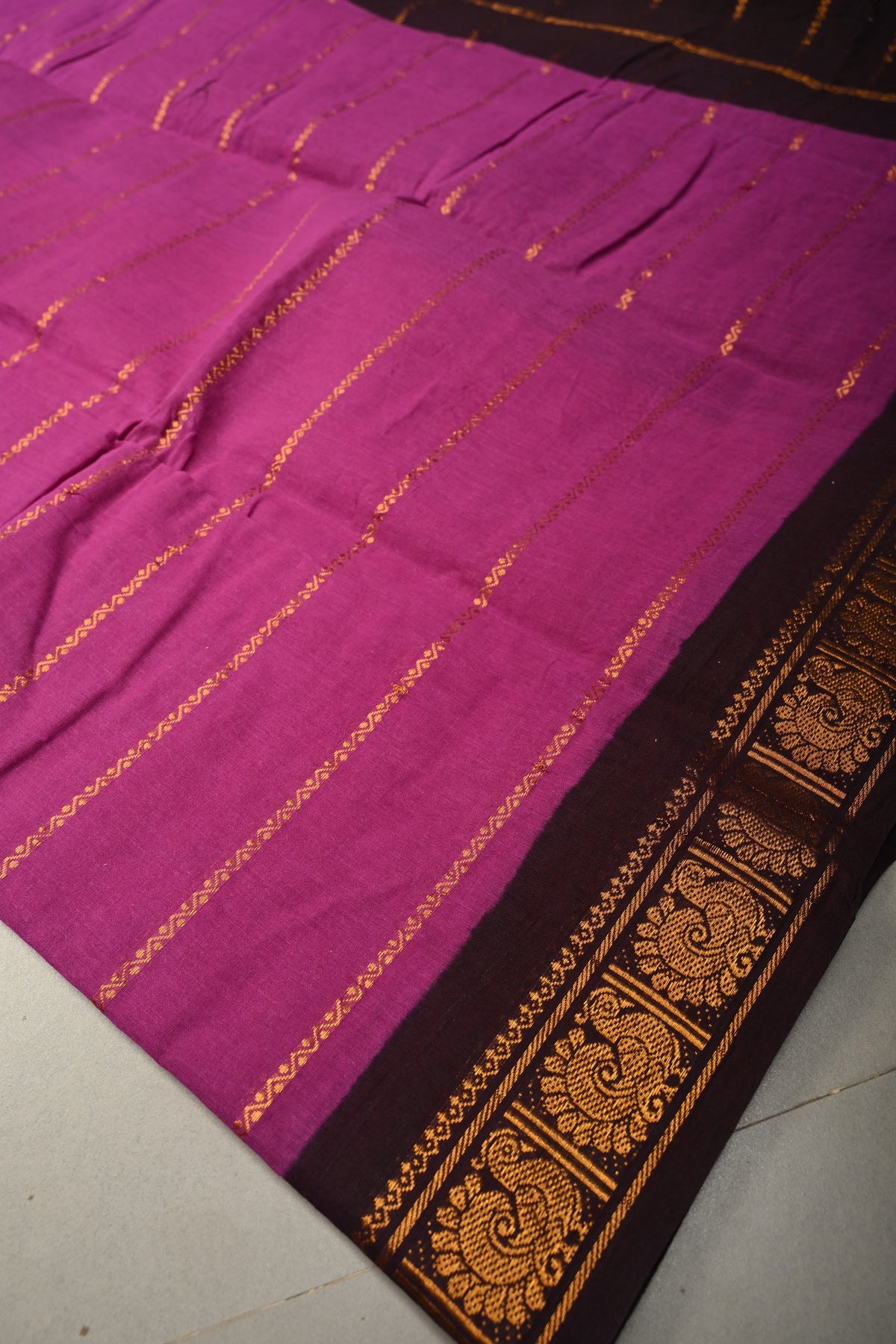 Embrace elegance with this Purple Veldhari Zari Stripes Saree on Madurai Cotton with Contrast Zari Border. Crafted from Madurai cotton, this saree offers a soft, breathable feel with a comfortable and graceful drape, perfect for all-day wear.