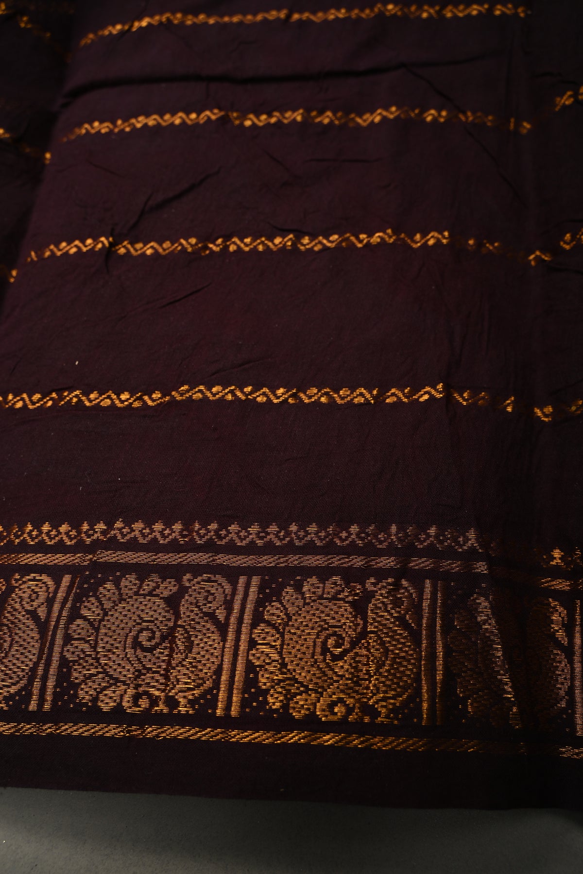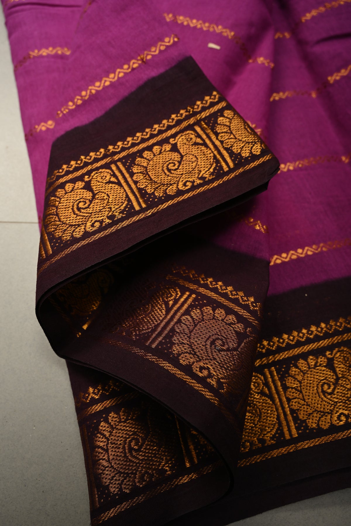 The purple base is adorned with traditional Veldhari zari stripes, adding a subtle shimmer and timeless South Indian charm. The beautifully woven contrast zari border enhances the saree’s appeal, giving it a refined and festive finish.