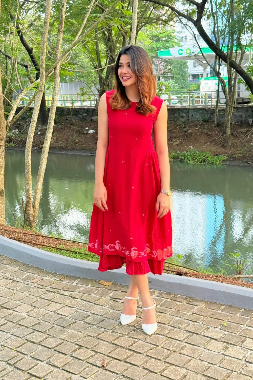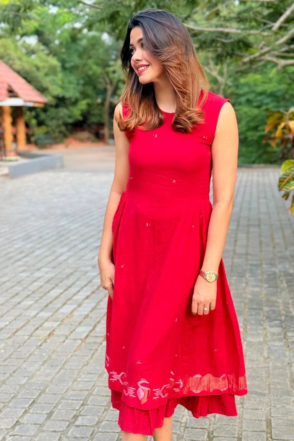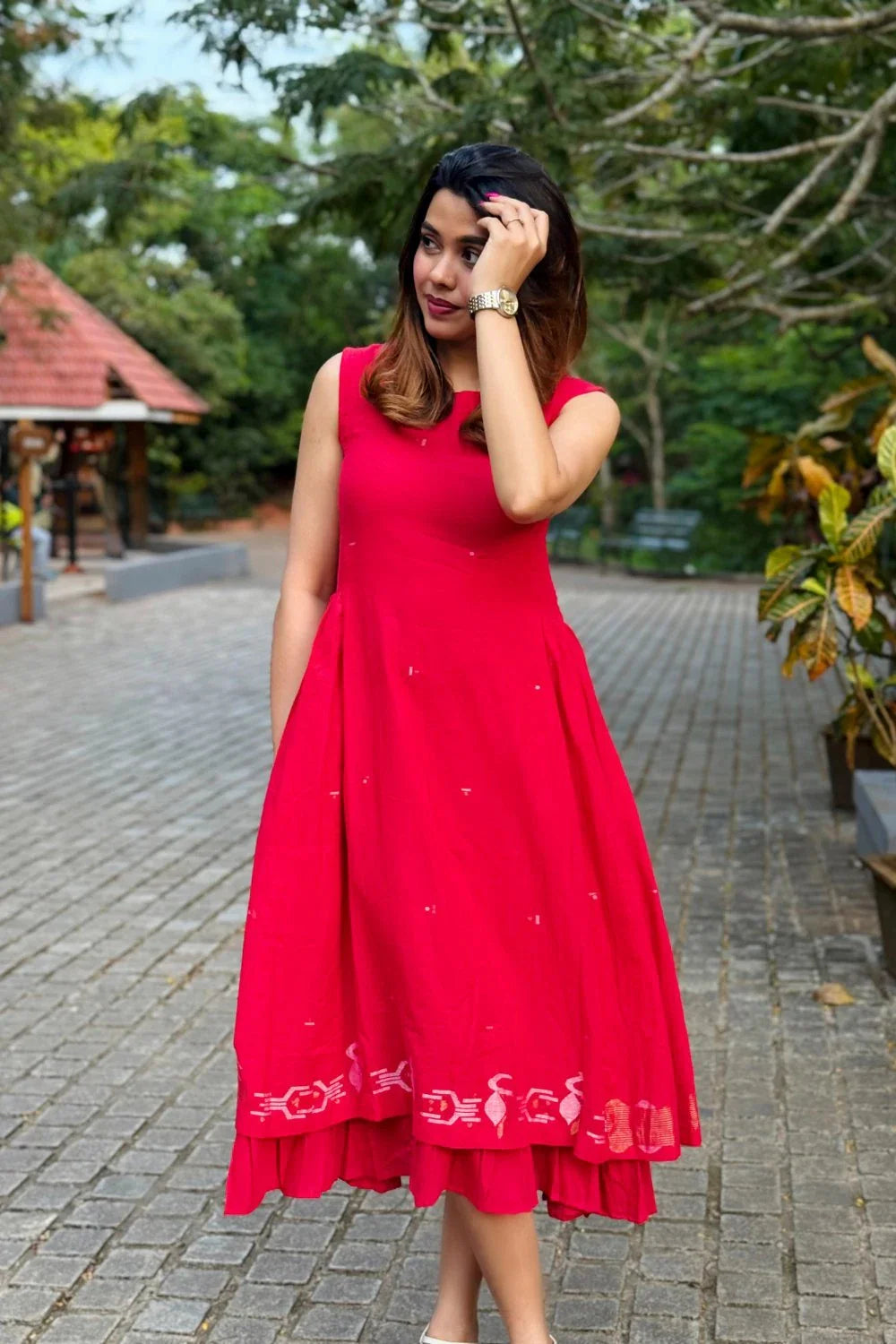 A striking red gathered Zari Jamdani dress, crafted in two layers with a sleeveless silhouette. Adorned with woven peacock motifs in shimmering Zari, it blends tradition with contemporary charm. Lightweight yet regal, this statement piece is perfect for festive evenings and special occasions, radiating elegance with every detail.
