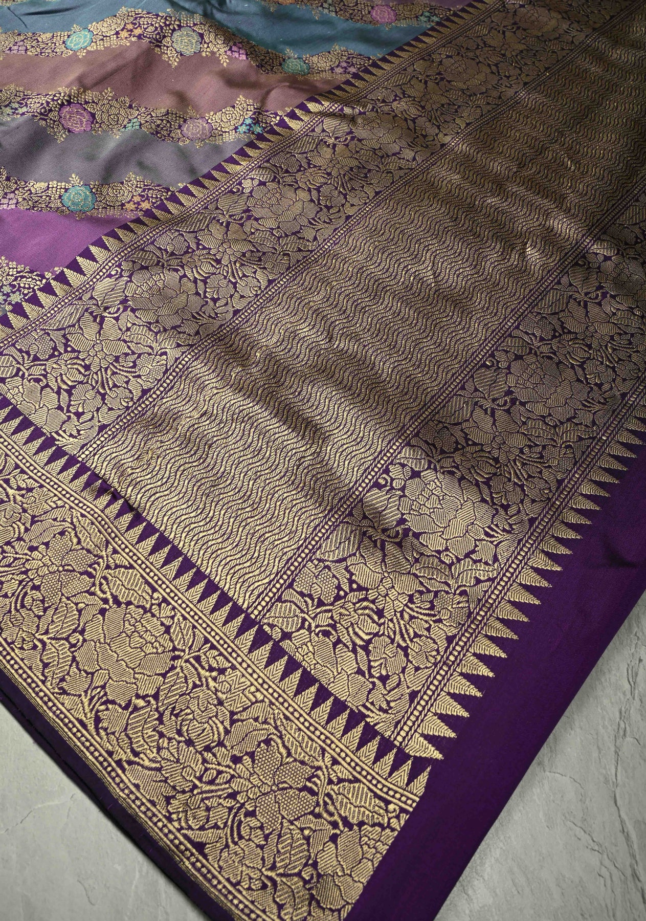 This Rangkaat Banarasi silk saree is a masterpiece of craftsmanship, blending two complementary colors seamlessly for a striking dual-tone effect. The body is meticulously woven using the Kadhuwa technique, a traditional handloom method where each motif is individually crafted, ensuring intricate and sharp detailing. The saree's elegance is further enhanced by diagonal zari stripes that flow across the fabric, adding a modern, dynamic flair. A rich zari border frames the entire piece, completing the look with a touch of classic Banarasi opulence. This saree is a perfect choice for those who appreciate the fusion of traditional artistry and contemporary design