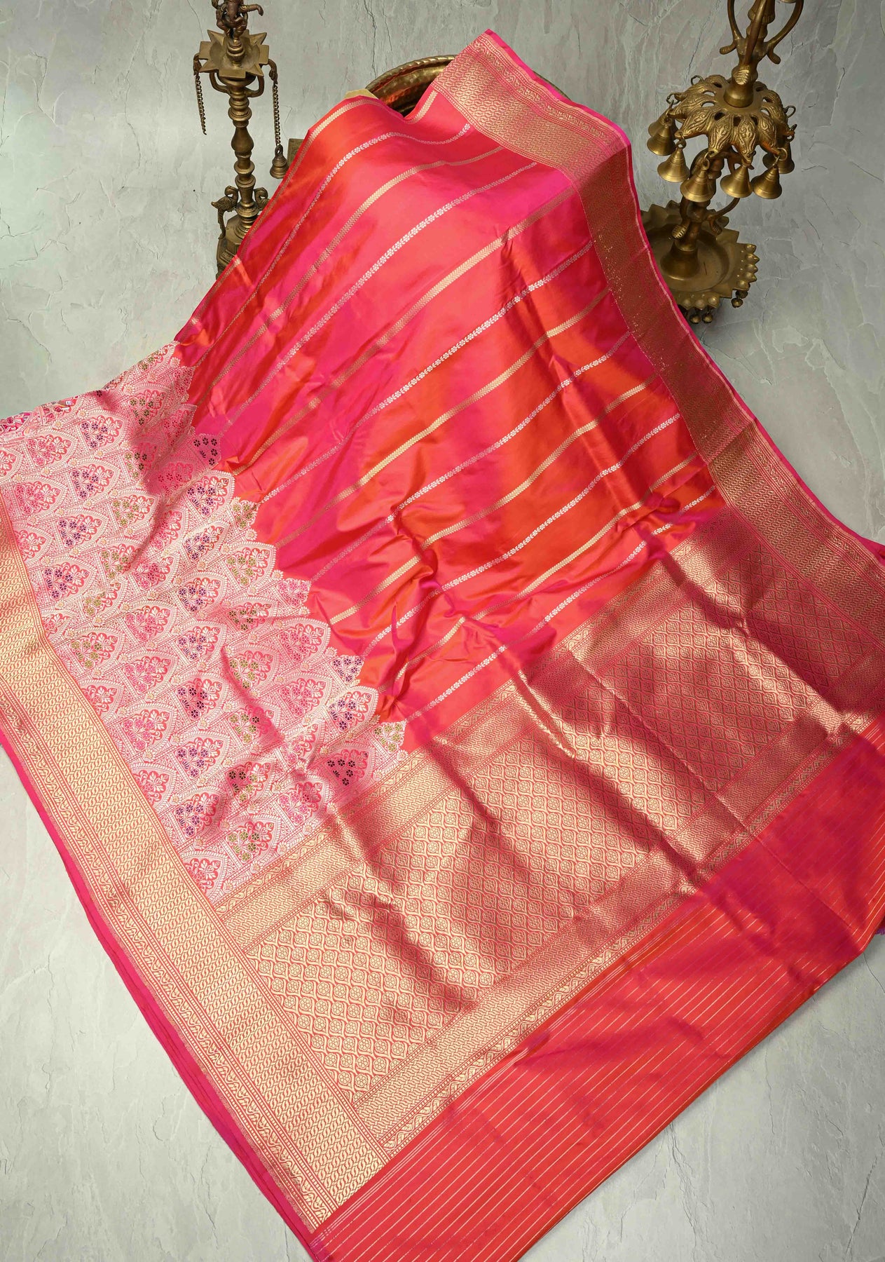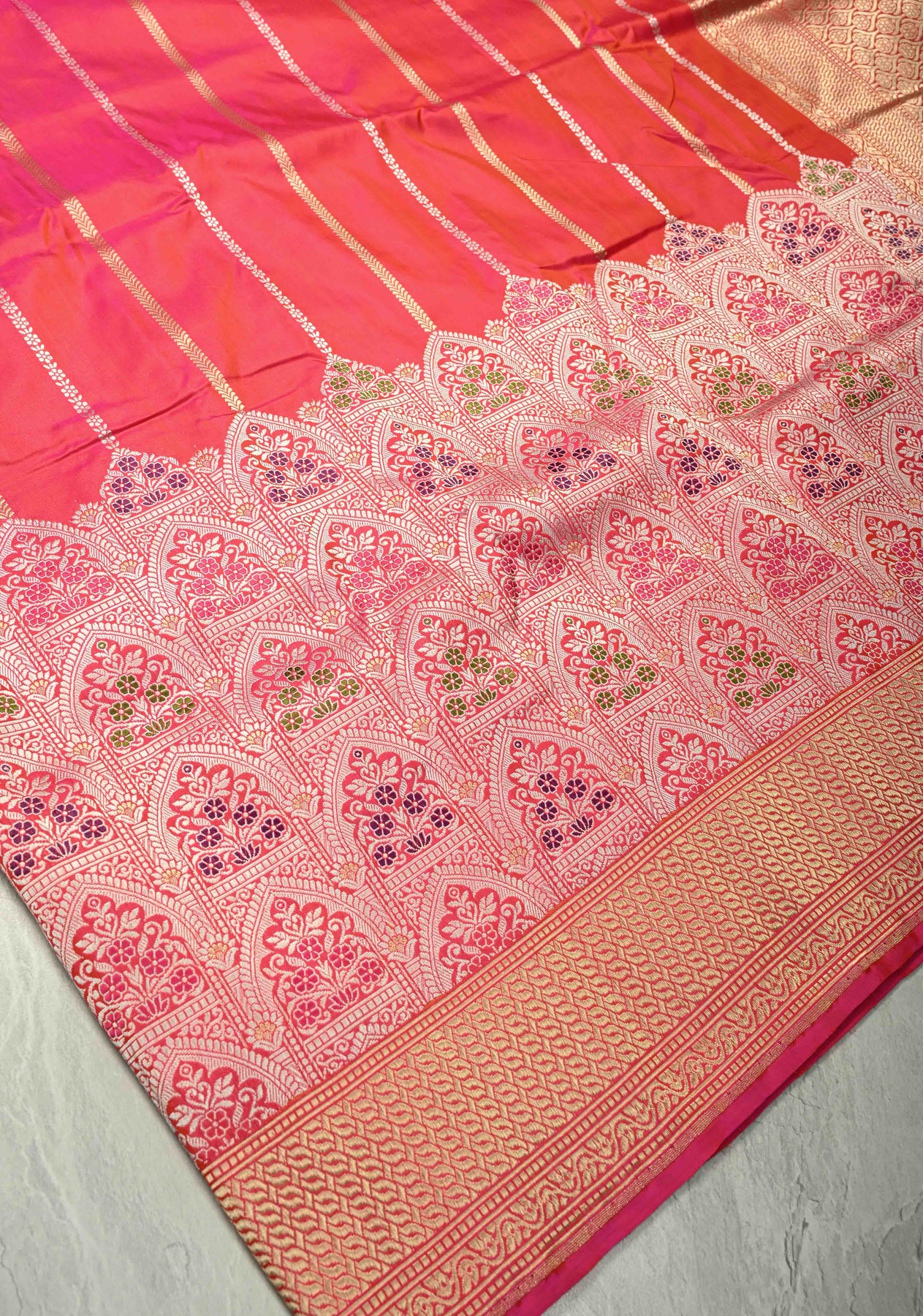 Striking and sophisticated, this Rani Pink Banarasi Katan Silk Saree is a celebration of classic elegance and fine craftsmanship. Woven from luxurious pure Katan silk, the saree features delicate vertical stripes that add graceful structure and subtle texture to the rich pink base. The true highlight lies in its intricately woven Meenakari Persian Trellis skirt border, a stunning display of floral and vine motifs in vibrant hues, inspired by Persian garden artistry. Perfect for weddings, festive occasions, or grand celebrations, this saree is a timeless blend of tradition, color, and contemporary appeal—a true Banarasi masterpiece