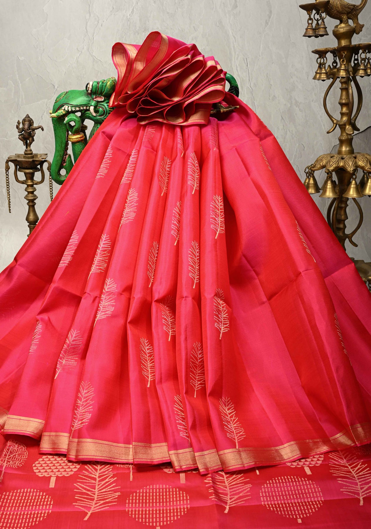 The dual-tone rani pink body is enhanced with delicate tree motifs, symbolizing growth and prosperity, intricately woven to add artistic charm. Completing the look is a minimal zari border, lending understated sophistication while keeping the focus on the elegant motifs. Ideal for weddings, festive gatherings, and traditional ceremonies, this saree is perfect for those who appreciate subtle grandeur.