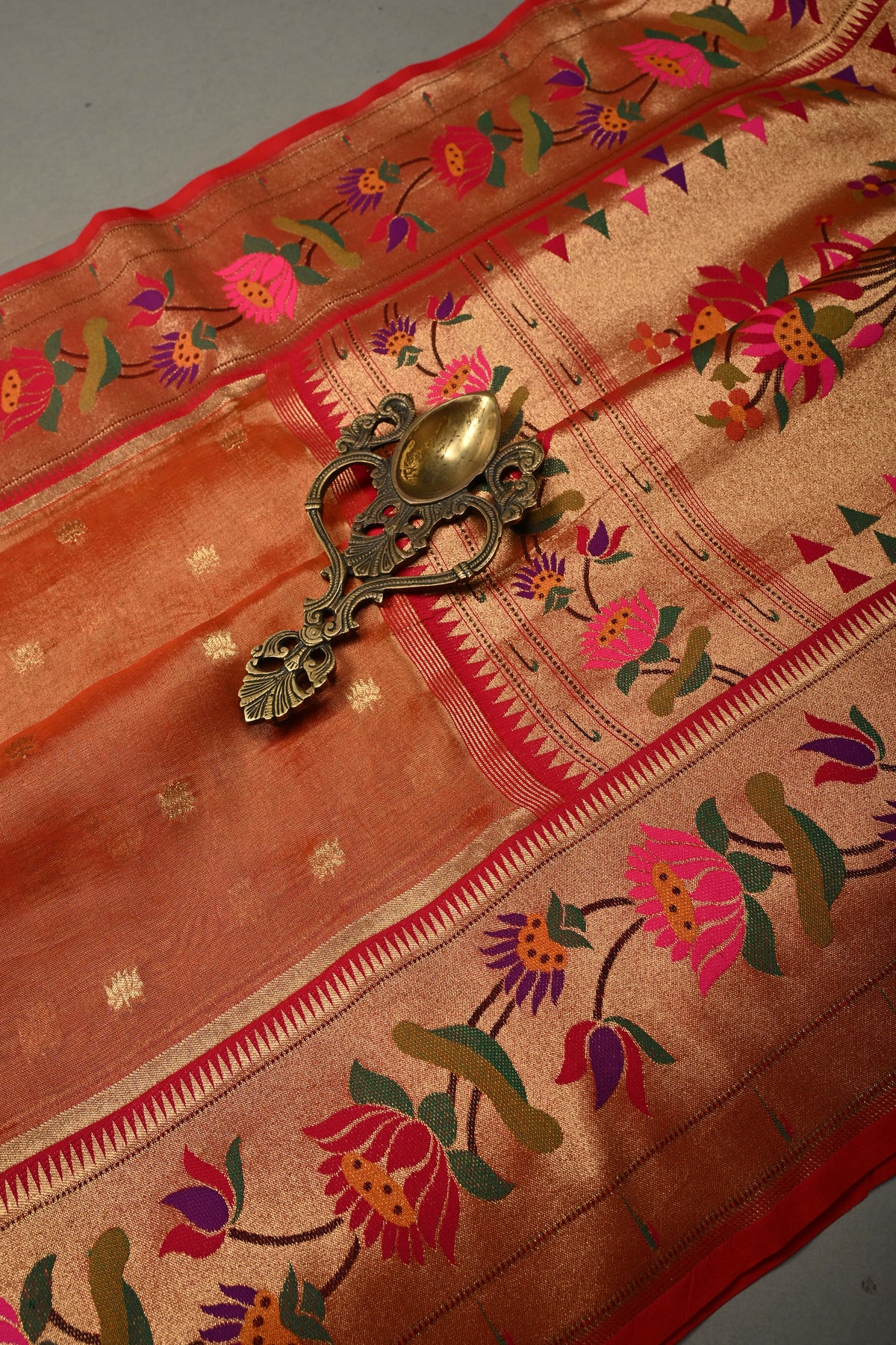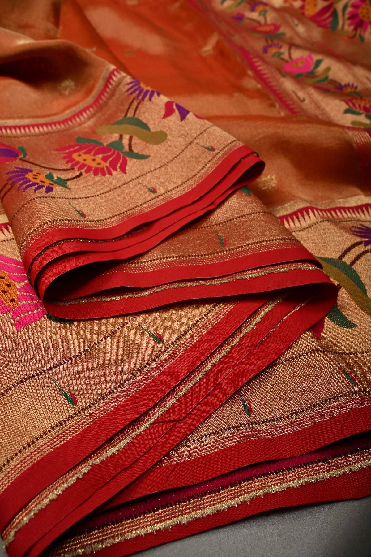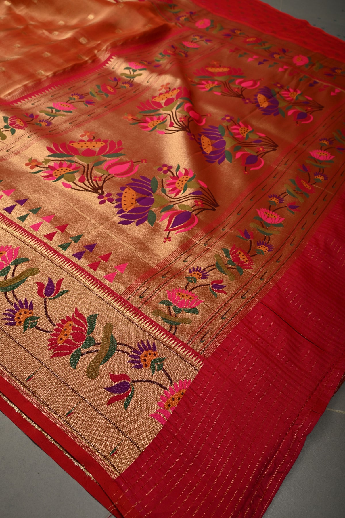Red and Gold Vegan Tissue Paithani Saree with Zari Buttas and Raj Kamal Meenakari Border
