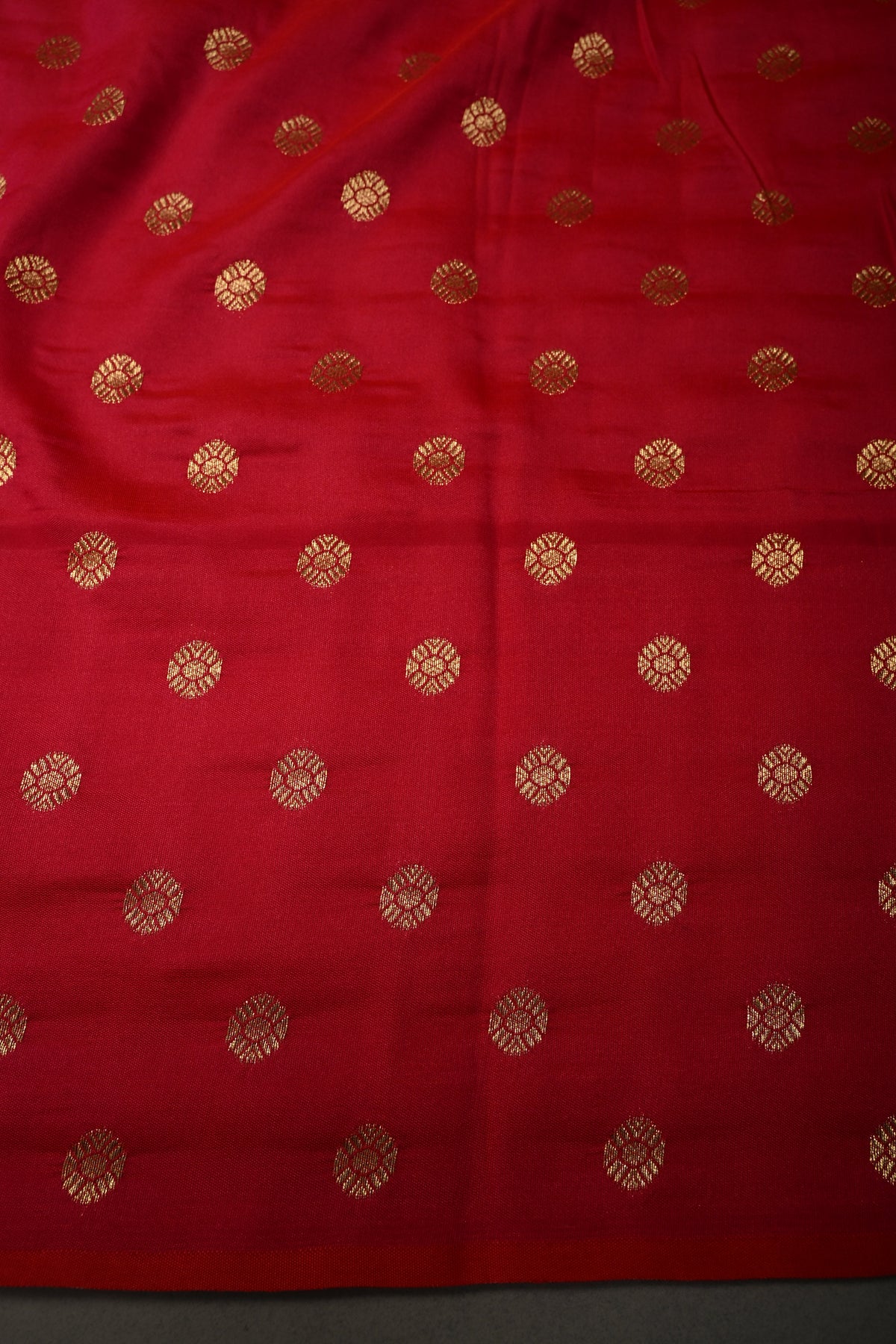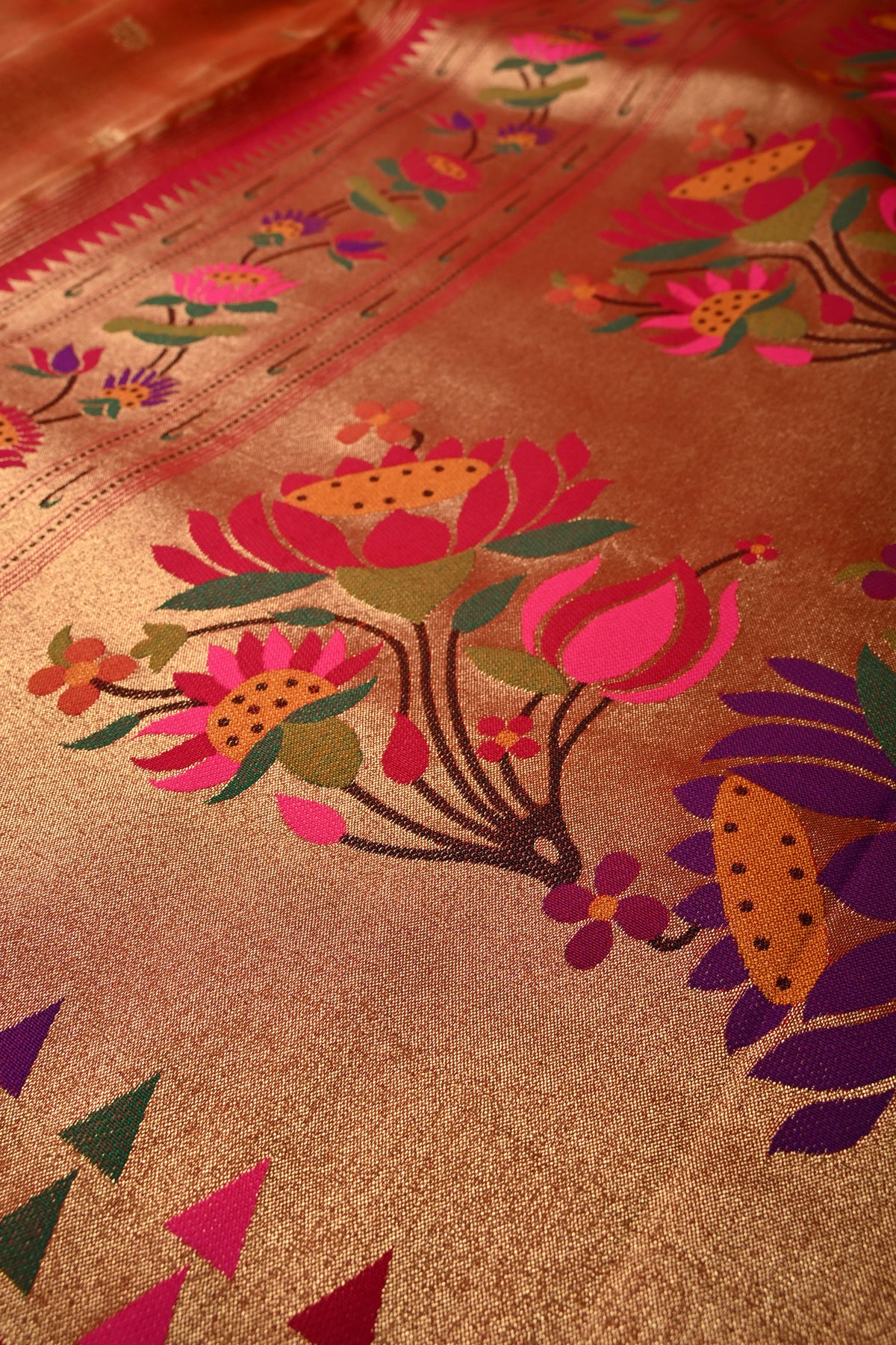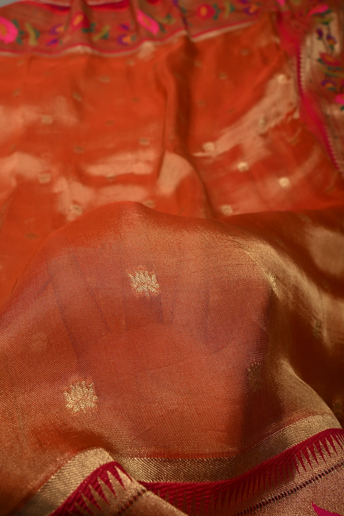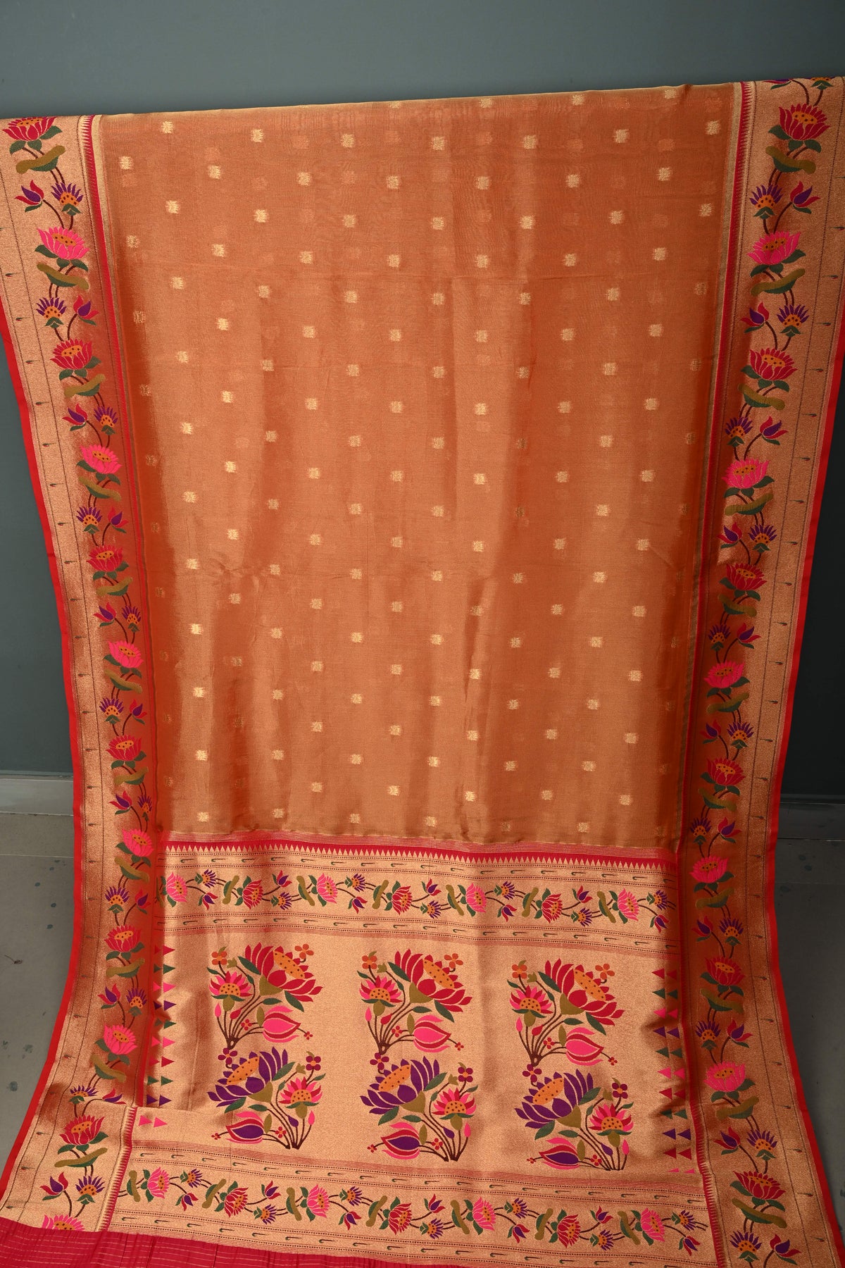 Red and Gold Vegan Tissue Paithani Saree with Zari Buttas and Raj Kamal Meenakari Border