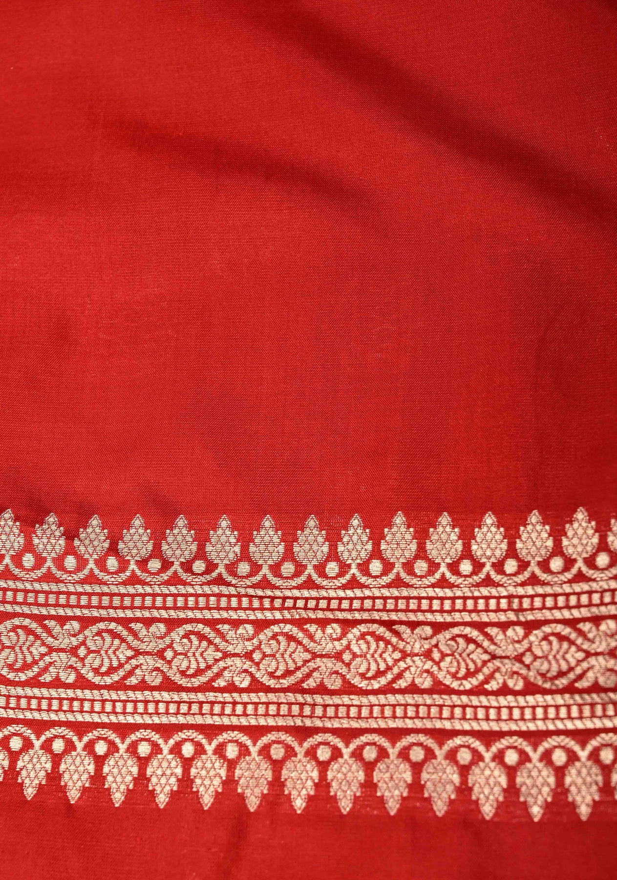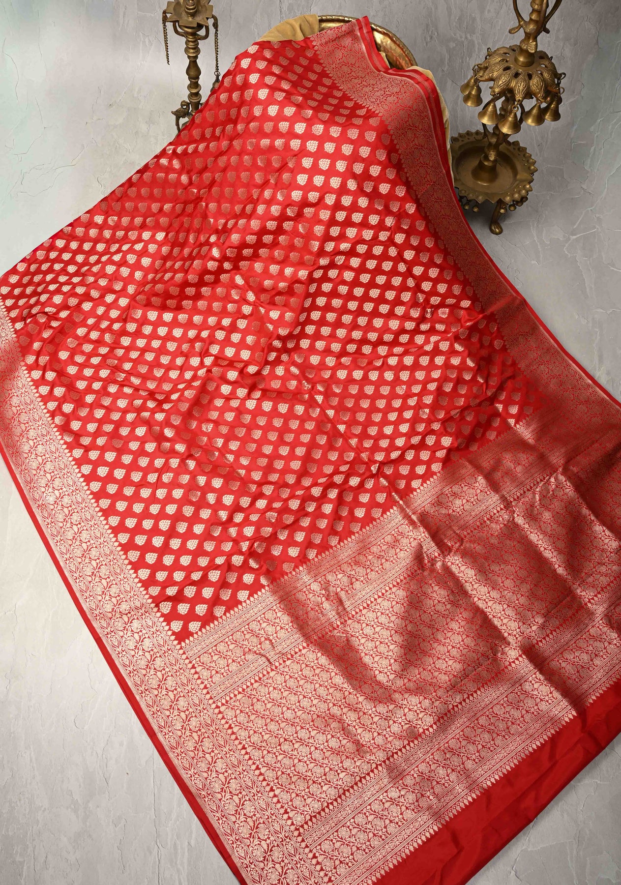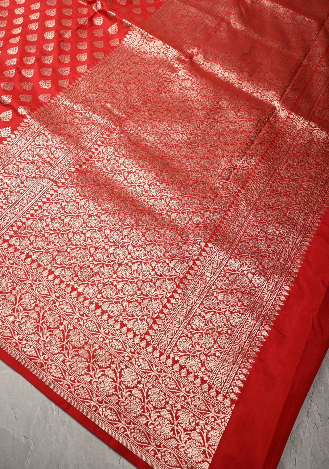 Red Pure Banarasi Katan Silk Saree with Floral Buttas Brocade and Zari Border | SILK MARK CERTIFIED
