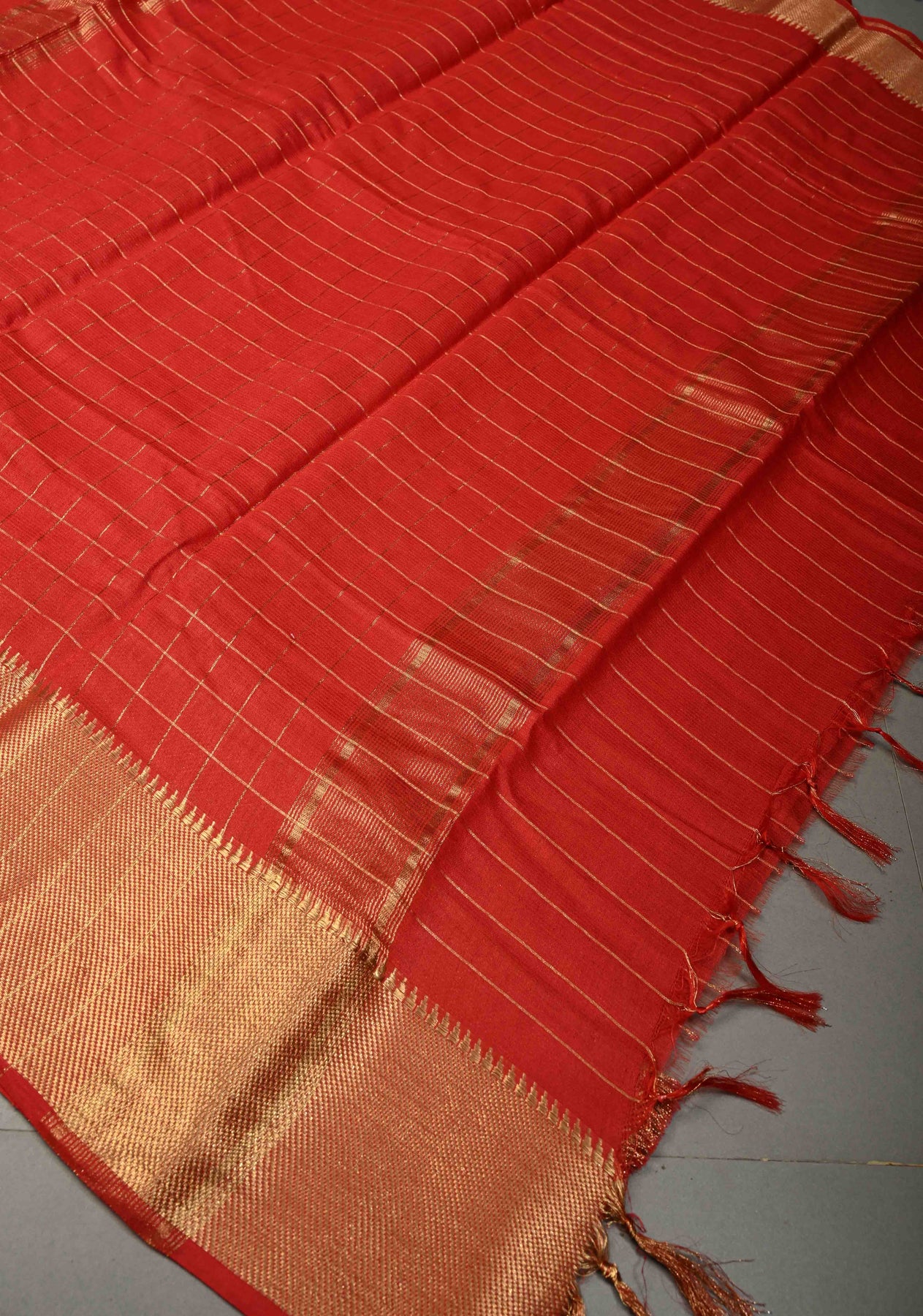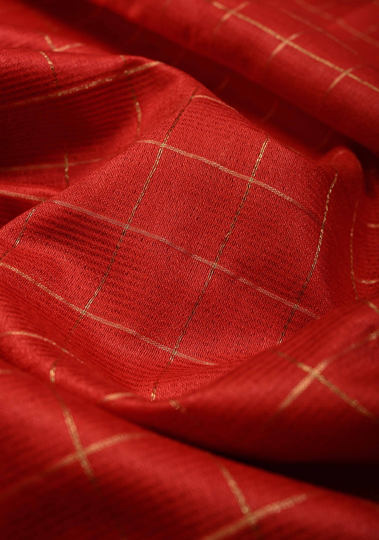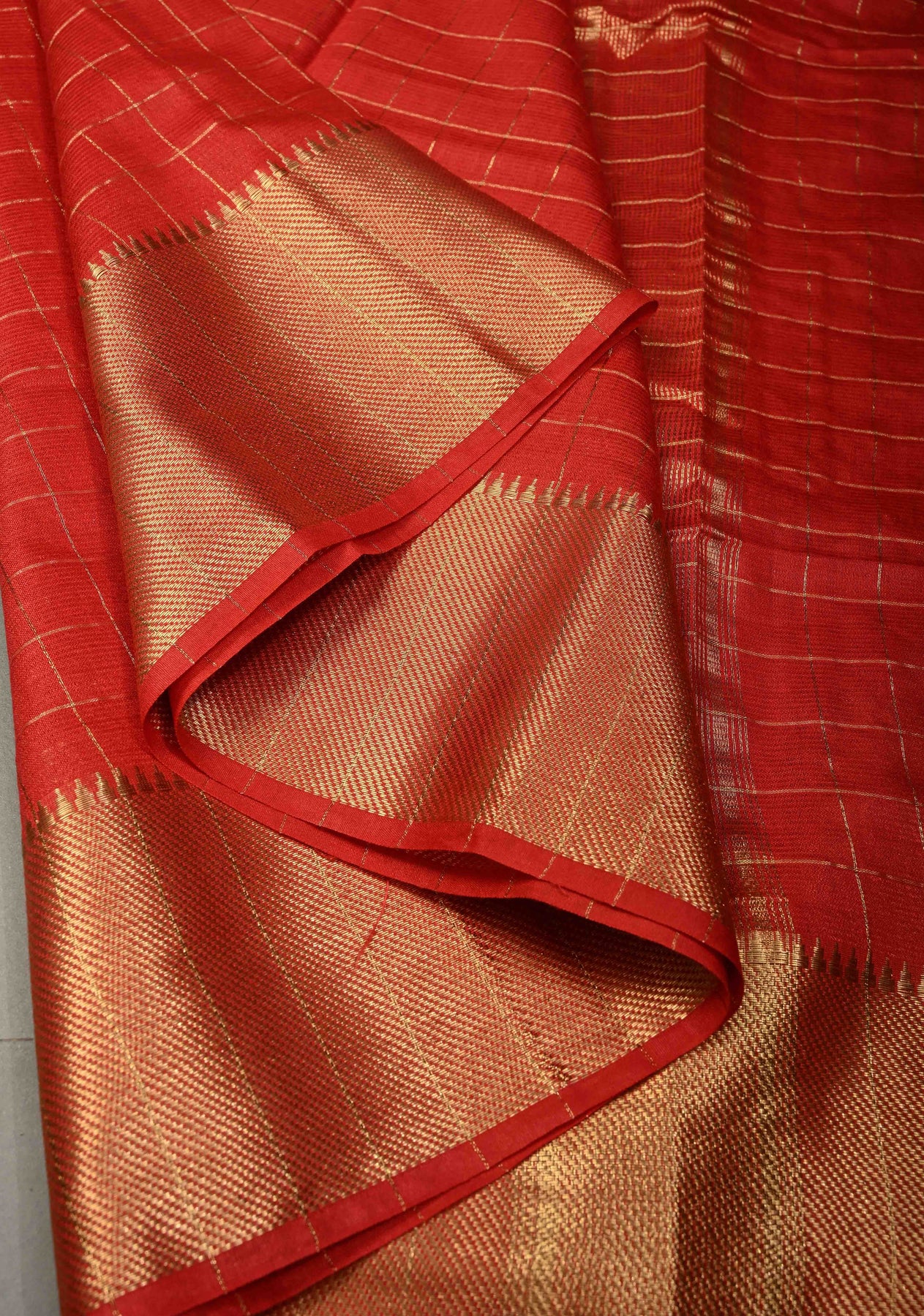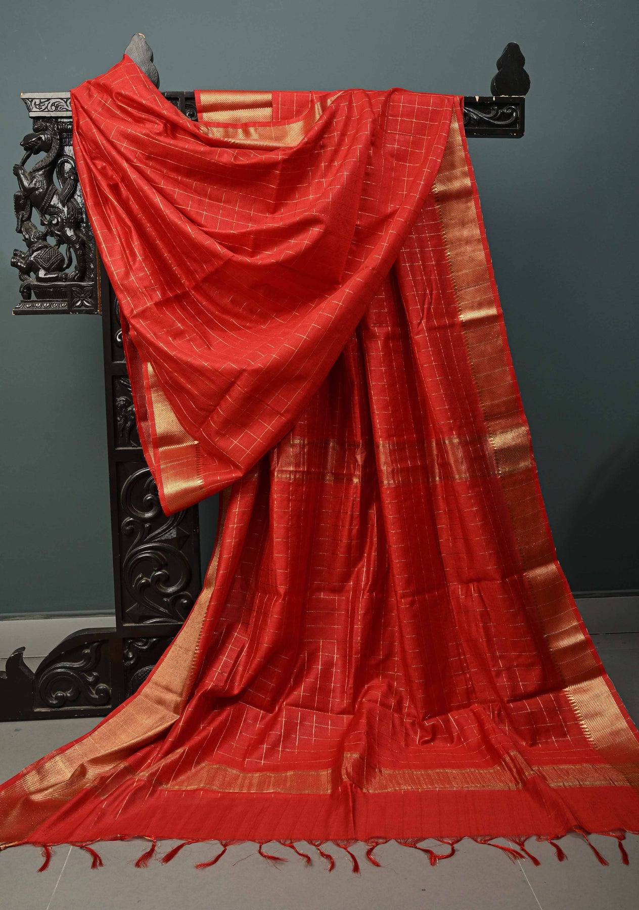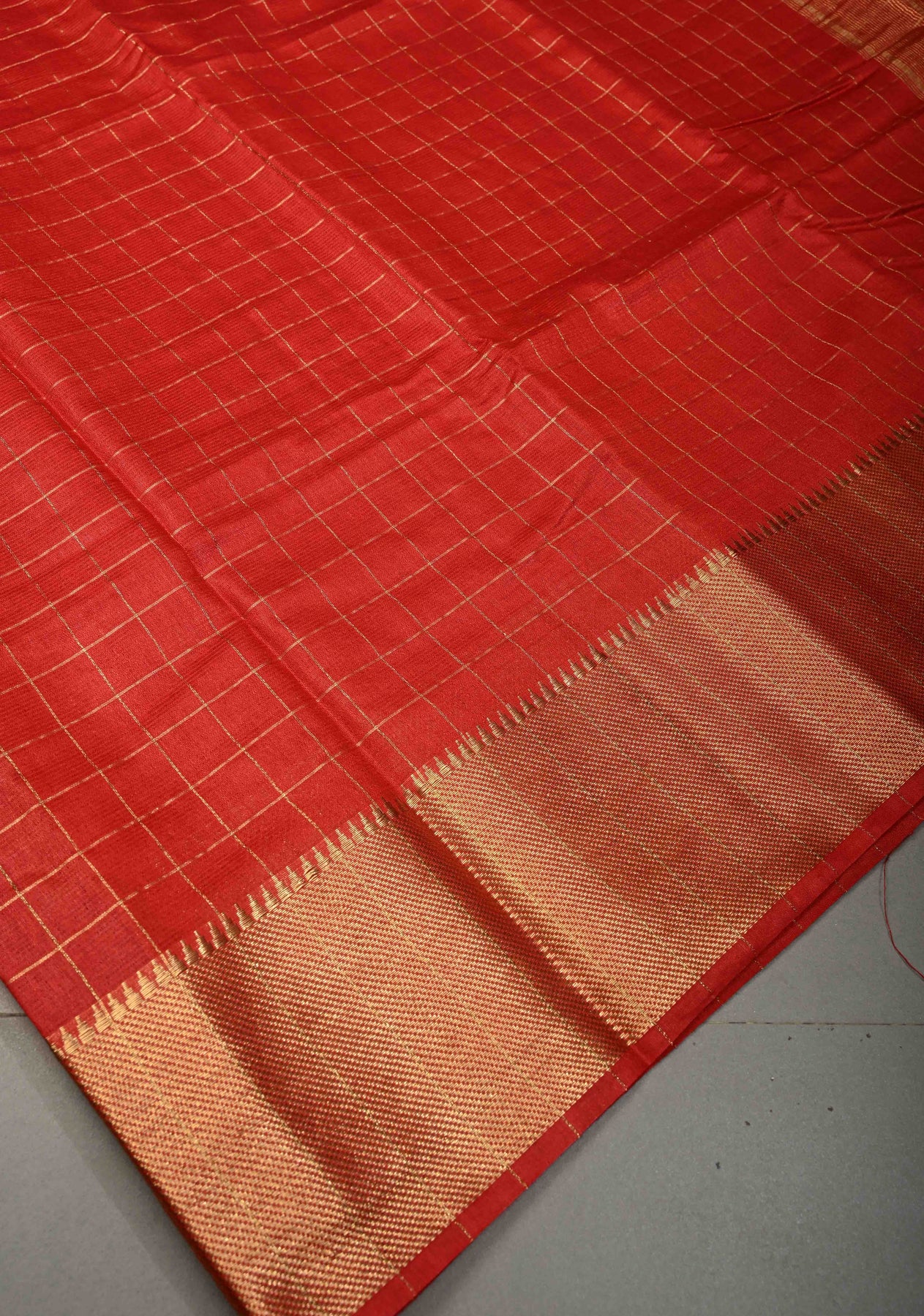 Make a bold statement with this Red Semi Tussar Saree, crafted from soft, lightweight fabric for a graceful drape. The deep blood red body features intricate zari checks, adding subtle shimmer and texture, while a beautifully woven temple zari border enhances its traditional charm. Perfect for weddings, festive occasions, and cultural celebrations, this saree blends contemporary elegance with timeless heritage, creating a striking look for special moments.