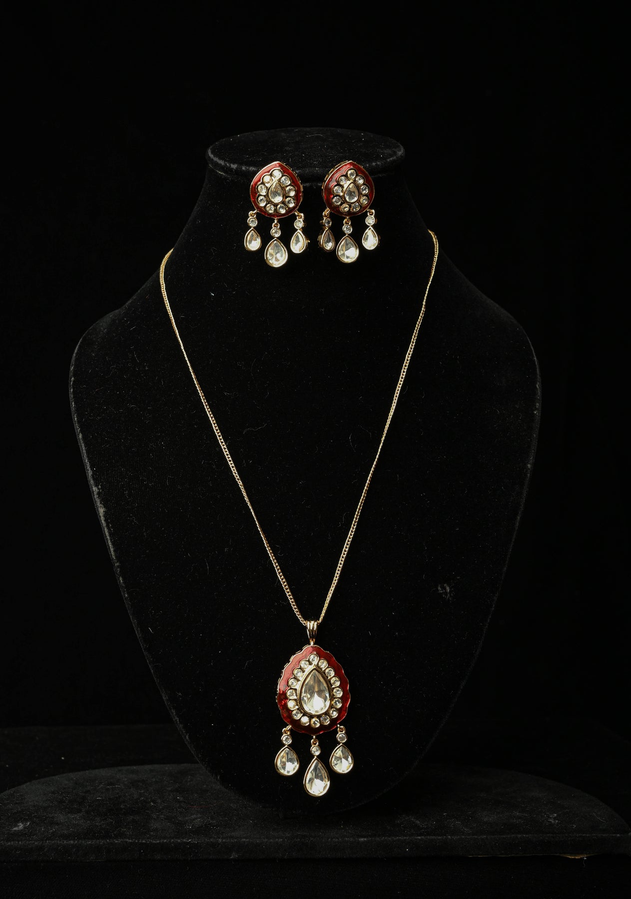The Red Stone Pendant Necklace with Earrings is a captivating jewelry set that combines elegance with vibrant charm. The necklace features a beautifully crafted pendant adorned with striking red stones, exuding a bold yet graceful appeal. The matching earrings complement the pendant perfectly, creating a cohesive and stylish look. Ideal for weddings, festive celebrations, or special occasions, this set enhances any outfit with a touch of sophistication and color. With its exquisite detailing and polished finish, the Red Stone Pendant Necklace with Earrings is a must-have accessory for adding timeless beauty and elegance to your jewelry collection.