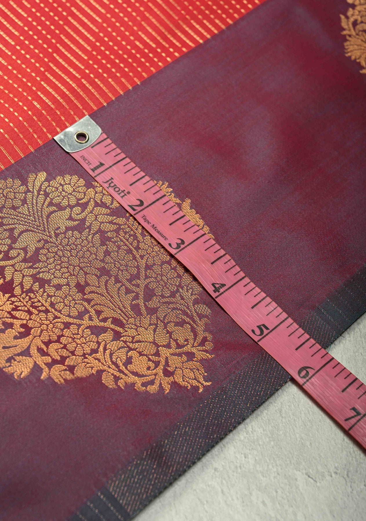 This elegant Kanchi semi-silk saree features striking red vertical zari stripes that add a rich, luminous texture to the drape. The body is beautifully adorned with intricate floral buttas, giving it a traditional yet refined charm. Complementing the red is a contrast border embellished with distinct, finely woven motifs that enhance the saree’s overall grandeur. Lightweight yet luxurious, this saree perfectly blends classic Kanchi craftsmanship with contemporary appeal, making it ideal for festive occasions, weddings, and special celebrations.