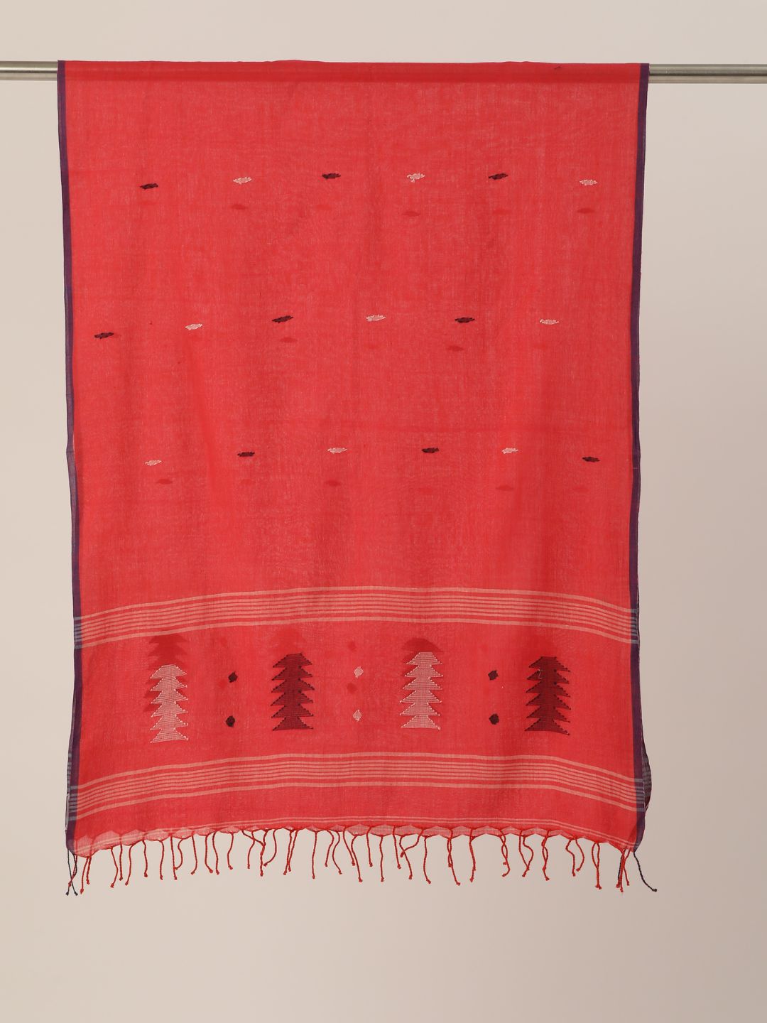 Authentic Red,Blue and White handloom cotton jamdani stole . The Dhakai Jamdani technique originates from Dhaka and East Bengal regions. Adorned with tassels on both ends, this elegant Jamdani stole offers the best of ethnic style to accessorise any outfit with some sophistication