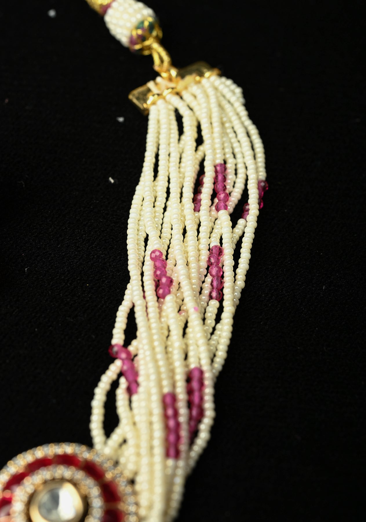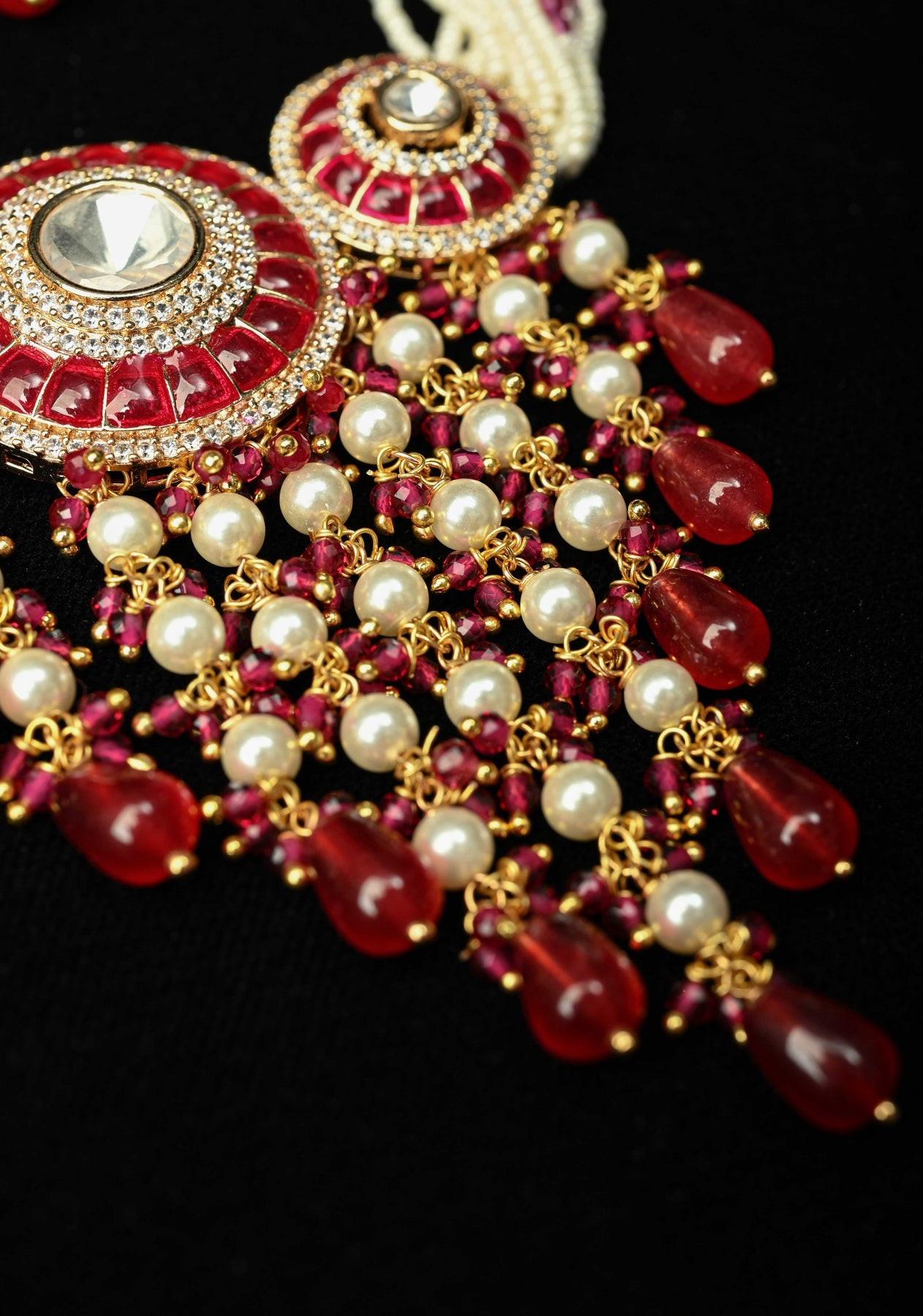 The Red White Kundan Jadau Necklace and Earring Set is an exquisite jewelry ensemble that radiates elegance and traditional charm. Featuring intricate Kundan and Jadau craftsmanship, the necklace is adorned with vibrant red and sparkling white stones, creating a striking and luxurious contrast. The matching earrings perfectly complement the necklace, completing a harmonious and sophisticated look. Ideal for weddings, festive celebrations, and special occasions, this set adds a regal touch to any outfit. With its meticulous detailing and polished finish, the Red White Kundan Jadau Necklace and Earring Set is a timeless accessory that elevates your style and makes a lasting impression.