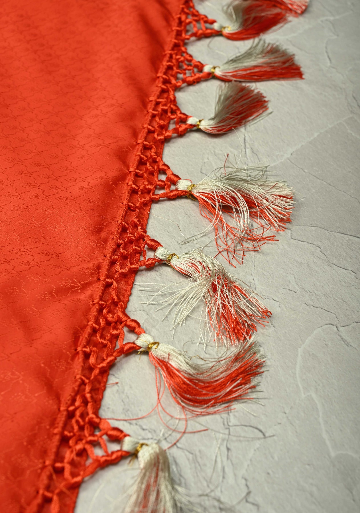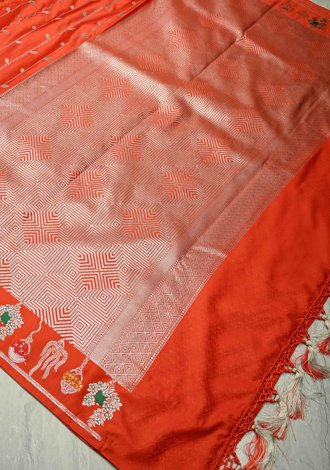 This Reddish Orange Banarasi Semi Mashru Silk Saree is a striking blend of vibrant color and traditional craftsmanship. Handwoven from semi mashru silk, the saree features intricate Meenakari vertical ornate zari stripes that add a rich, regal shimmer to the fabric. Its lively reddish-orange hue exudes festive charm, while the lightweight silk drapes gracefully, making it perfect for weddings, celebrations, and special occasions where elegance meets tradition.