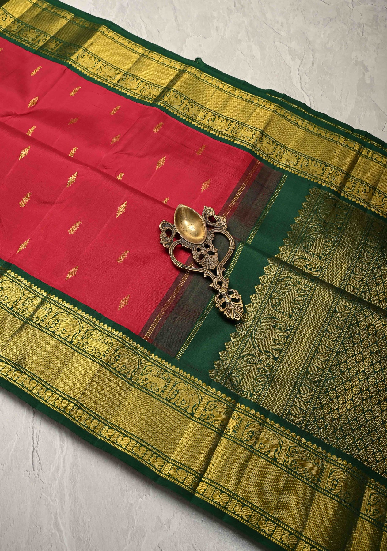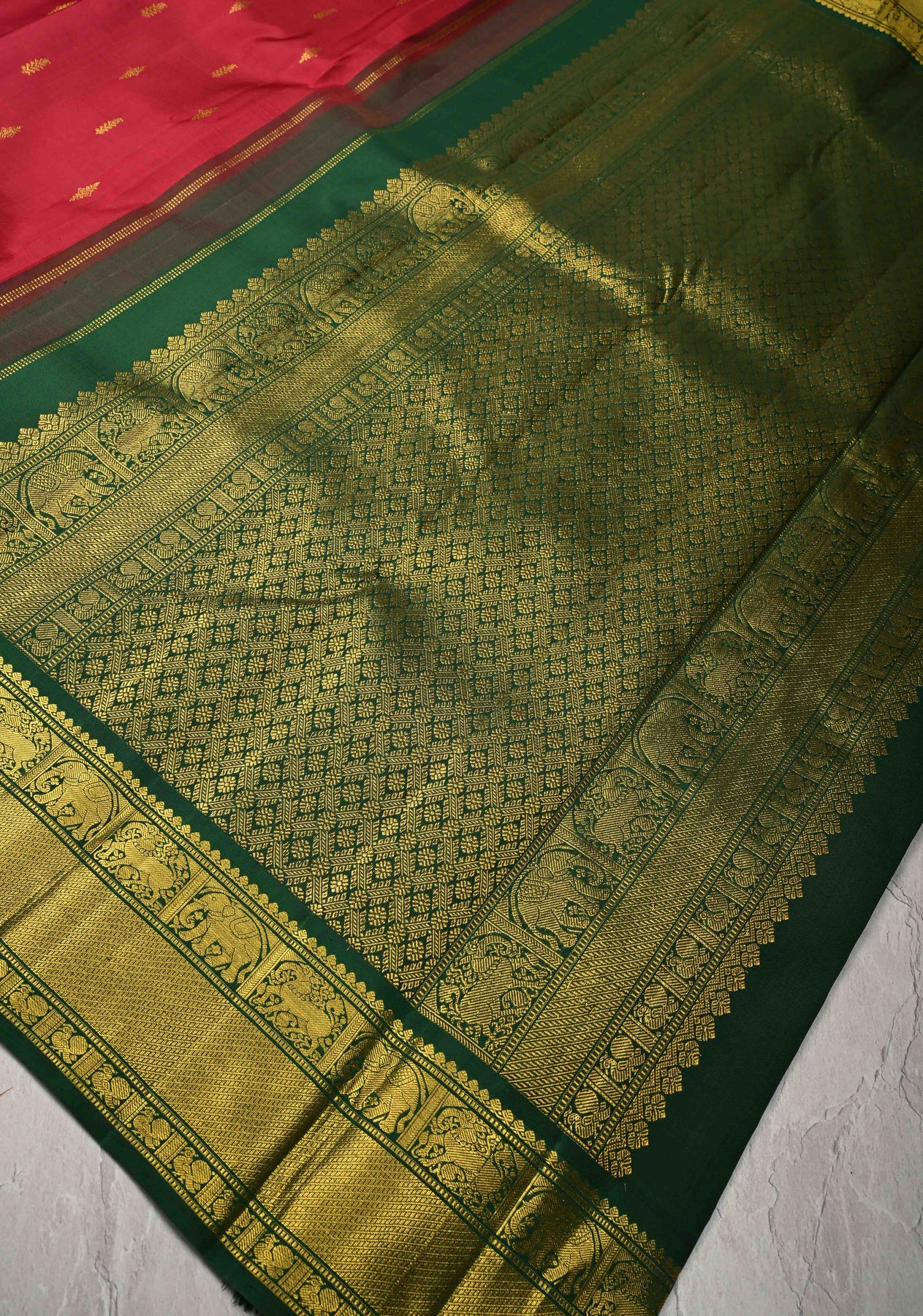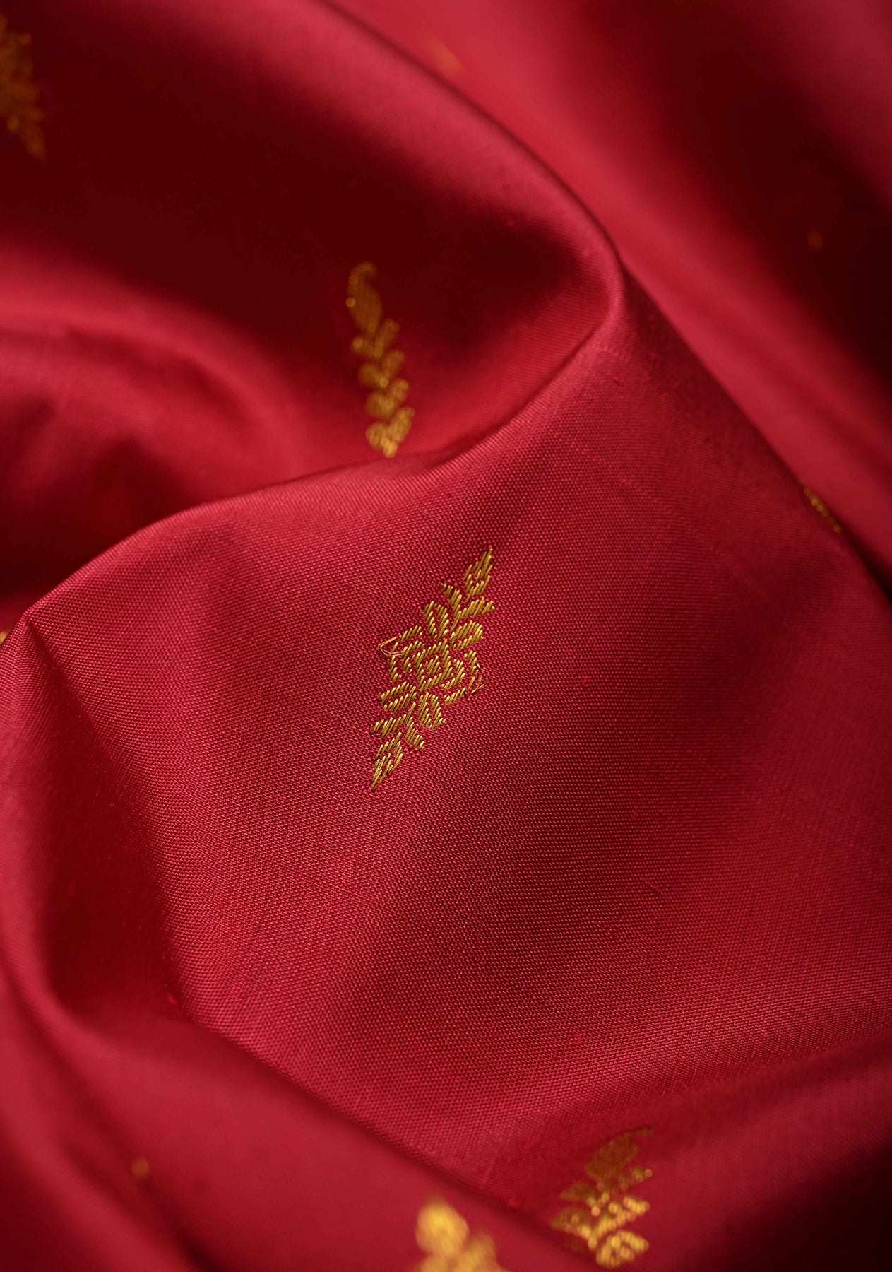 This Reddish Pink Korvai Kanjivaram Pure Silk Saree is a rich blend of tradition and elegance. The Reddish Pink silk base is beautifully adorned with intricate floral zari buttas, adding delicate shimmer and timeless charm to the fabric. Highlighted by a striking contrast zari border, the saree exudes regal sophistication and festive grandeur. Woven from pure silk, it drapes smoothly and comfortably, making it an ideal choice for weddings, celebrations, and special occasions. A classic masterpiece that celebrates heritage with graceful artistry.