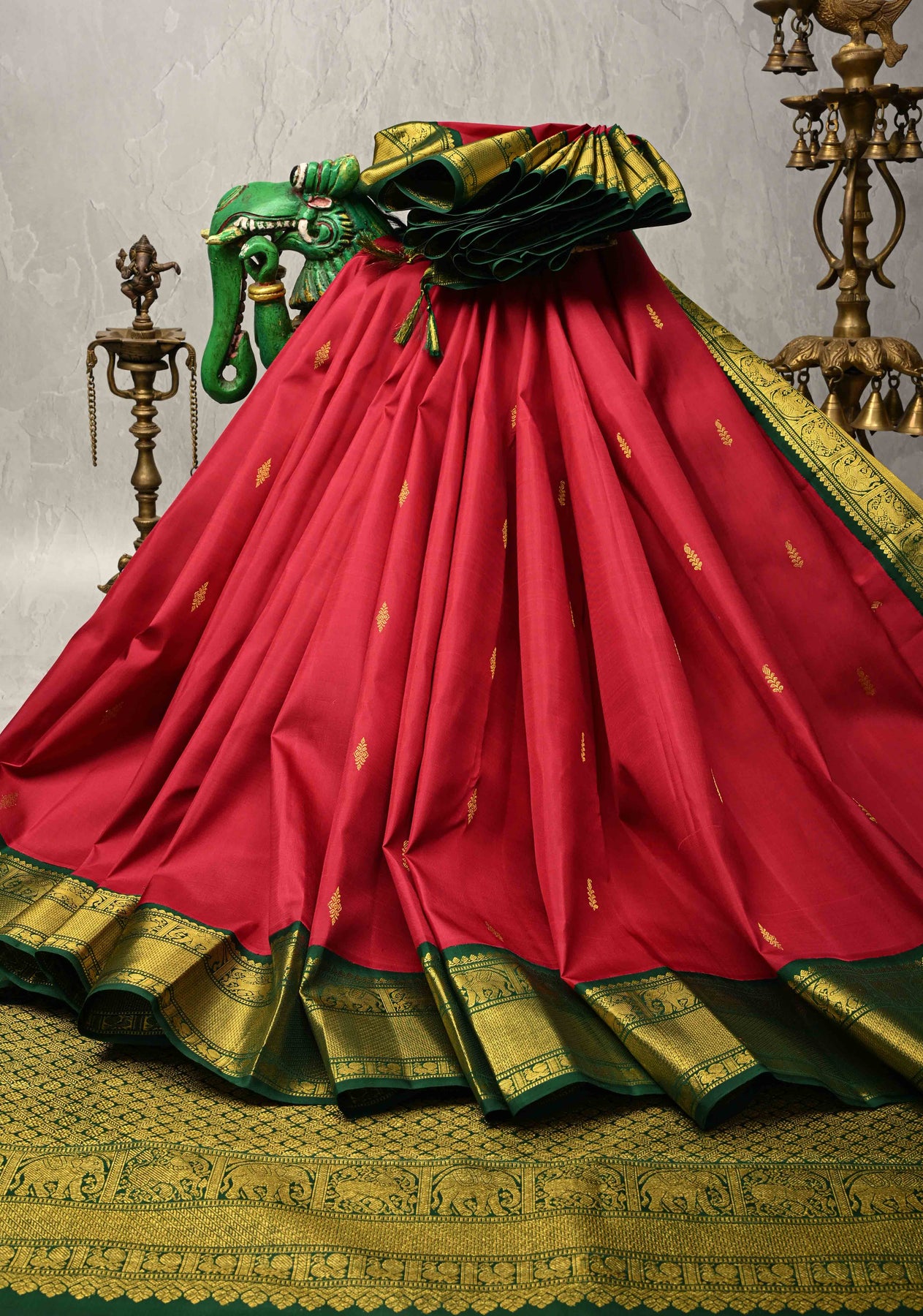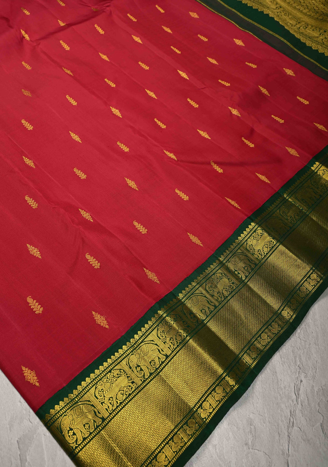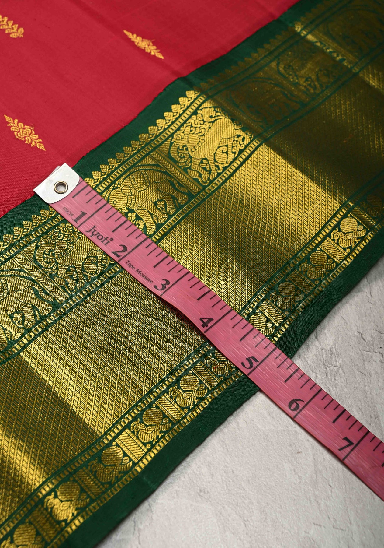 This Reddish Pink Korvai Kanjivaram Pure Silk Saree is a rich blend of tradition and elegance. The Reddish Pink silk base is beautifully adorned with intricate floral zari buttas, adding delicate shimmer and timeless charm to the fabric. Highlighted by a striking contrast zari border, the saree exudes regal sophistication and festive grandeur. Woven from pure silk, it drapes smoothly and comfortably, making it an ideal choice for weddings, celebrations, and special occasions. A classic masterpiece that celebrates heritage with graceful artistry.