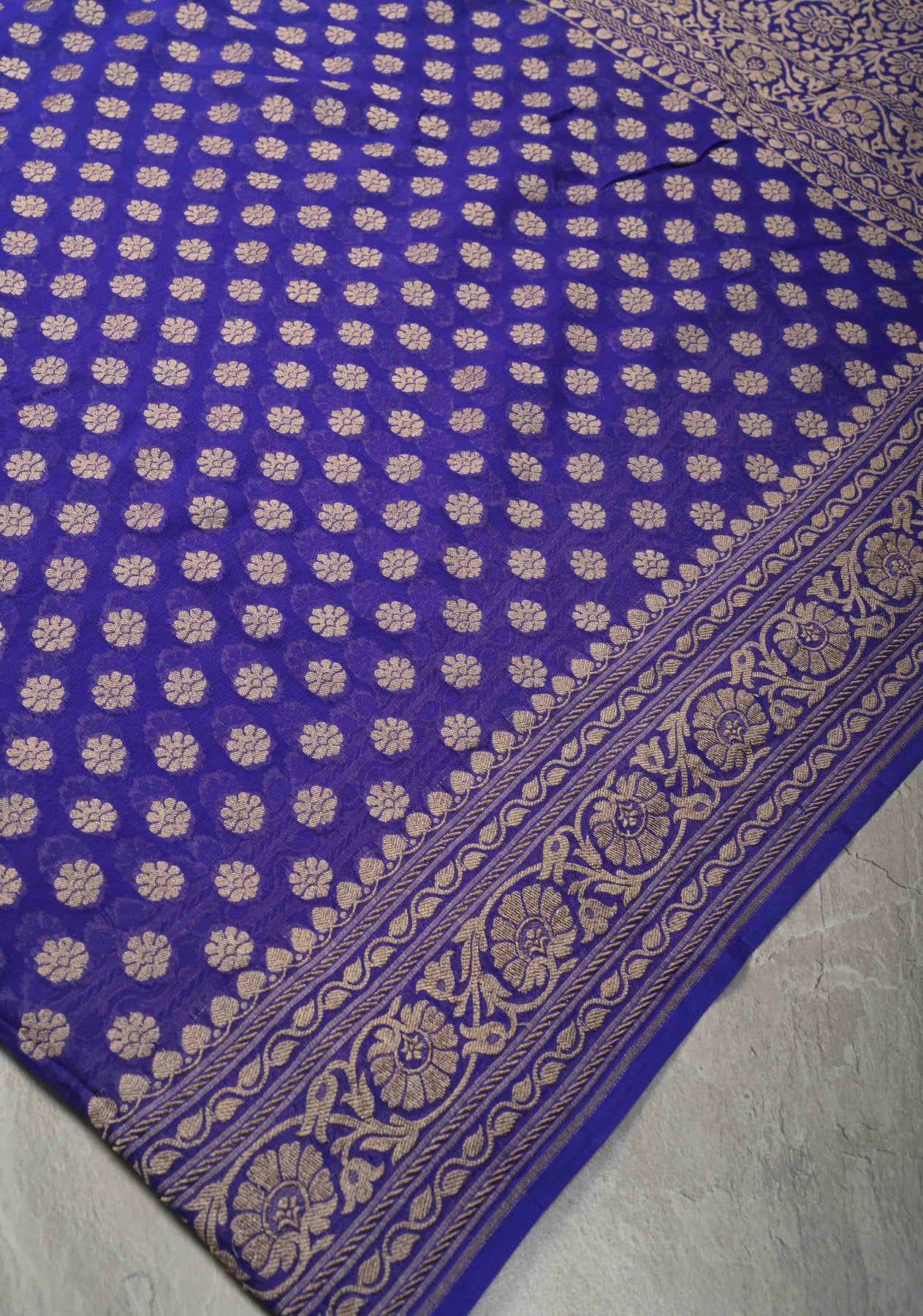 Drape yourself in regal elegance with this stunning royal blue Banarasi georgette silk saree. The lightweight and fluid georgette silk fabric ensures a graceful fall, making it a comfortable yet luxurious choice. The saree's body is adorned with delicate floral buttas meticulously woven throughout, adding a touch of classic femininity. A shimmering zari border frames the saree, providing a rich contrast and a touch of traditional Banarasi opulence. This piece is a perfect fusion of timeless design and contemporary comfort, ideal for evening events and special occasions.