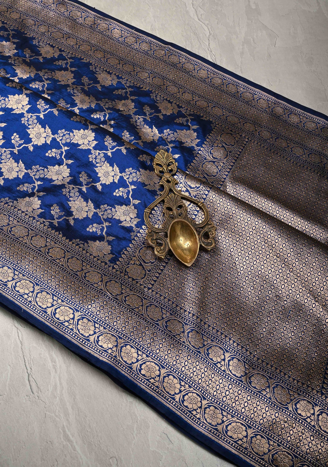 Royal Blue Banarasi Katan Silk Saree with Floral Brocade Jaal and Zari Border | SILK MARK CERTIFIED