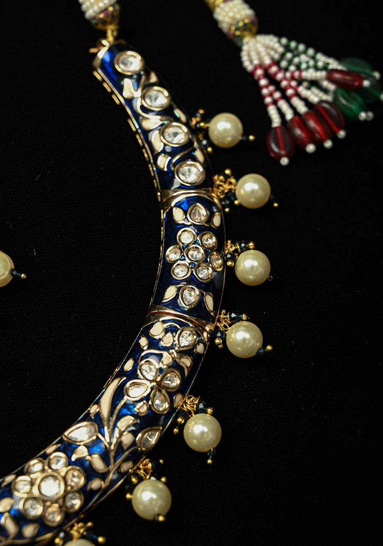 Experience the elegance of our Sapphire Blue Hasli Necklace Set. Handcrafted with exquisite Kundan and Meenakari work, this stunning piece is sure to elevate any outfit. The rich blue hue adds a regal touch, making it a must-have for special occasions. Make a statement with this unique and intricate design.