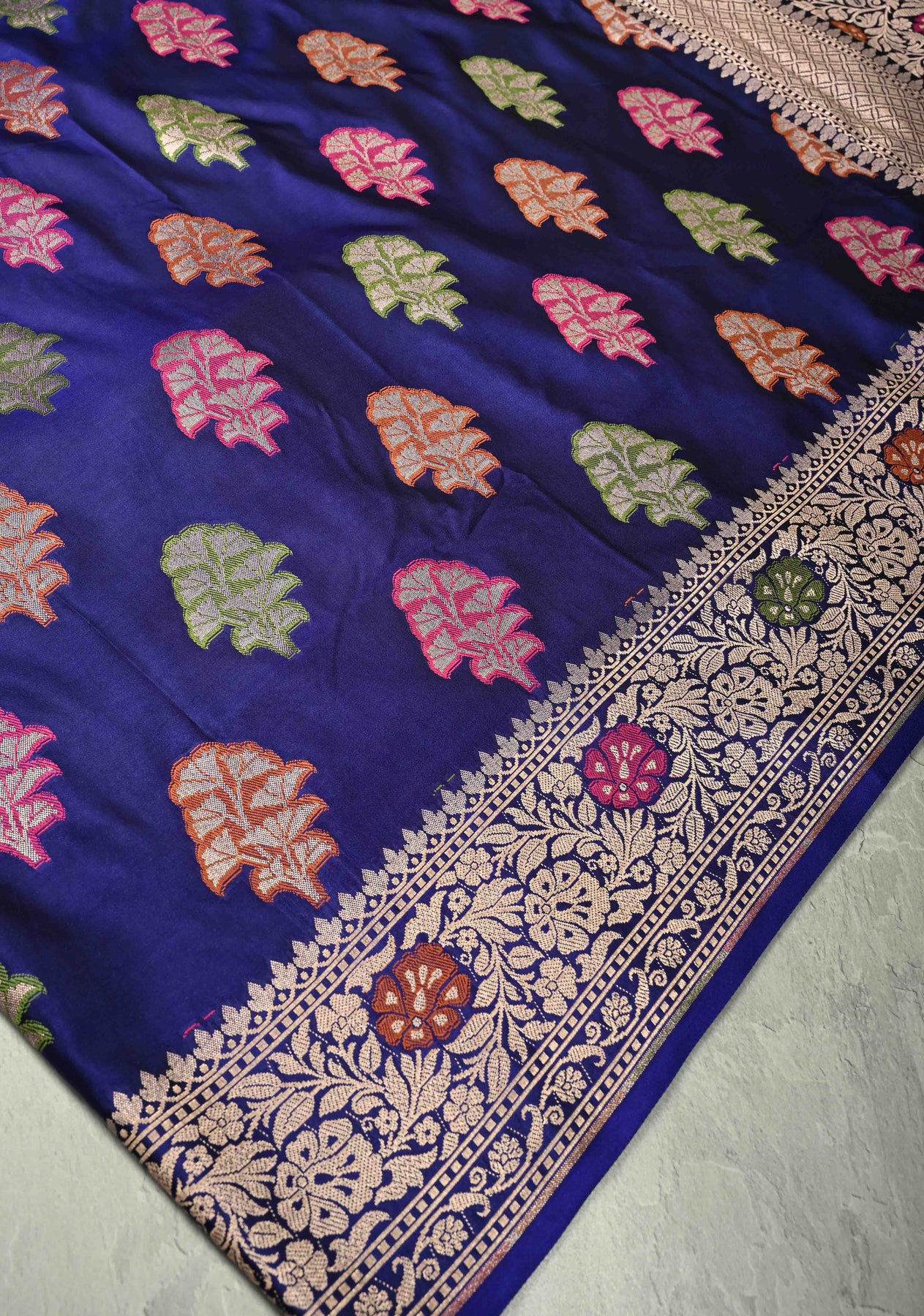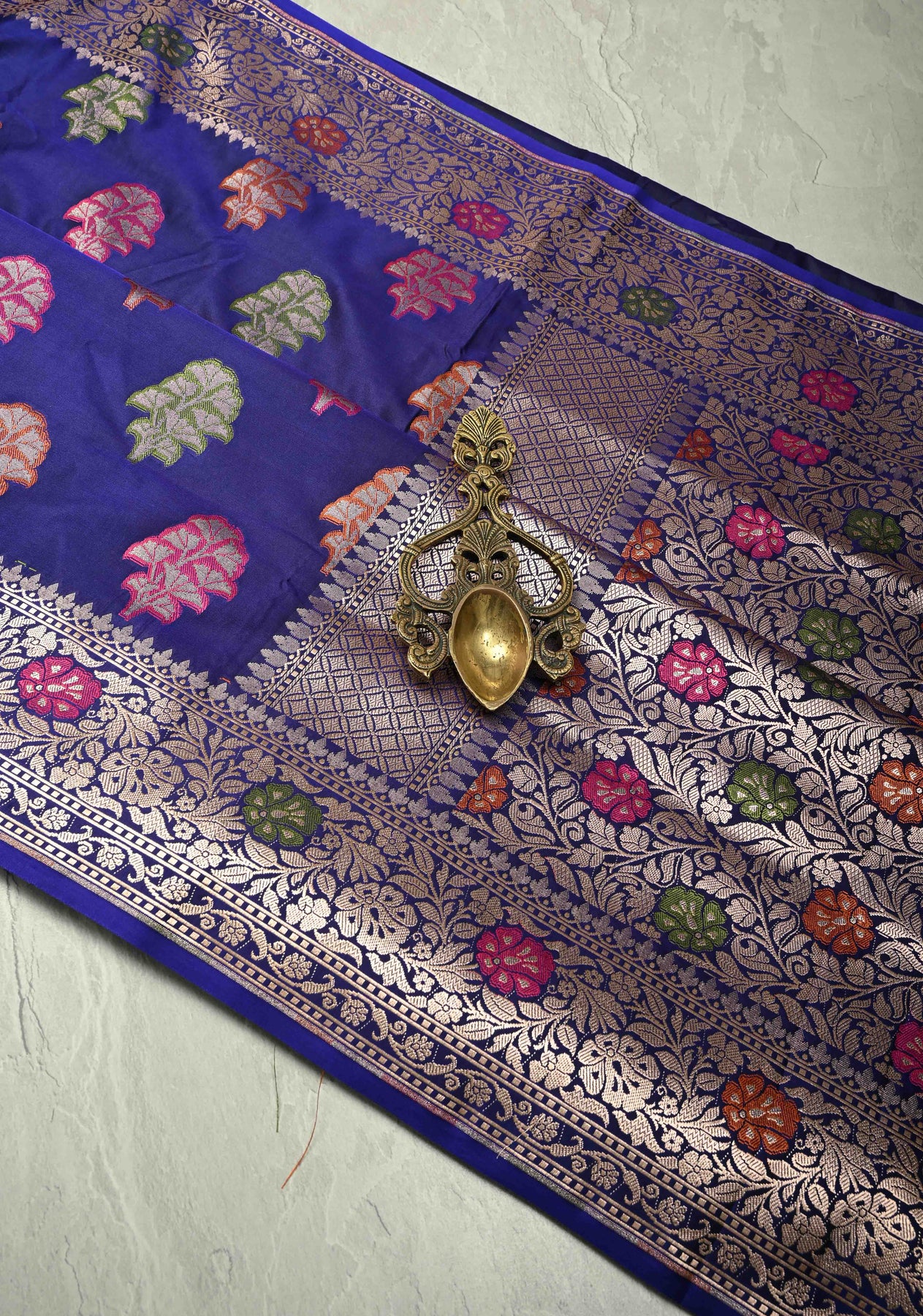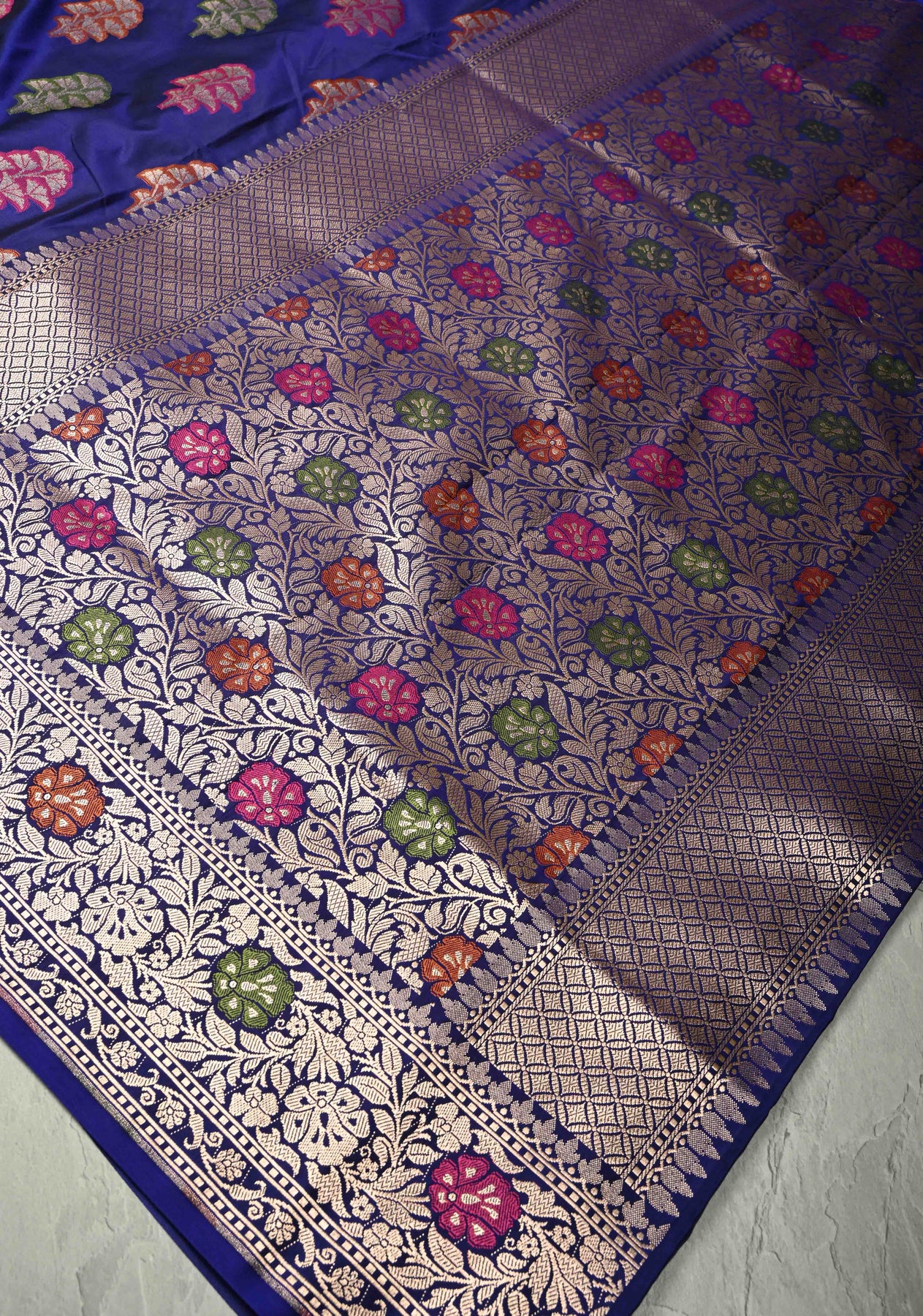 Delicate floral buttas are woven across the body, lending a graceful, timeless charm, while the zari border enhances the saree with its classic Banarasi opulence. The interplay of silk, zari, and Meenakari artistry makes this piece perfect for festive celebrations, weddings, and special occasions where tradition meets refined elegance
