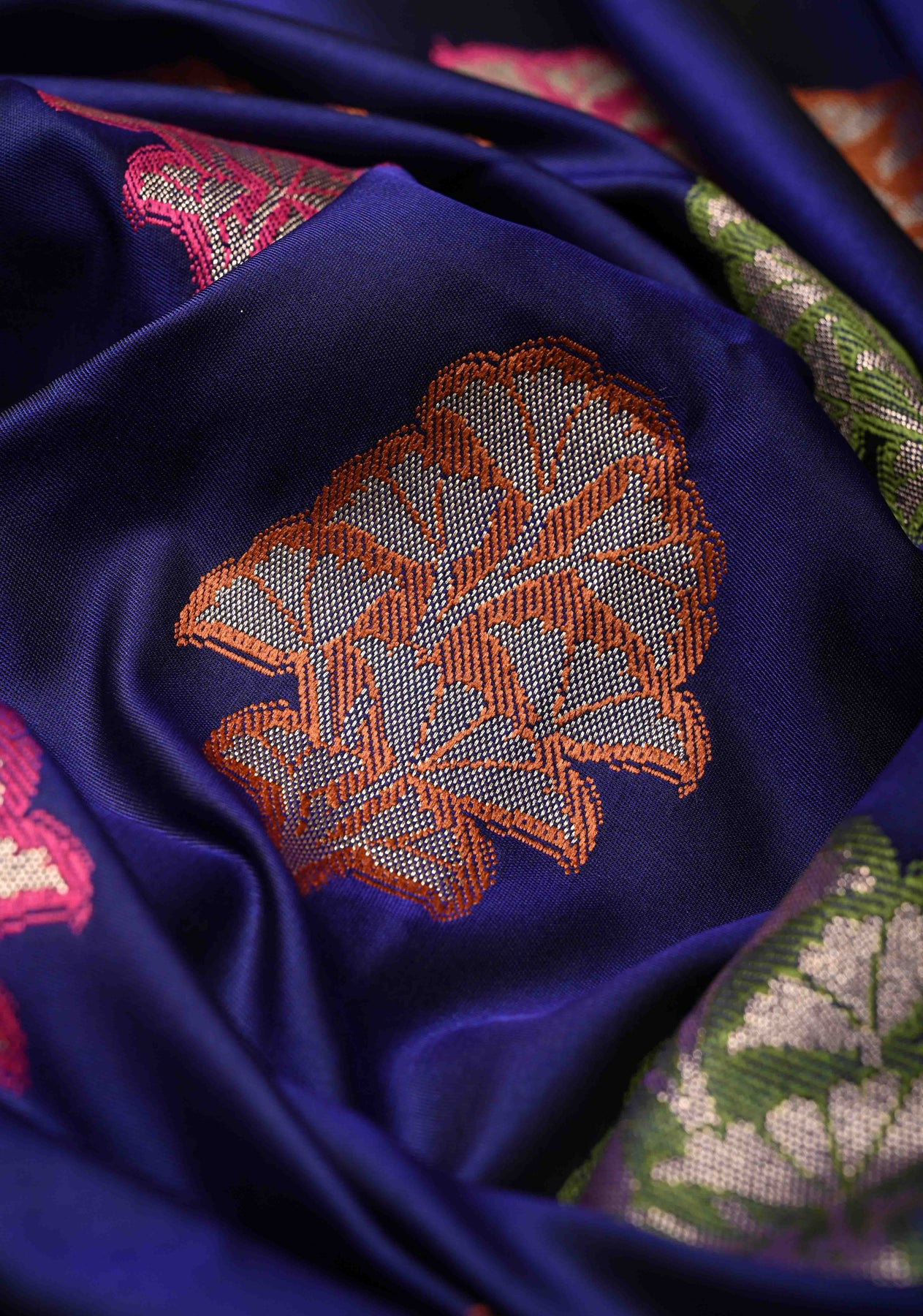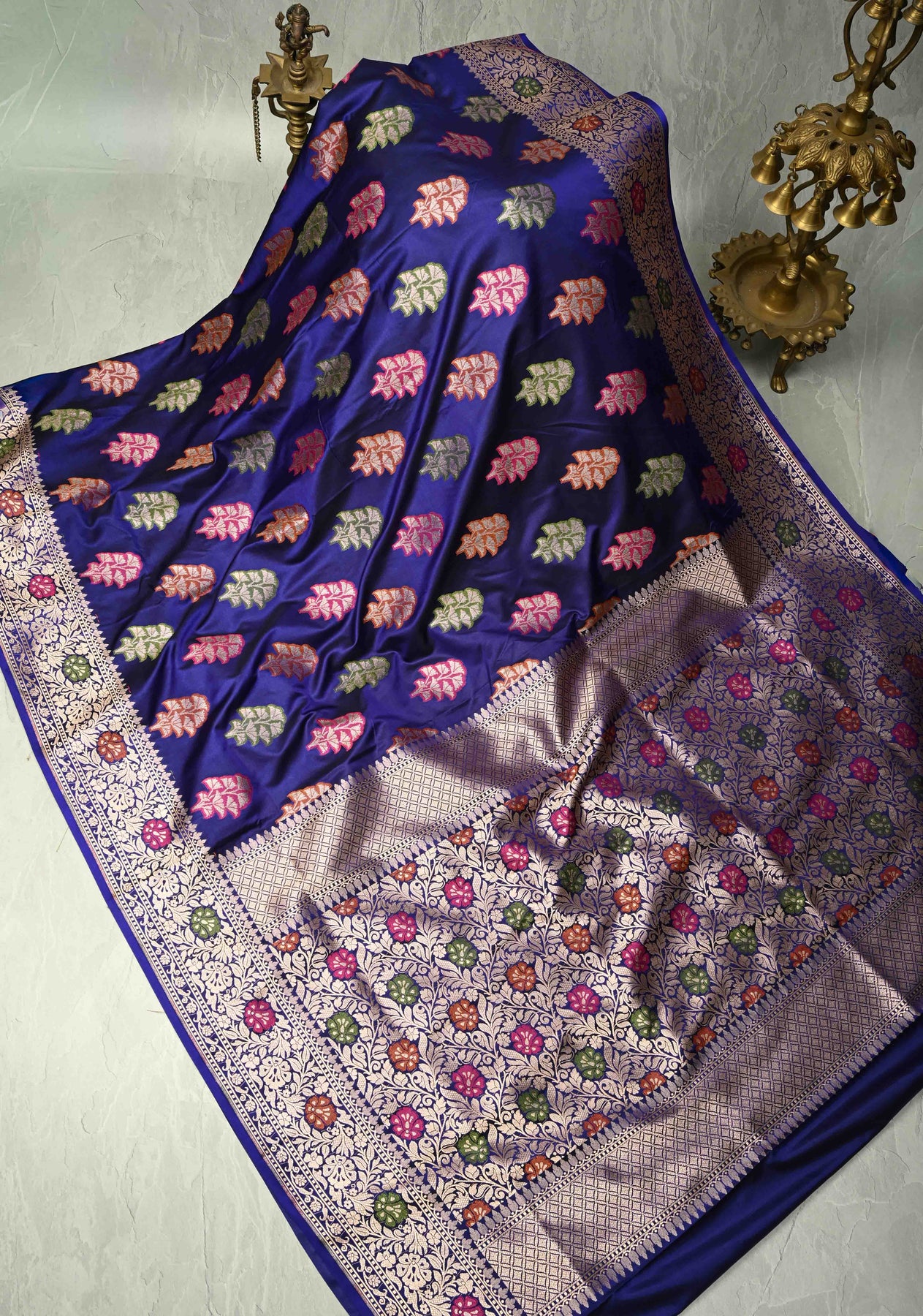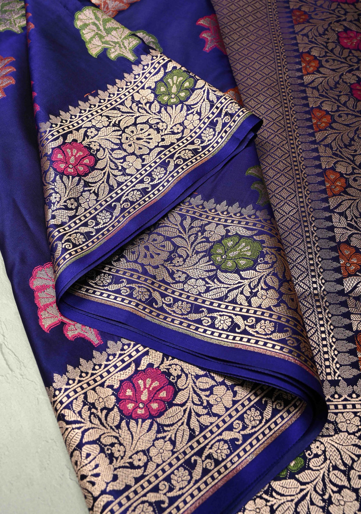 Delicate floral buttas are woven across the body, lending a graceful, timeless charm, while the zari border enhances the saree with its classic Banarasi opulence. The interplay of silk, zari, and Meenakari artistry makes this piece perfect for festive celebrations, weddings, and special occasions where tradition meets refined elegance