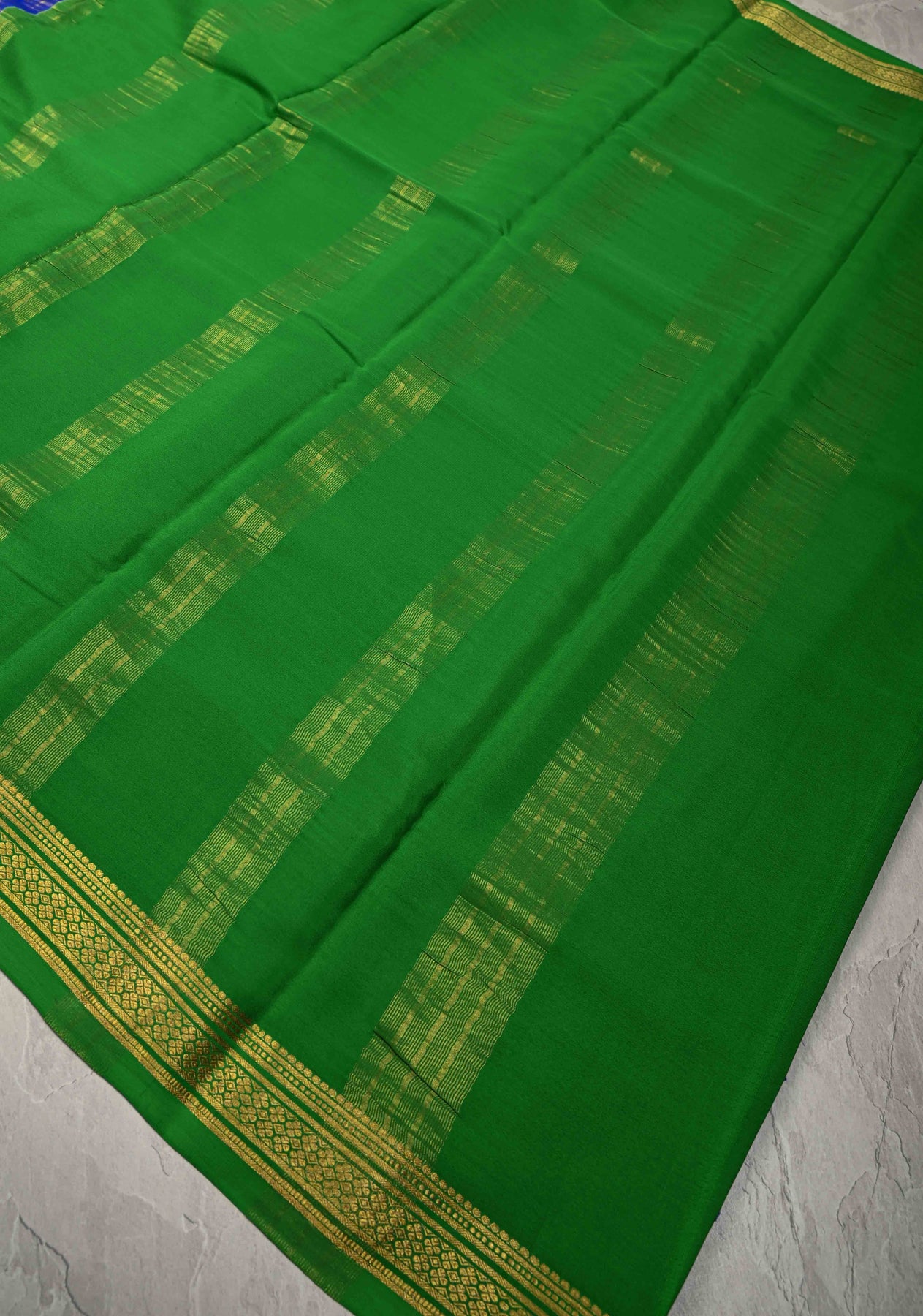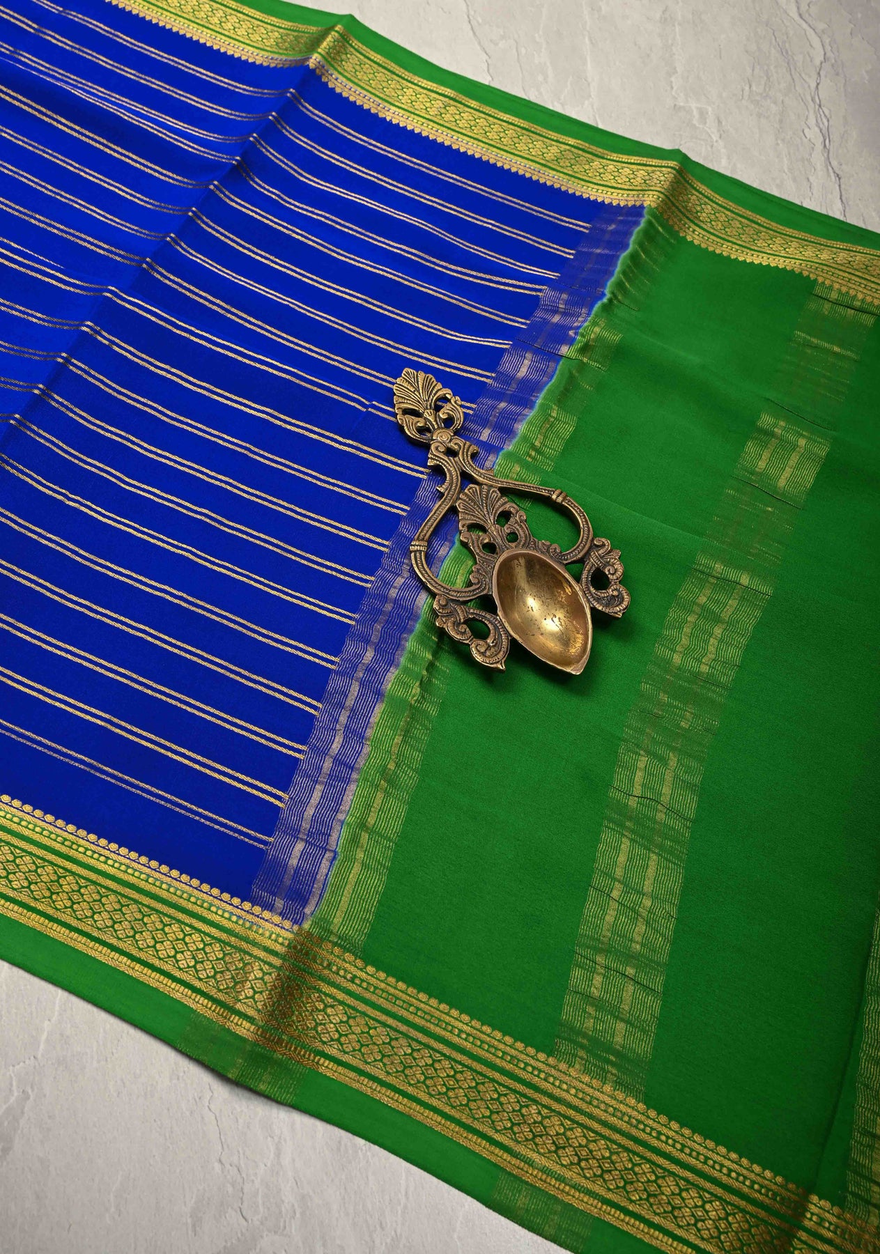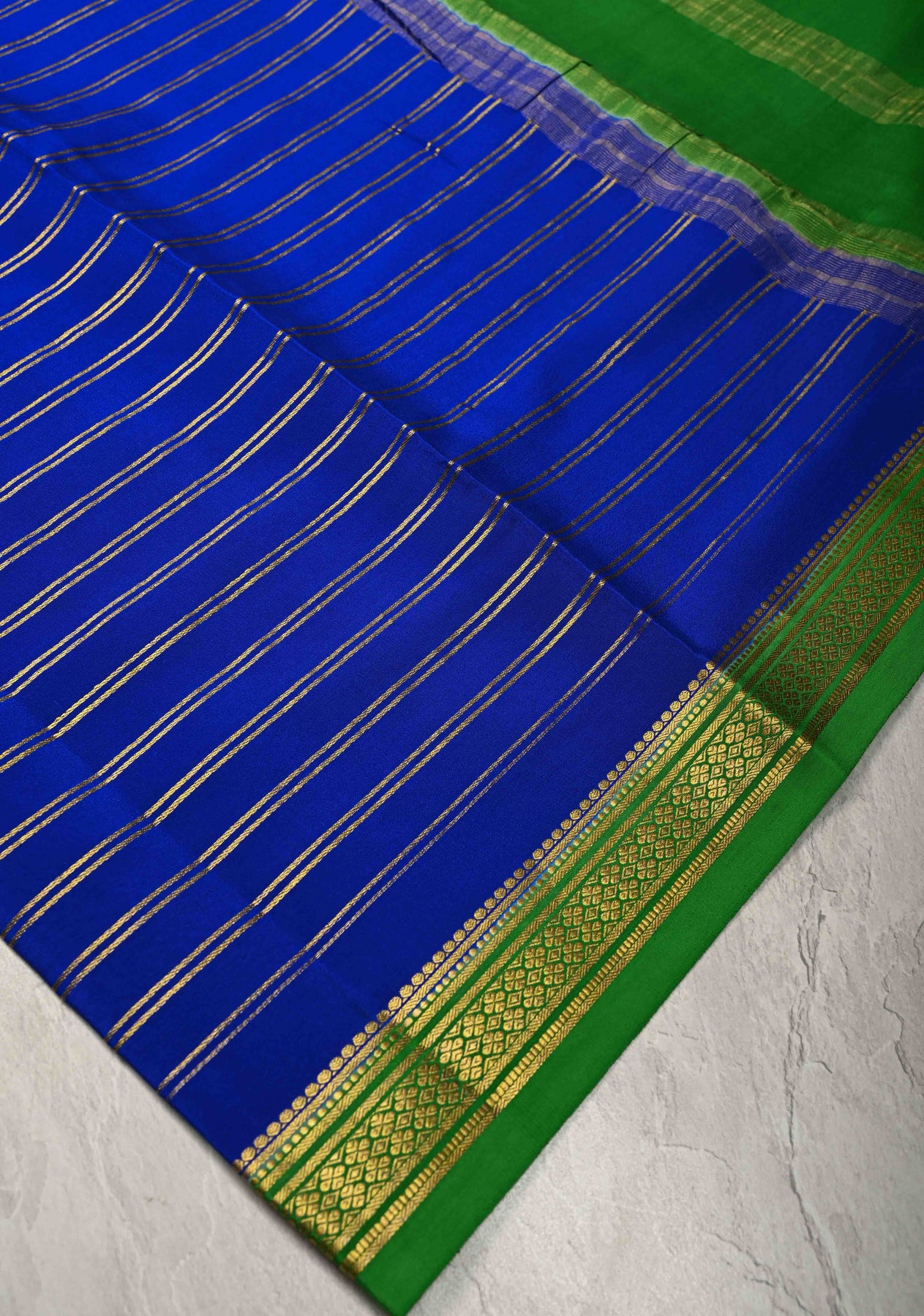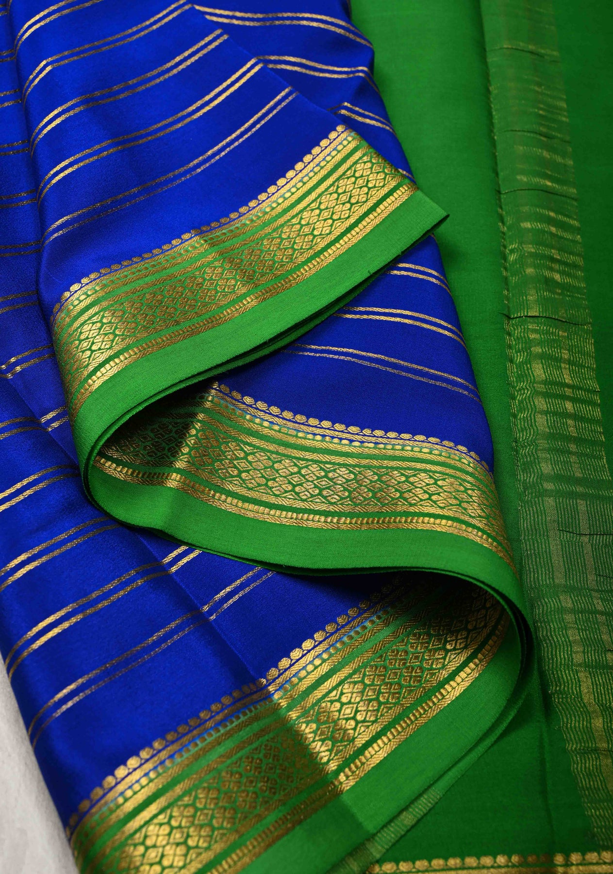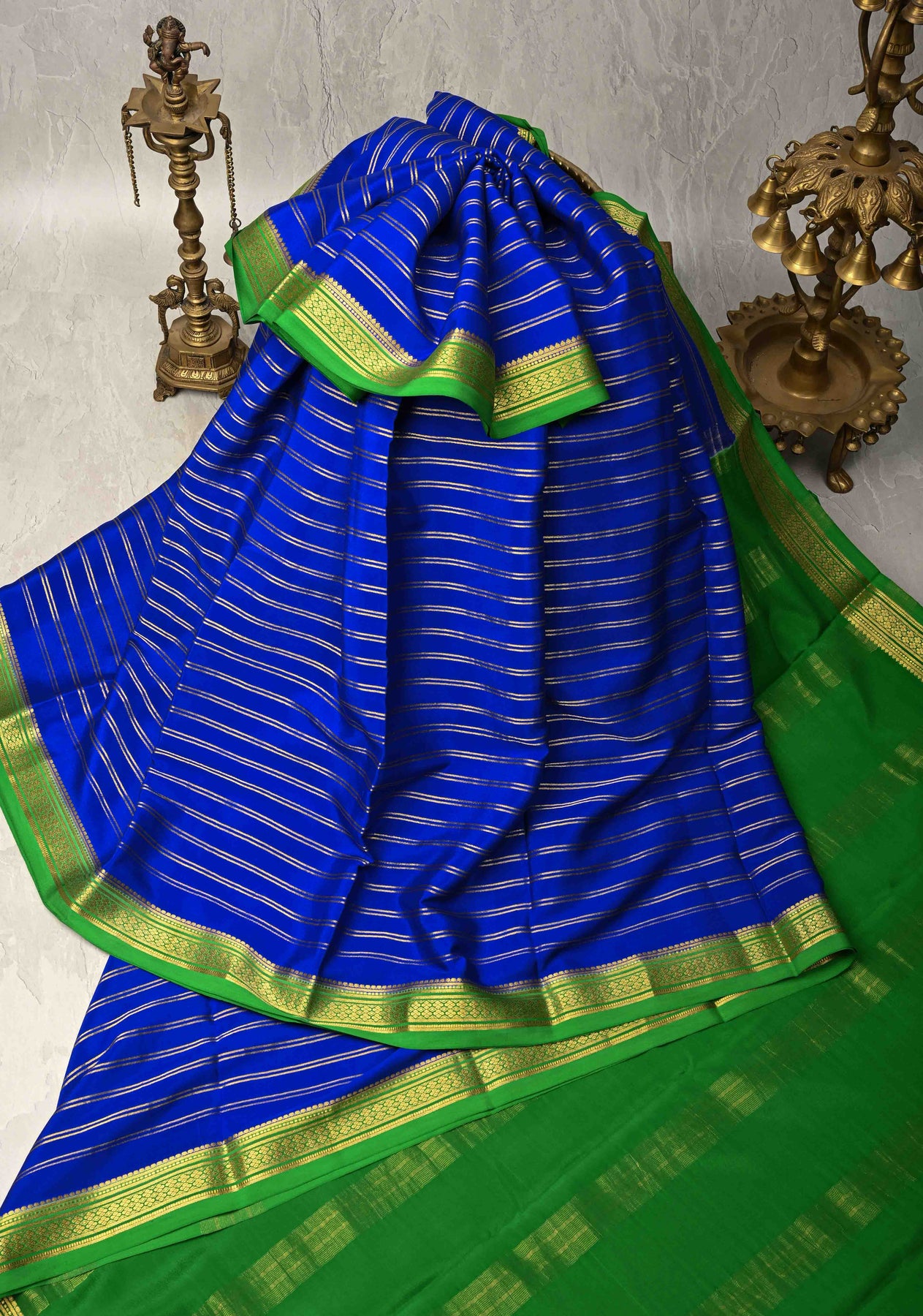 This stunning Royal Blue Mysore Silk Saree is a perfect blend of elegance and tradition. Woven from pure silk, it features subtle horizontal zari stripes across the body, adding a touch of shimmer and texture without overpowering the hue. The saree is elevated by contrast zari borders, which frame the piece with a refined, festive charm. Lightweight and graceful in drape, it’s ideal for special occasions, celebrations, and formal gatherings. With its royal tone and timeless detailing, this saree is a beautiful representation of Mysore’s silk weaving heritage.