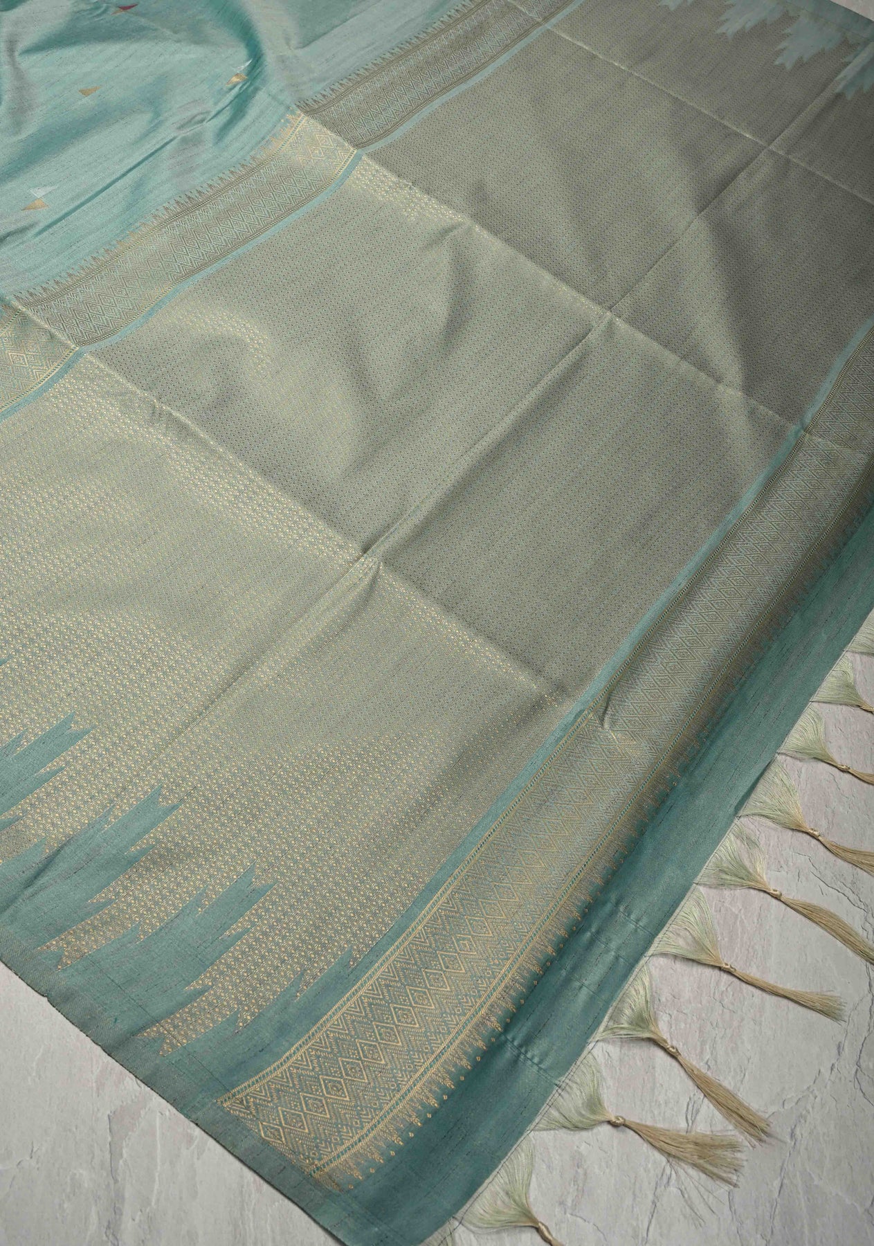 The soothing sage green body is intricately adorned with vibrant Meenakari buttas, adding delicate pops of color that elevate the understated base. Framed with a striking multicolor temple border, inspired by classical South Indian temple motifs, this saree brings a beautiful contrast and a timeless ethnic charm.